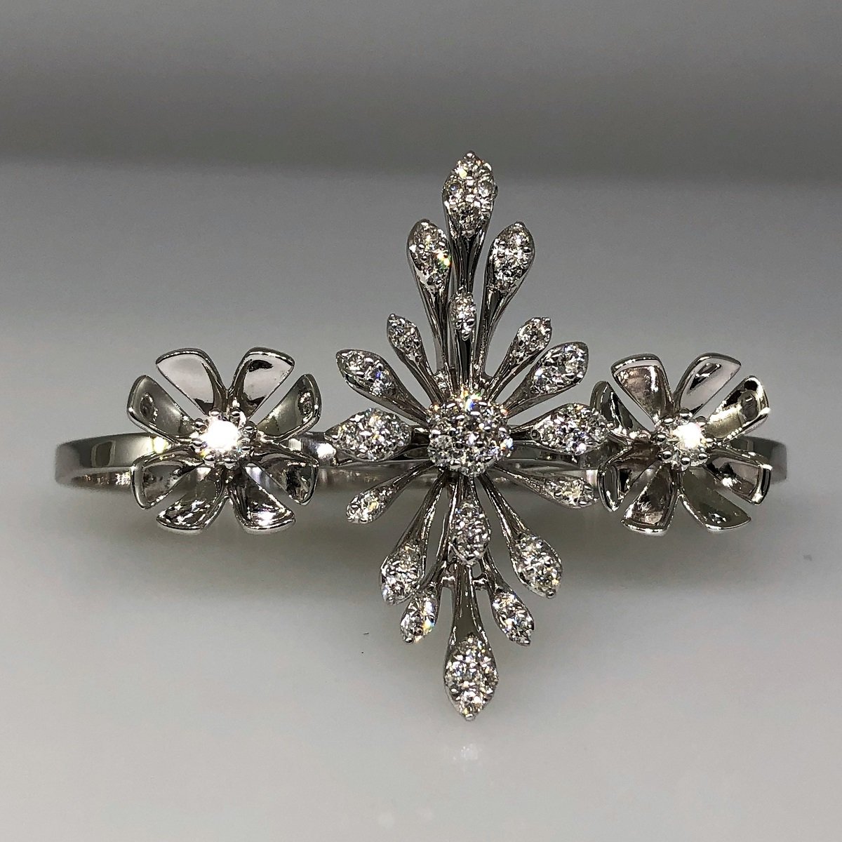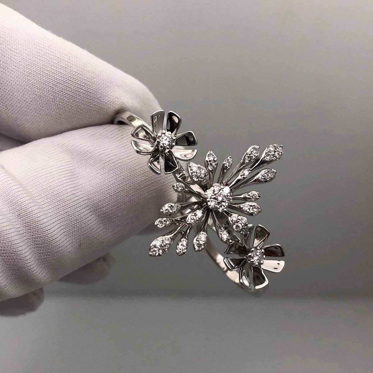 This custom two finger design is delicate and dainty – a perfect expression of style! Diamonds form a floral design that sparkles just so.