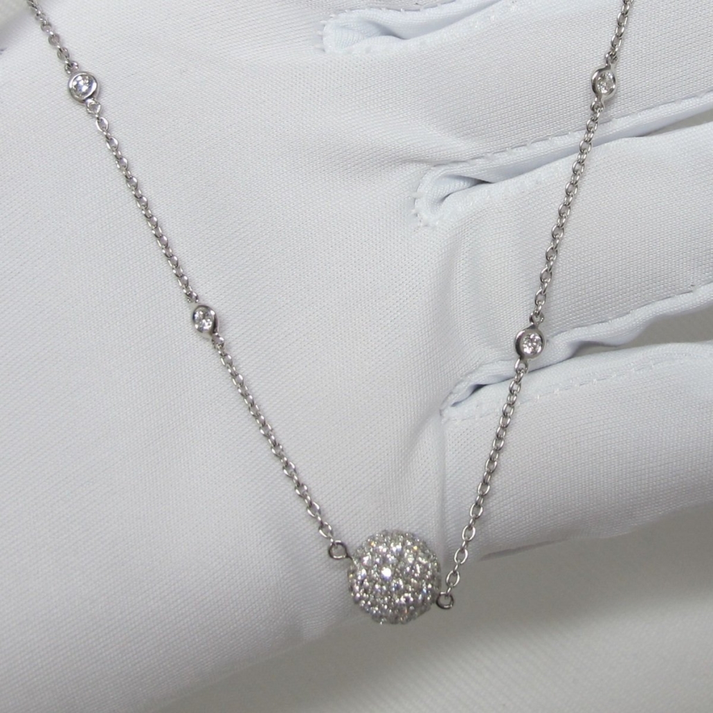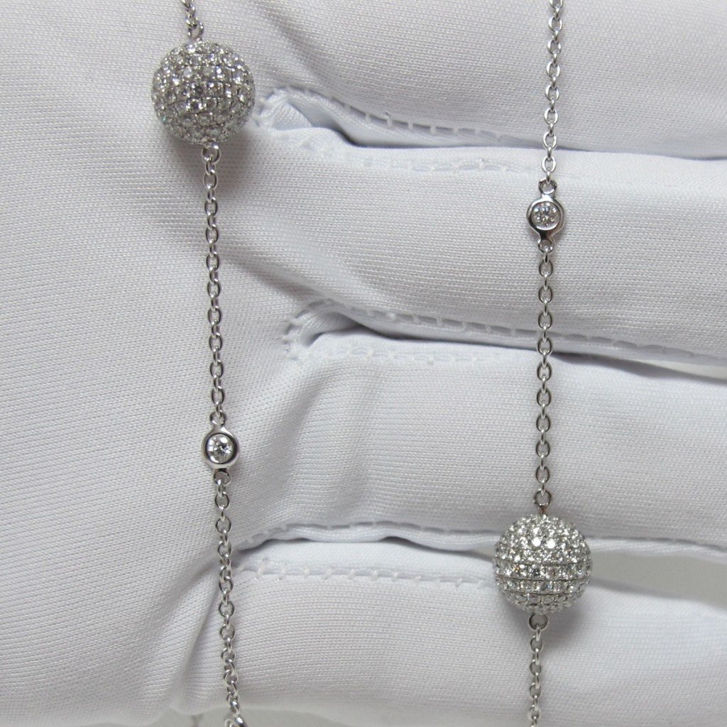 This necklace is 18k white gold and weigh 38 grams. It is thirty six inches long. And has nine diamond balls. The balls are encrusted with 3 carats of diamonds each.