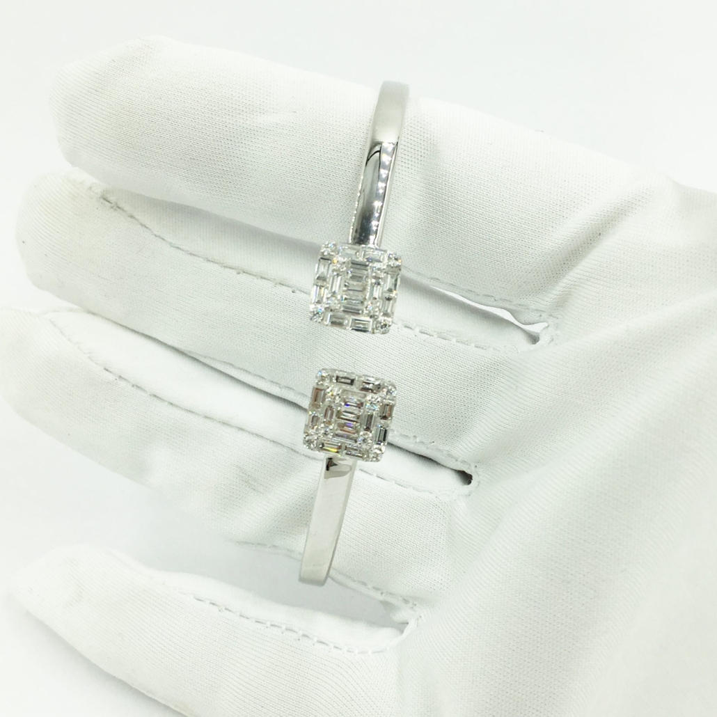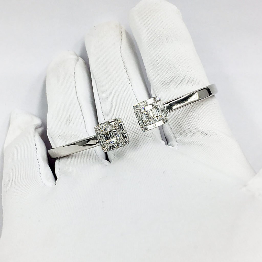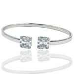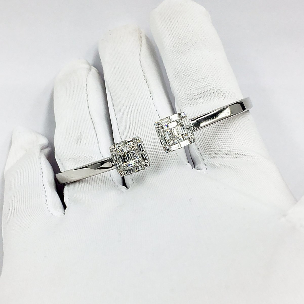 This 18k white gold bracelet is a flexible cuff that opens on the top.
