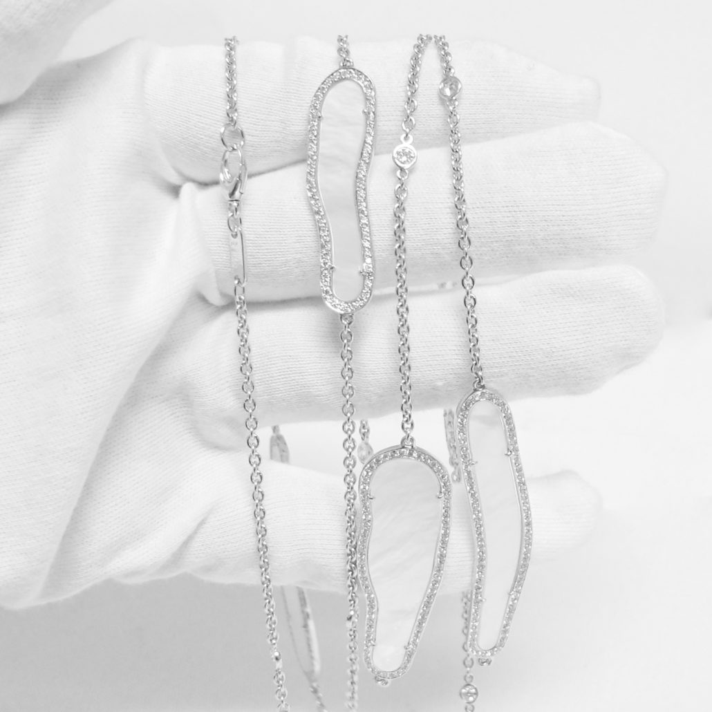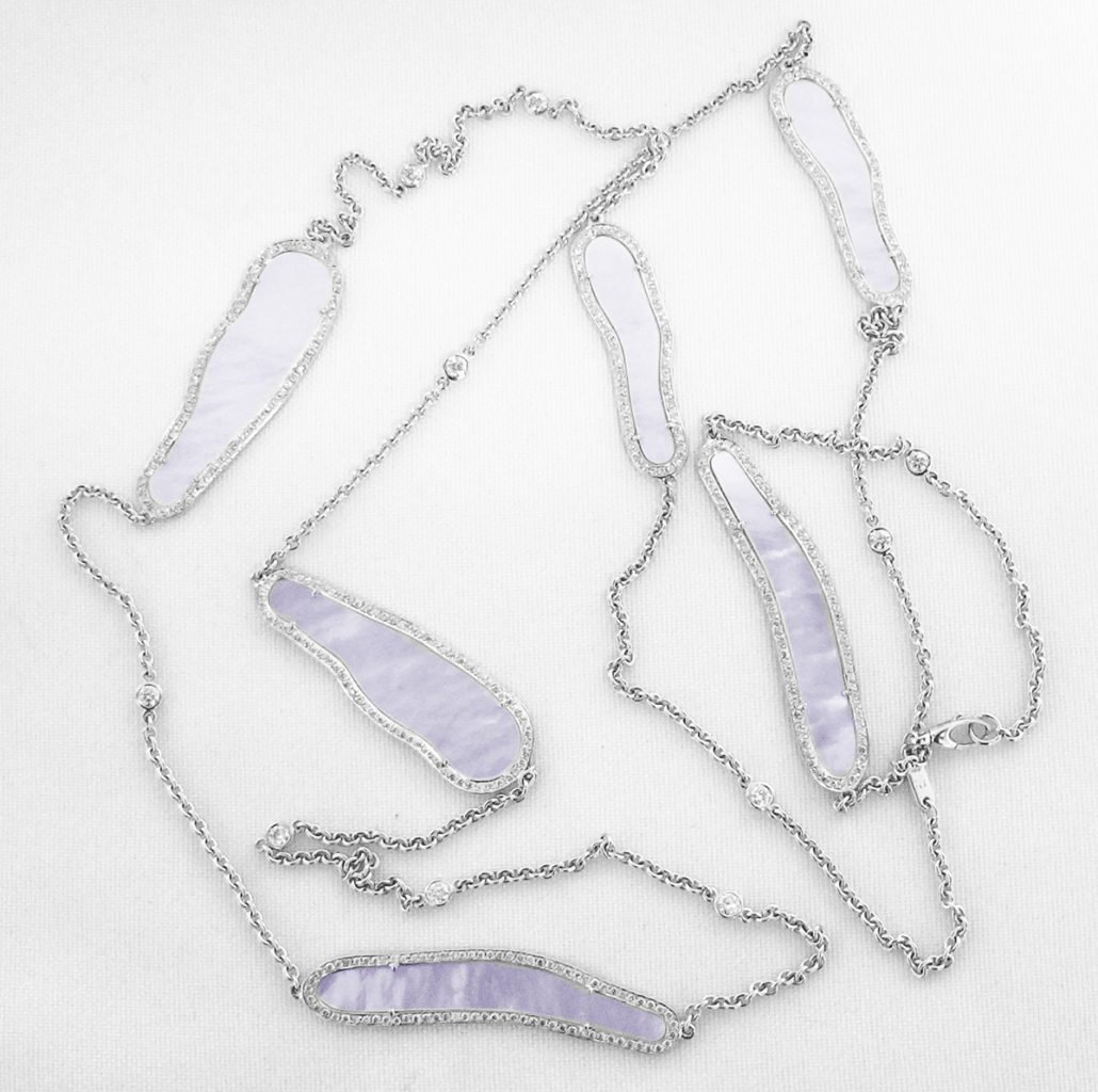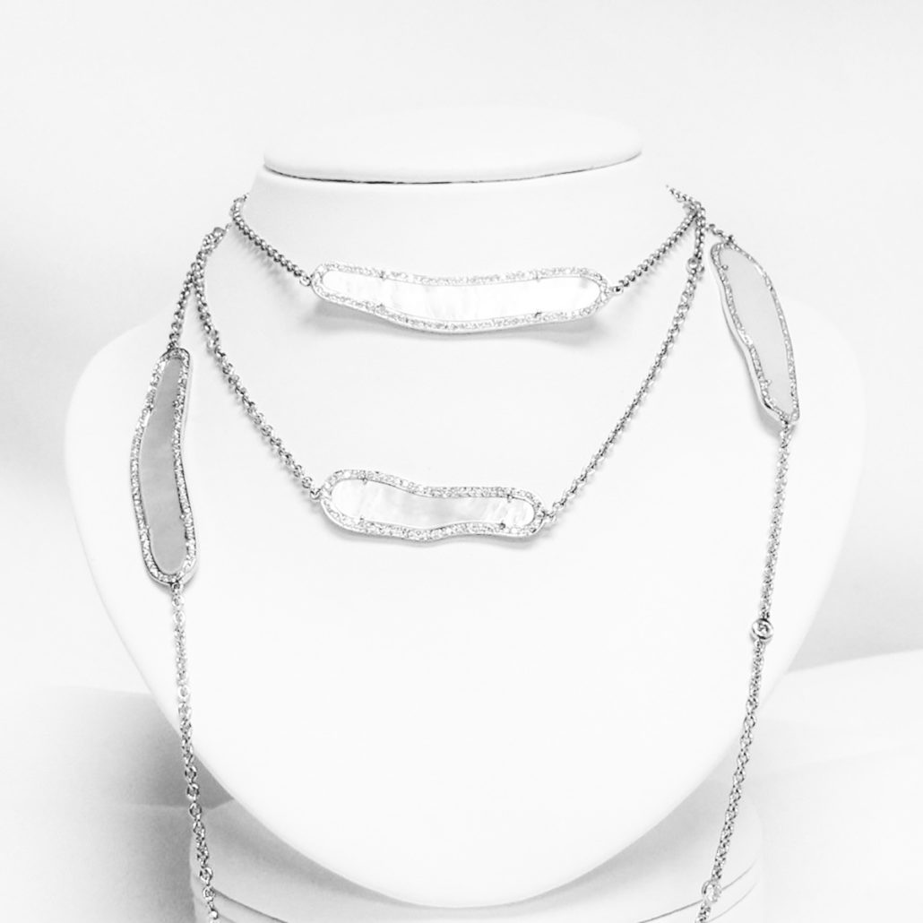 Six abstract pieces of mother of pearl are positioned evenly on a 1.75 mm cable link chain measuring 48″. Each mother of pearl piece is a unique oblong shape, and has diamond encrusted edges.