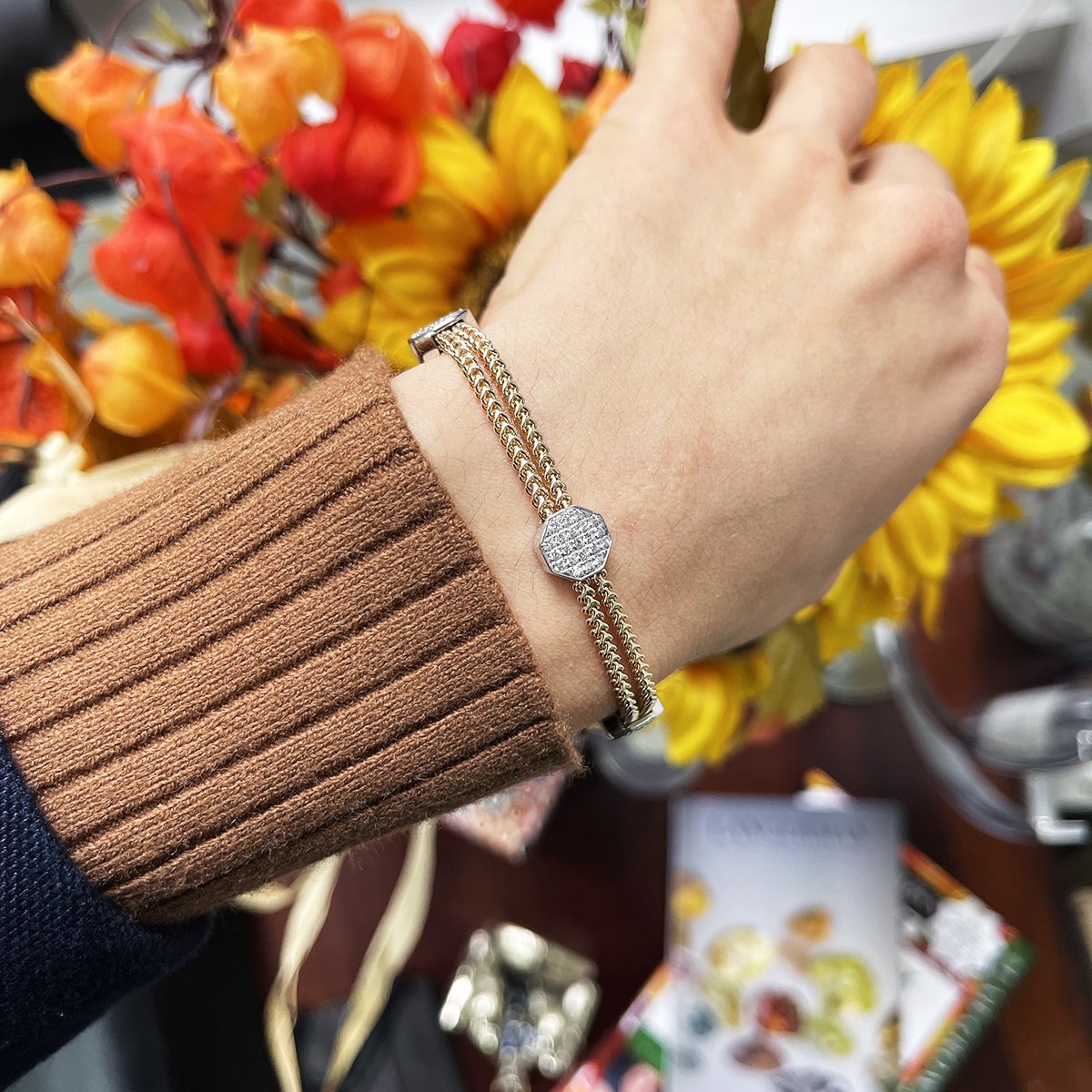 Four diamond hexagons are evenly spaced around this 14K Yellow Gold bracelet. Each hexagon is made of 21 diamonds.