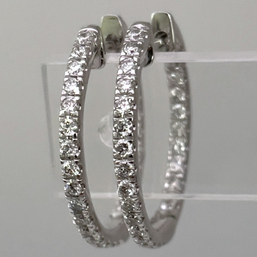These diamond round hoop earrings are made with 14k white gold and four prong set diamonds.