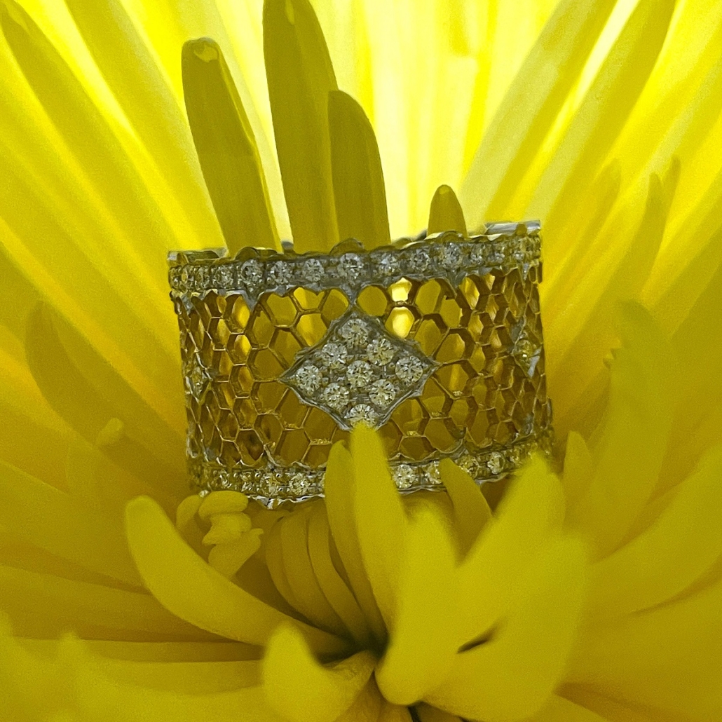 This ring is made of 18k yellow and white with honeycomb design in yellow gold and the outer edges are diamond encrusted in white gold ribbon shaped design. Center is cluster of diamonds set in shared prongs.
