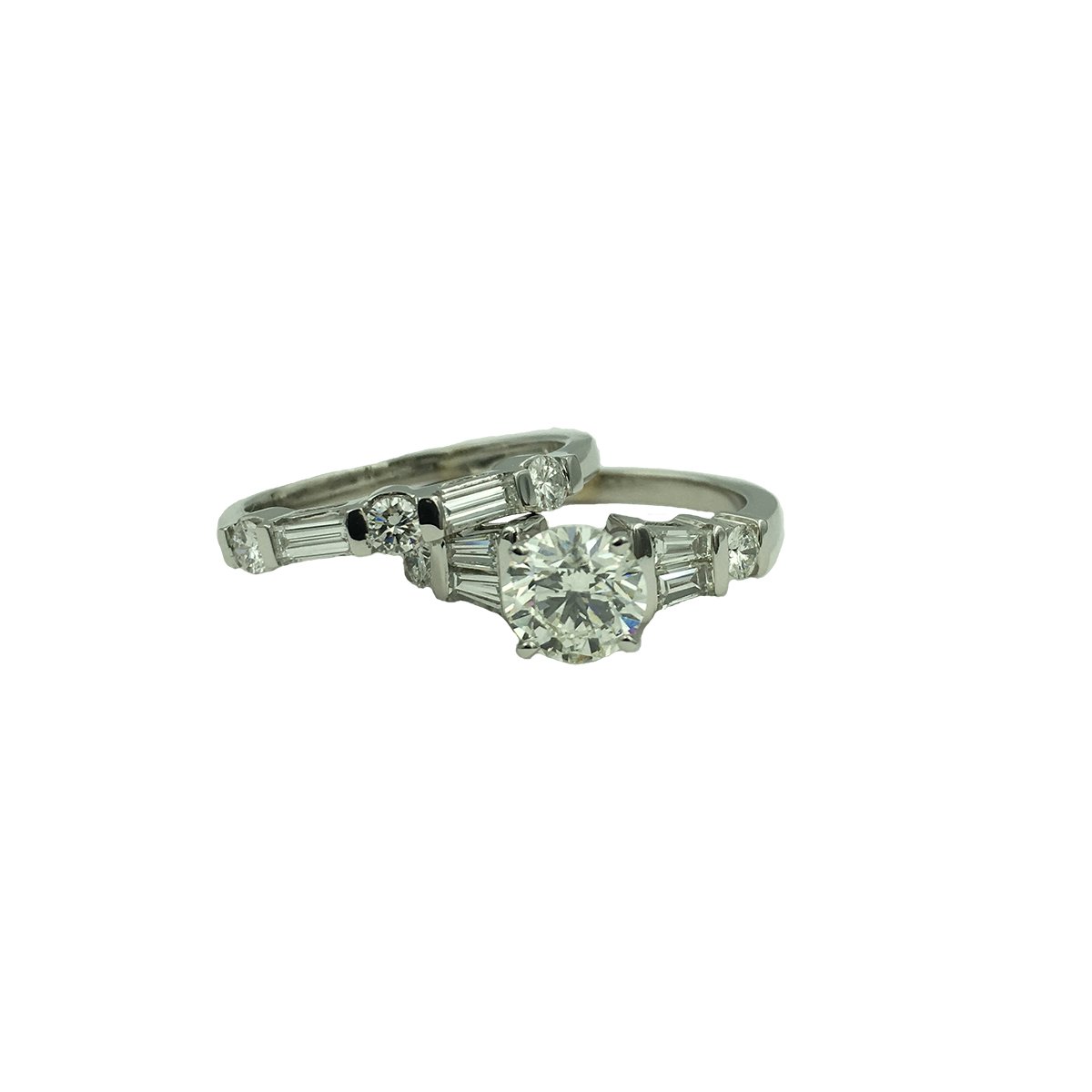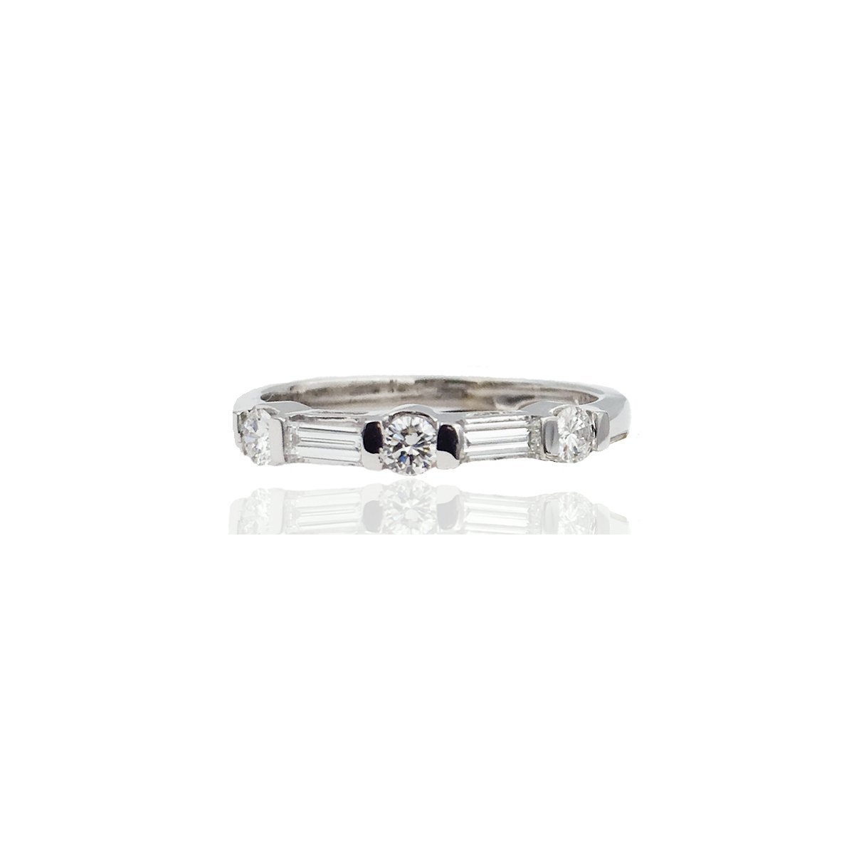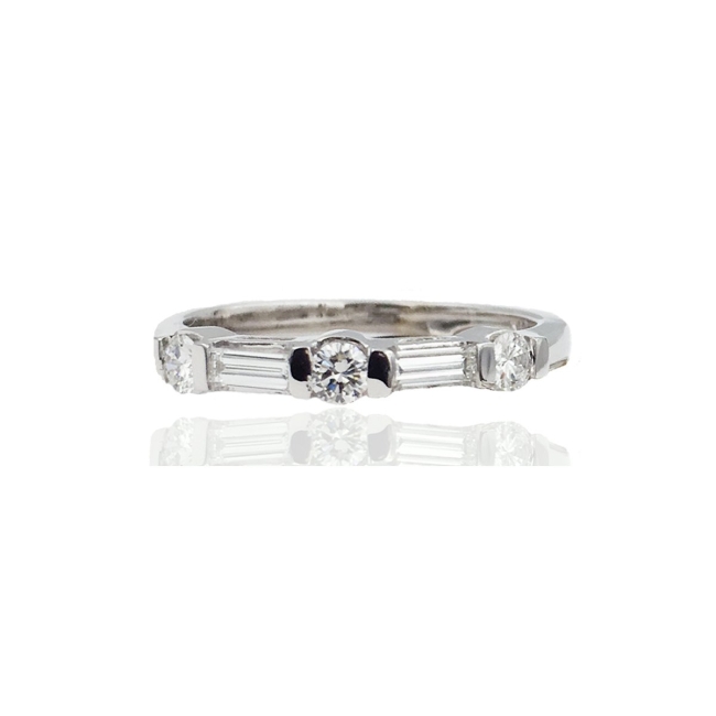 This diamond wedding band exhibits three round and two baguette cut diamonds set in 14k white gold.   See ‘Tesorino’, the matching engagement ring in this Bridal Set.