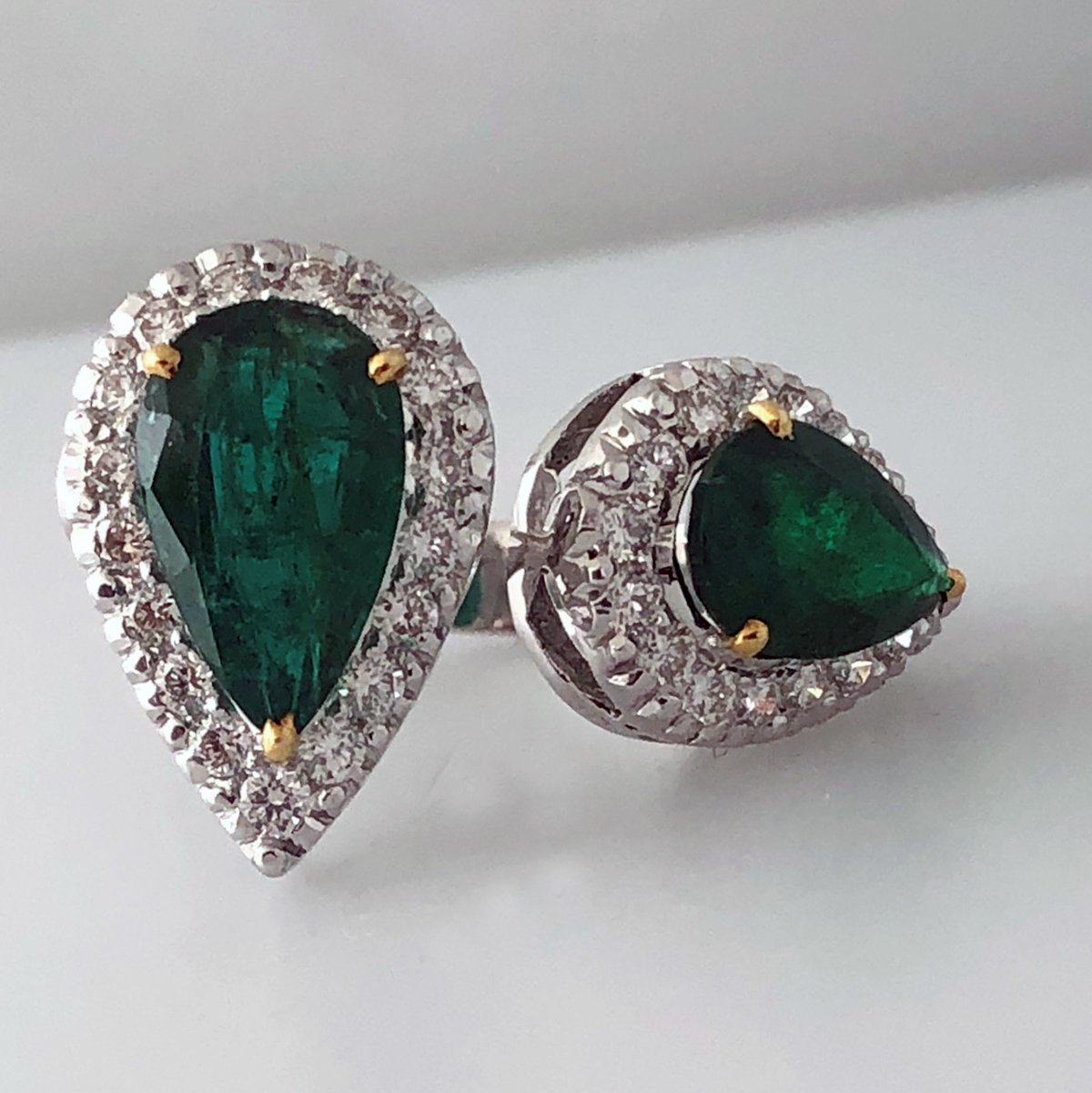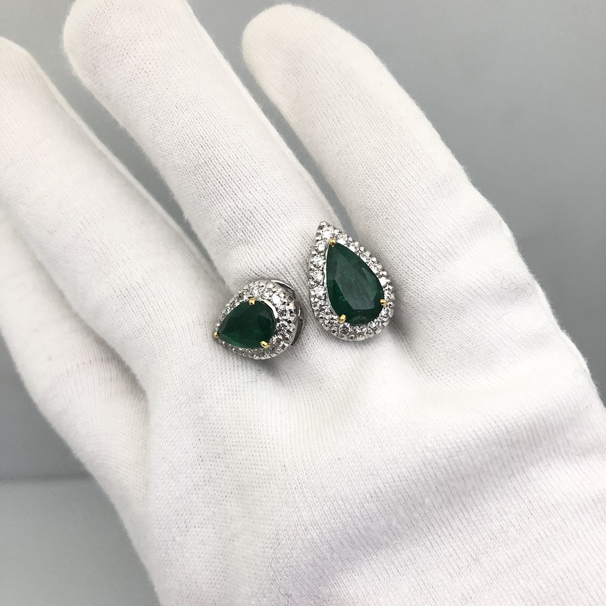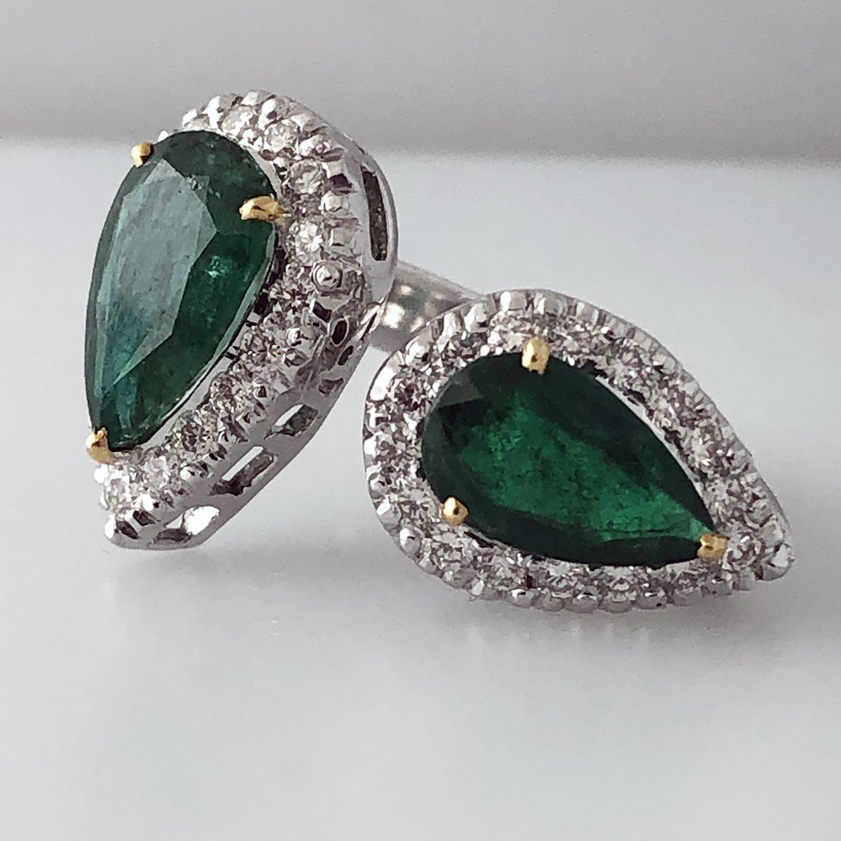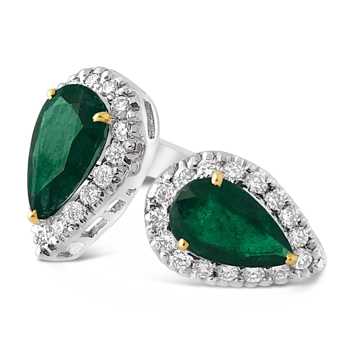 Two pear shaped emeralds are surrounded by diamond halos. Yellow gold prongs add a subtle detail amidst the diamond and white gold.