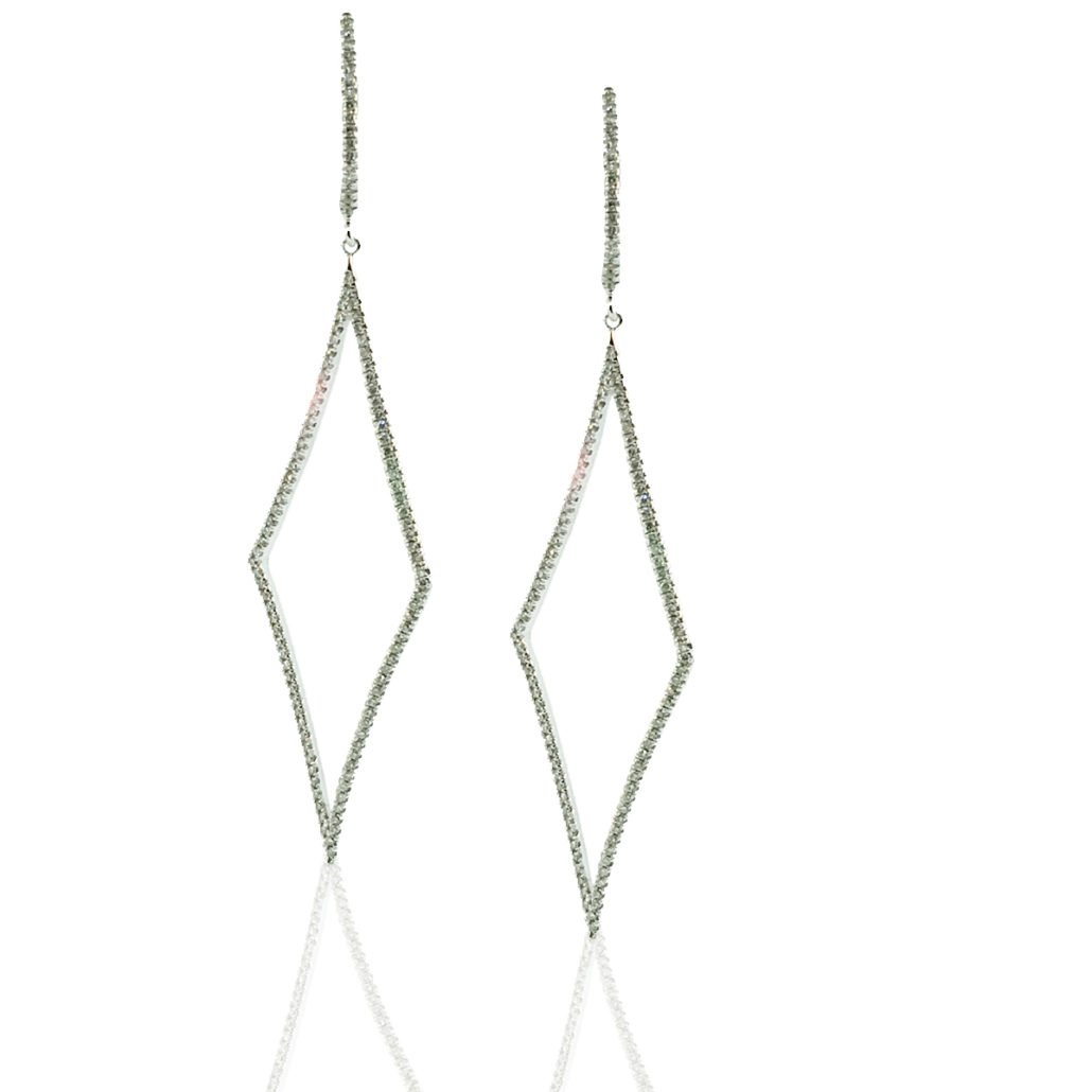 These 14K white gold earrings are approximately 2 inches long and .75 inches wide. Each earring is secured at the top with a diamond encrusted lever back. A delicate diamond encrusted diamond shape dangles from the leverback.