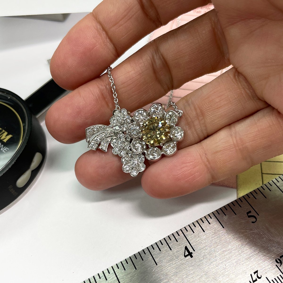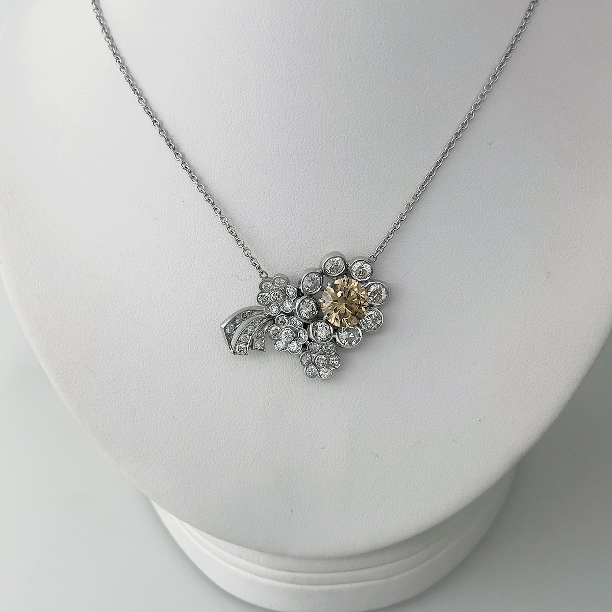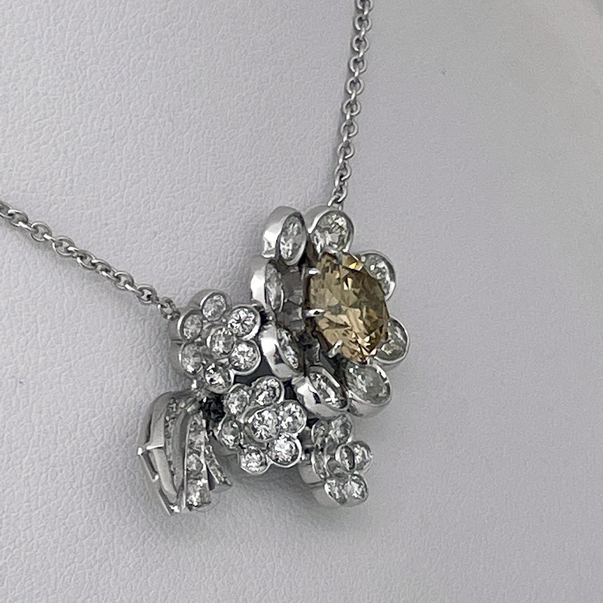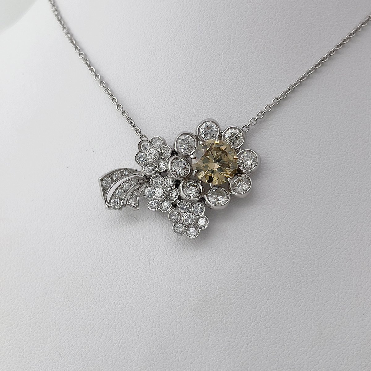 Tags Custom Flower Pendant, Custom Necklace, Fancy Colored Diamond, Fancy Yellow Diamond, Flower, GIA Certified Fancy Colored Diamond, Platinum Setting