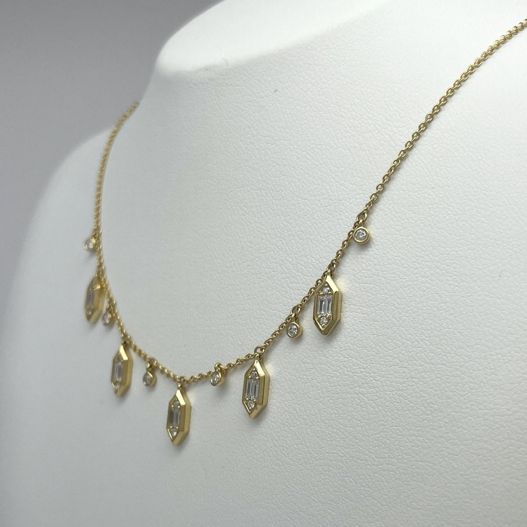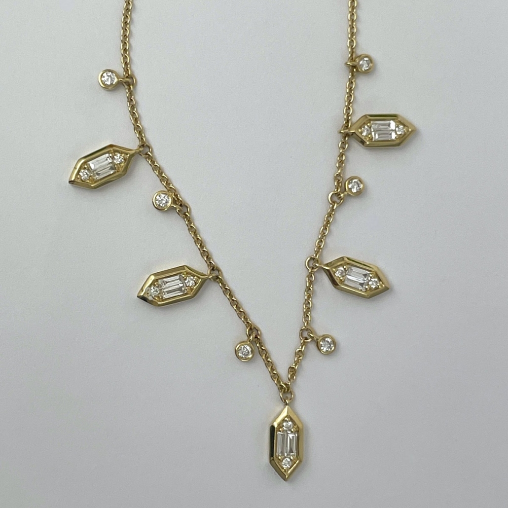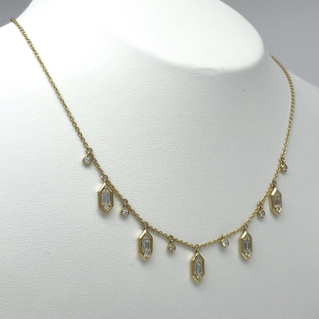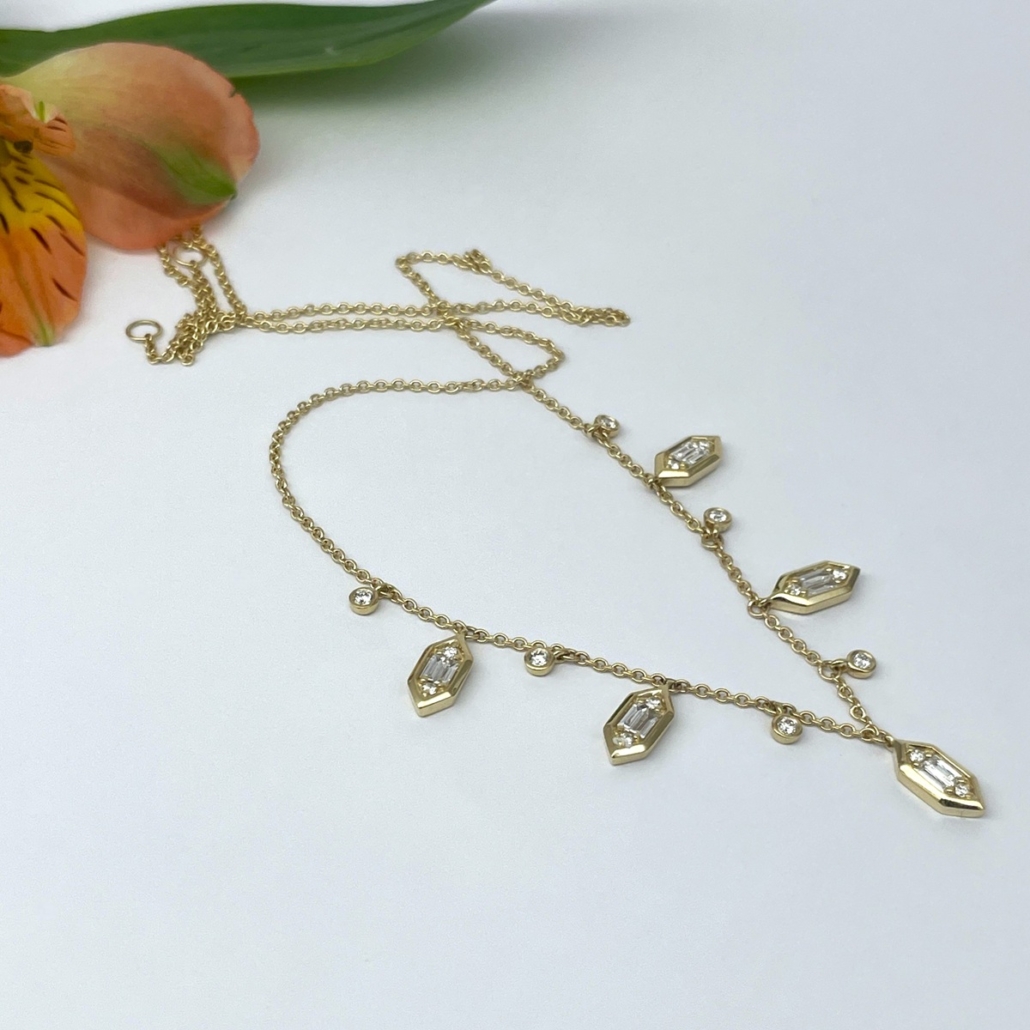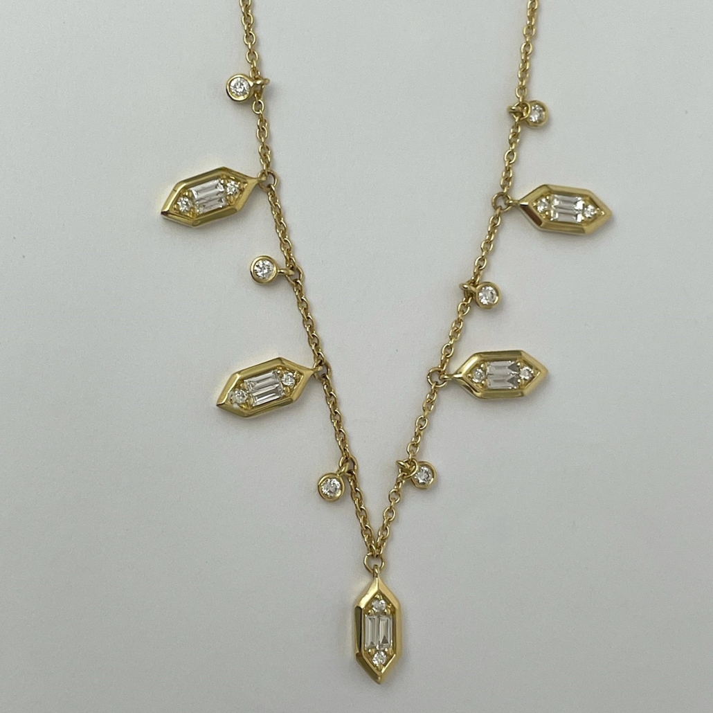 This 14k yellow gold necklace has bezel set round brilliant diamonds and cluster of baguette with round brilliant diamonds dangling below the chain.