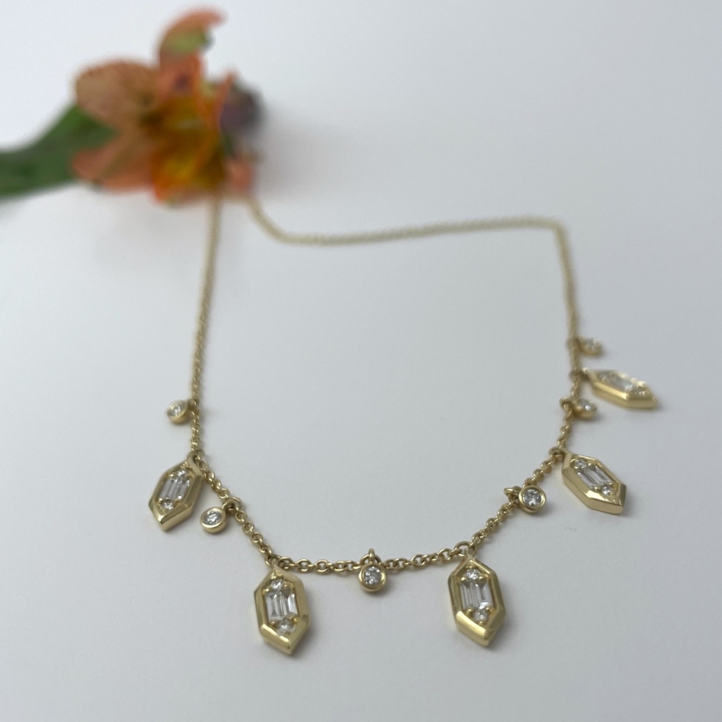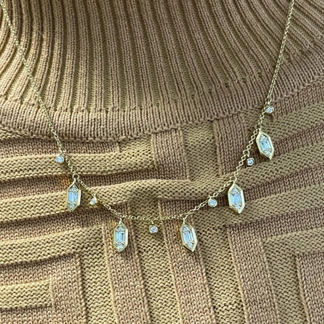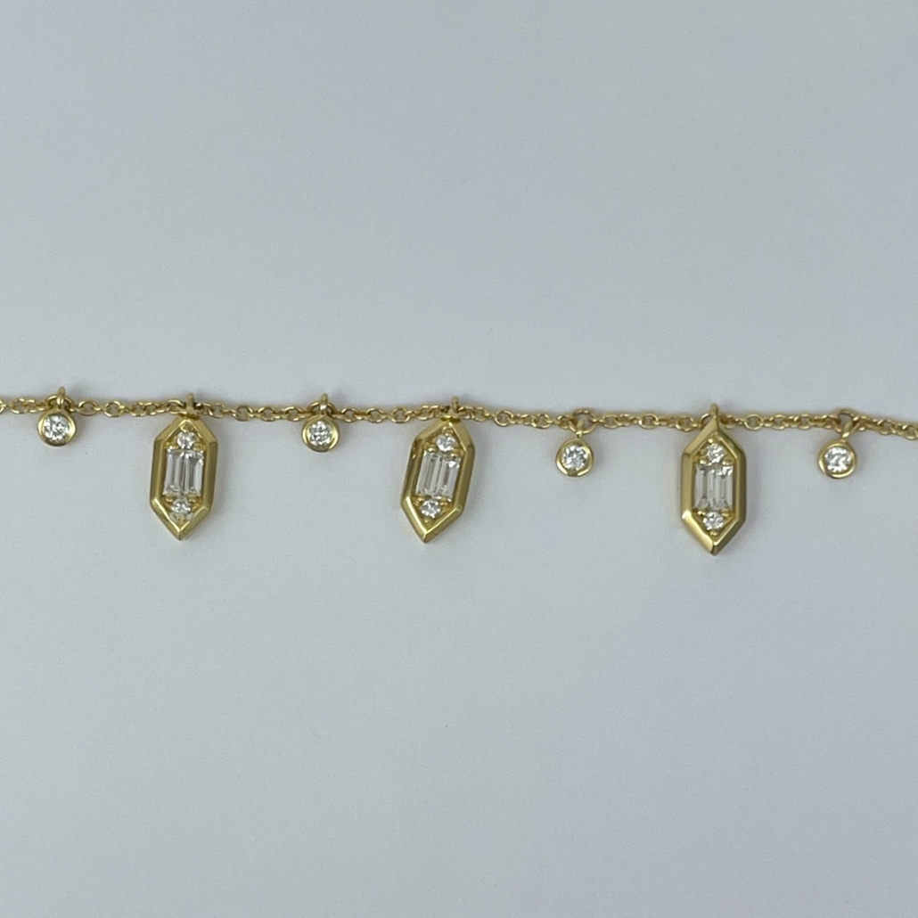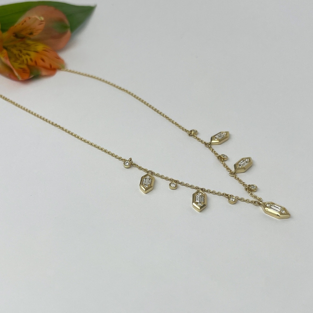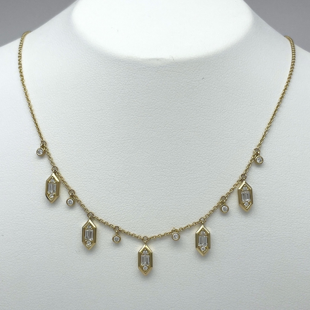 This 14k yellow gold necklace has bezel set round brilliant diamonds and cluster of baguette with round brilliant diamonds dangling below the chain.
