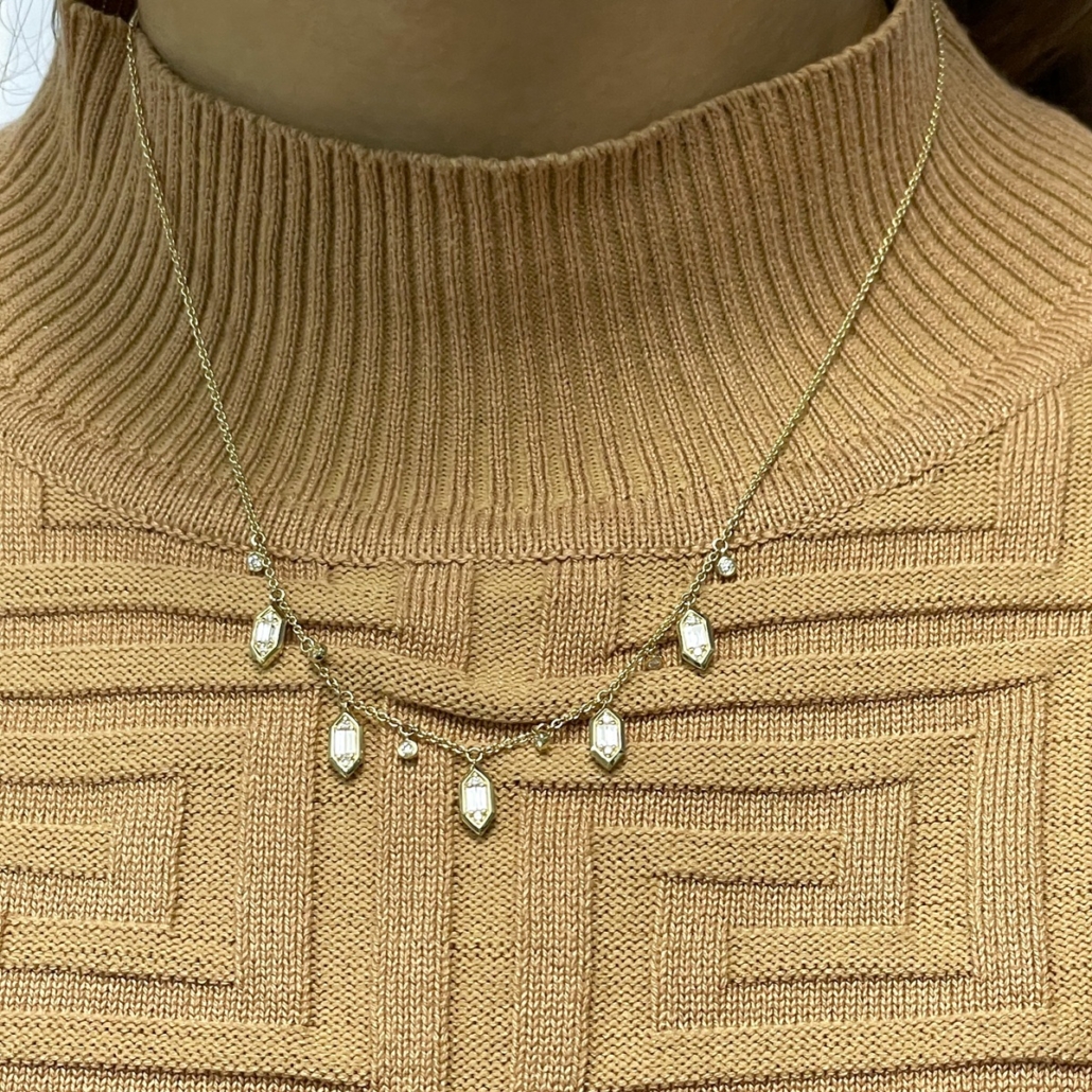 Tags 14k Yellow, baguette, bezel, Dangle, Diamond, Necklace, Shared Prongs