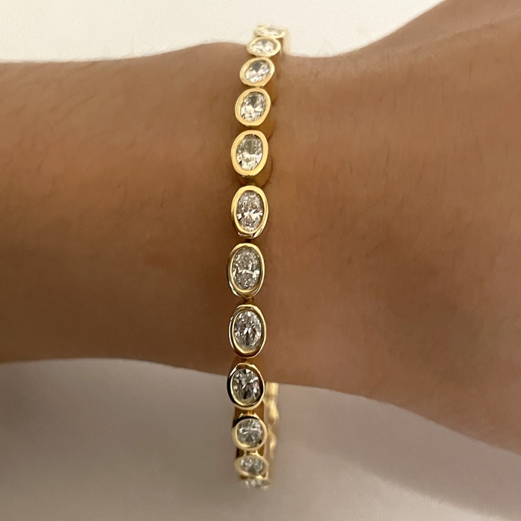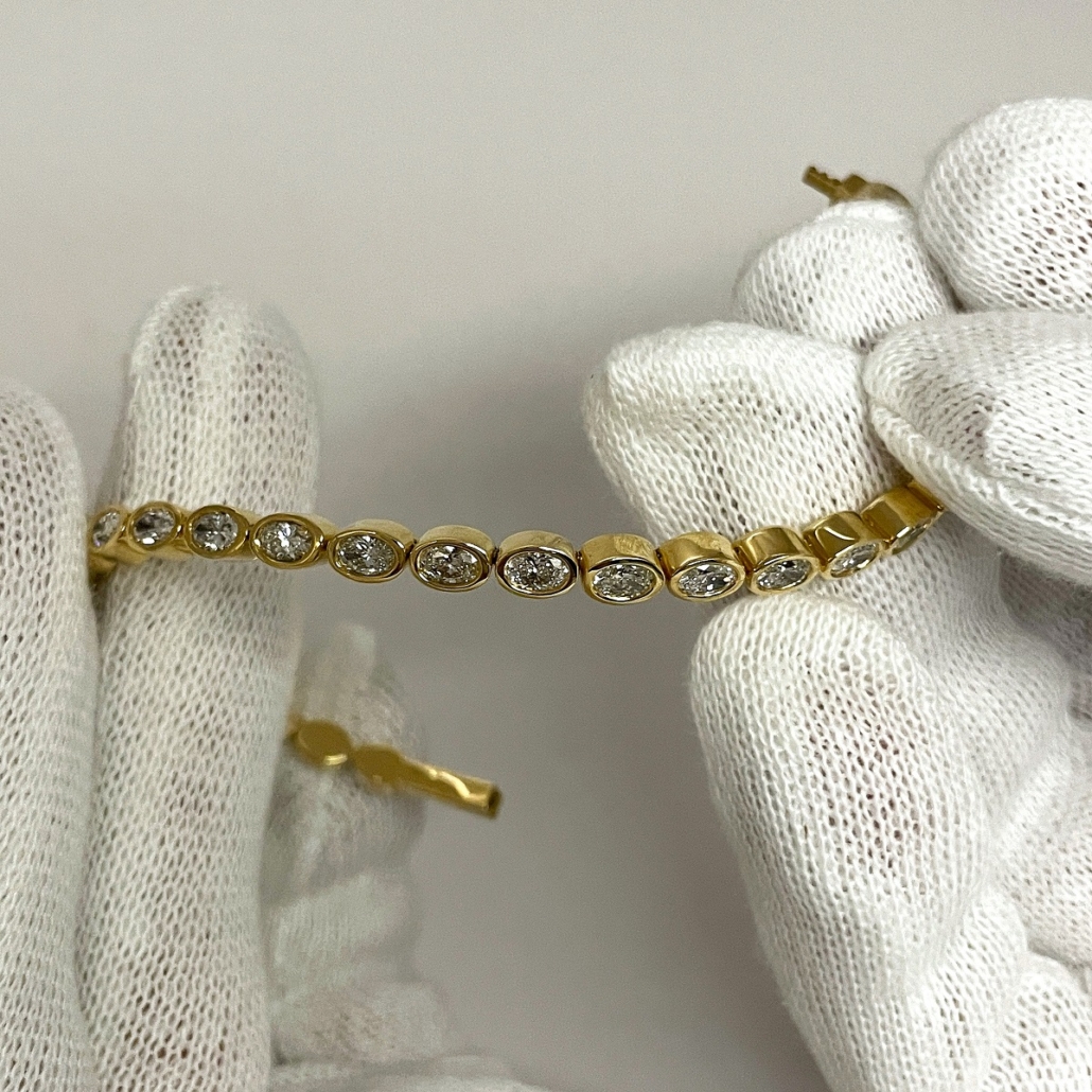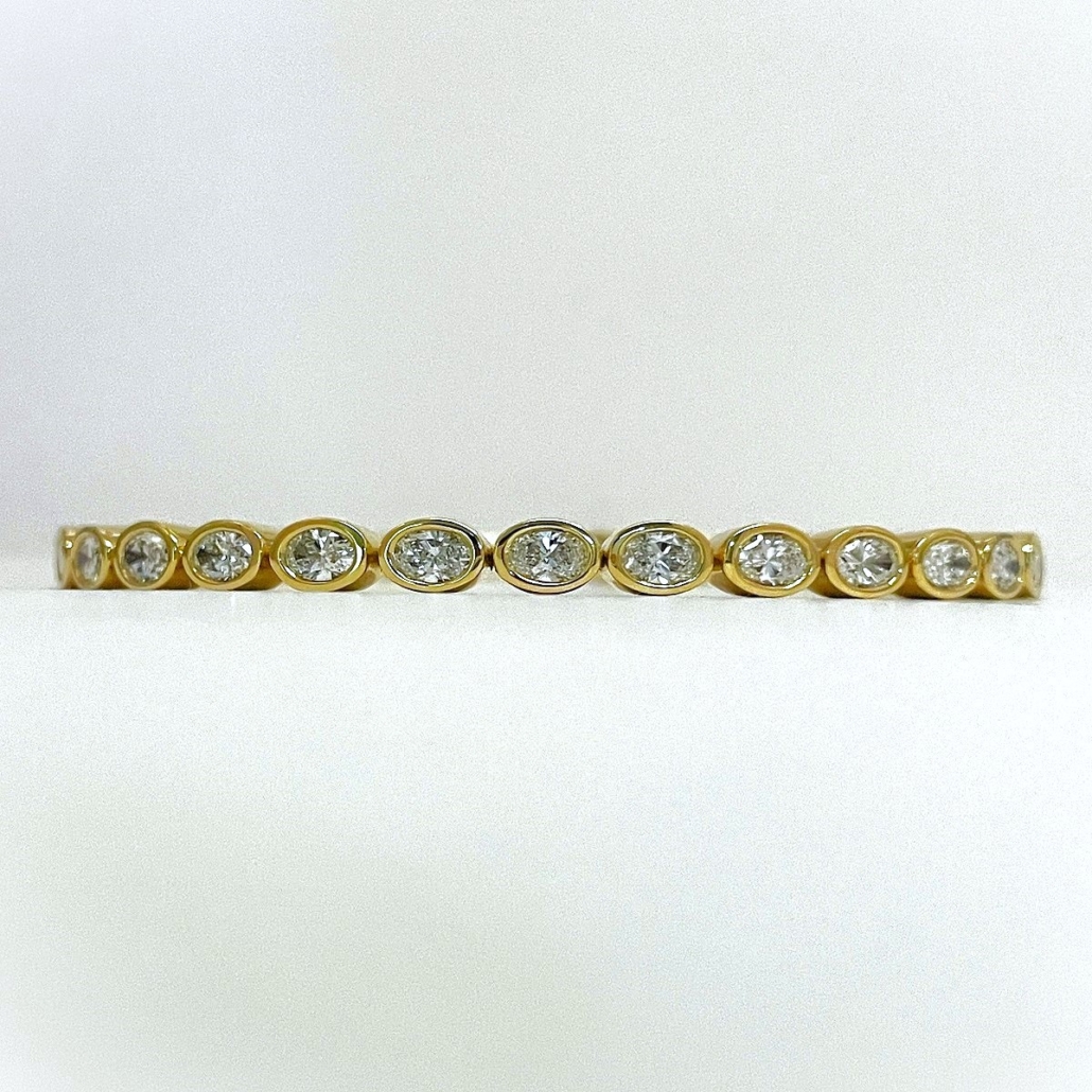 Elevate your elegance with the timeless allure of our Oval Bezel Diamond Bangle. Each sparkling diamond is expertly nestled in a smooth, high-polished bezel setting, creating a seamless stream of brilliance that wraps gracefully around your wrist.