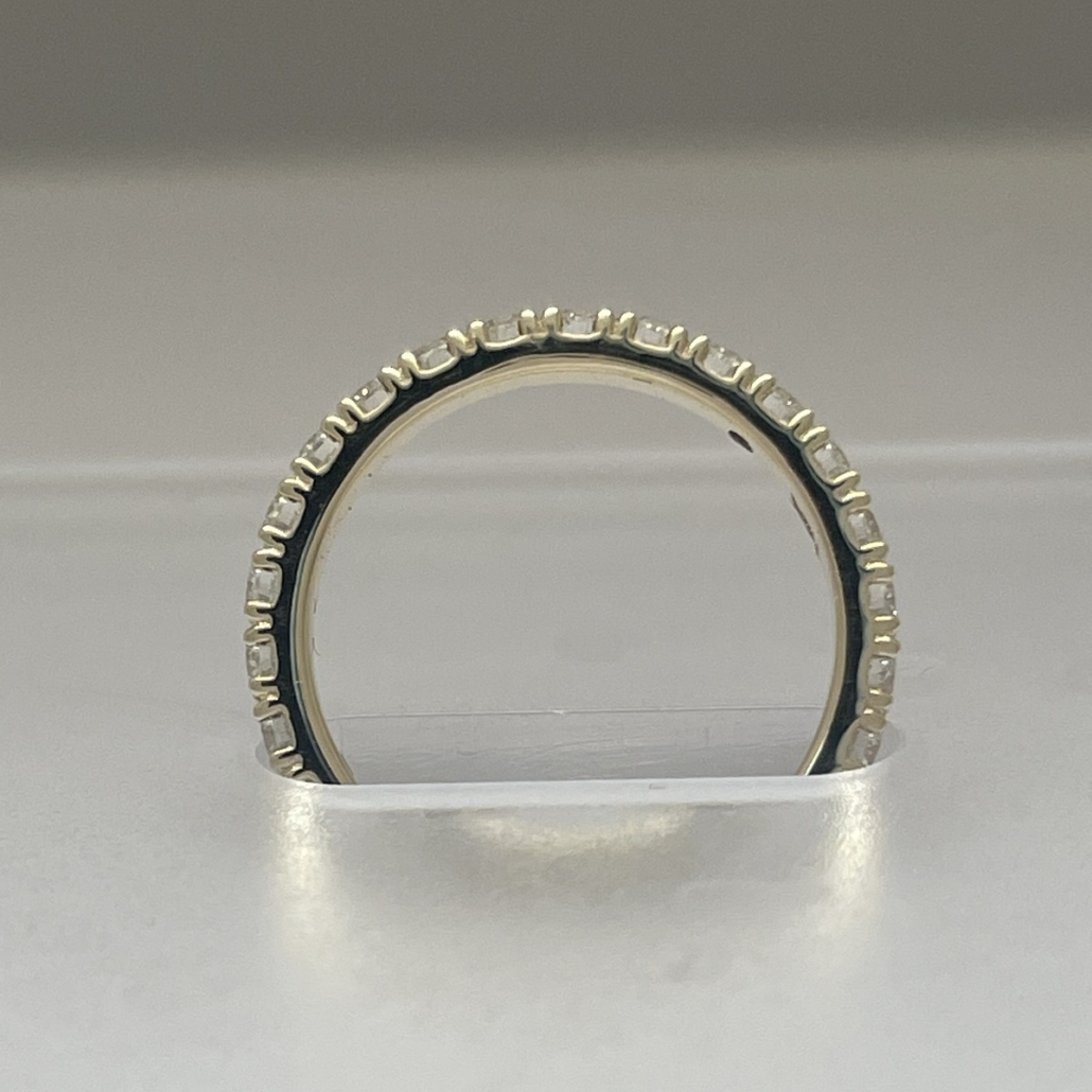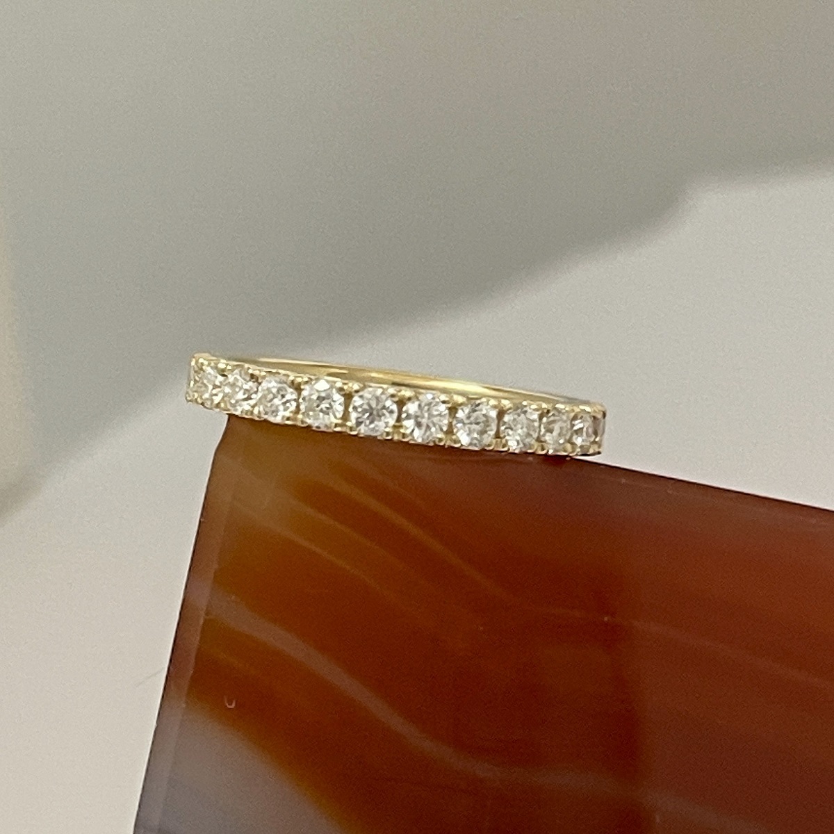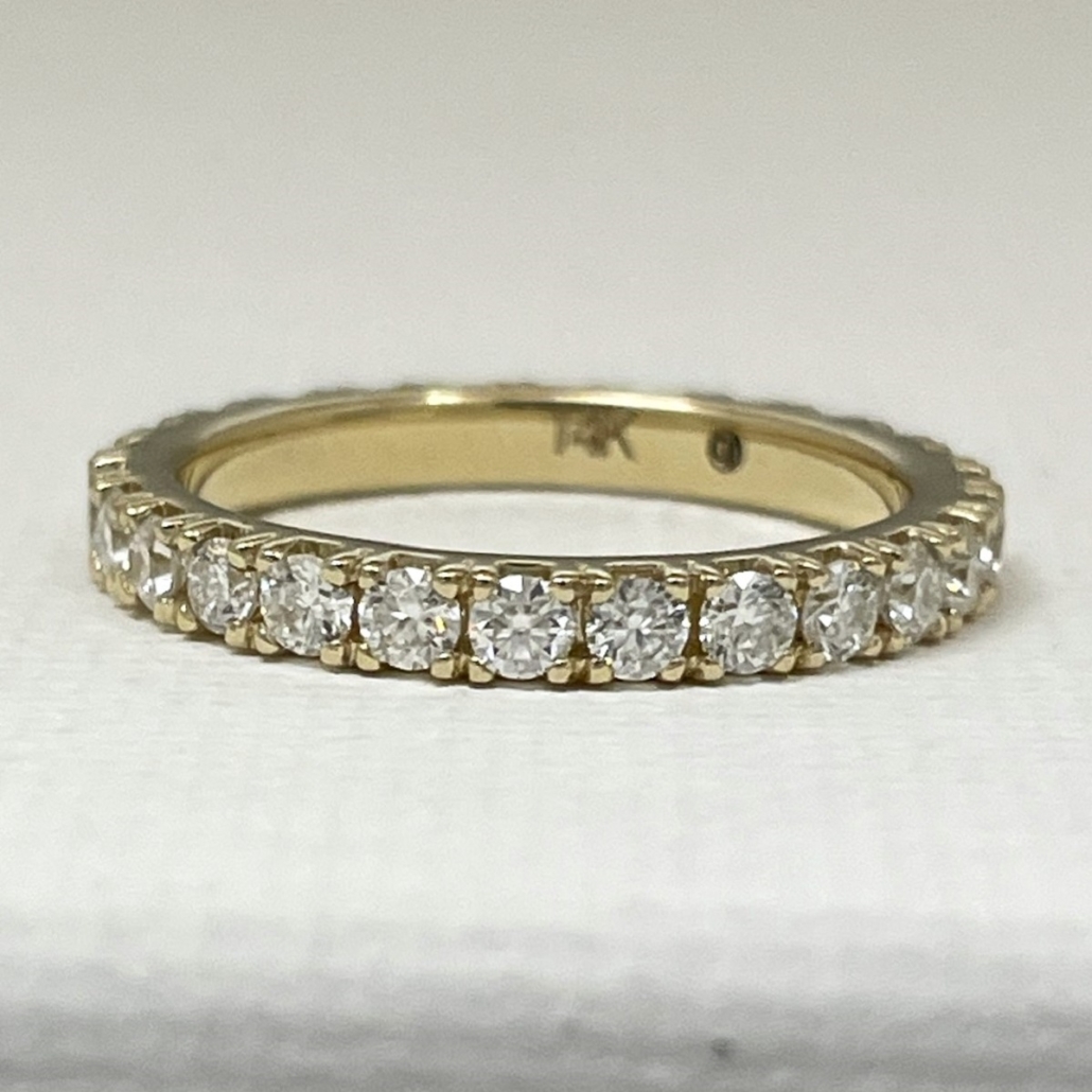 A timeless diamond band featuring a row of perfectly matched round brilliant diamonds set in warm 14k yellow gold.