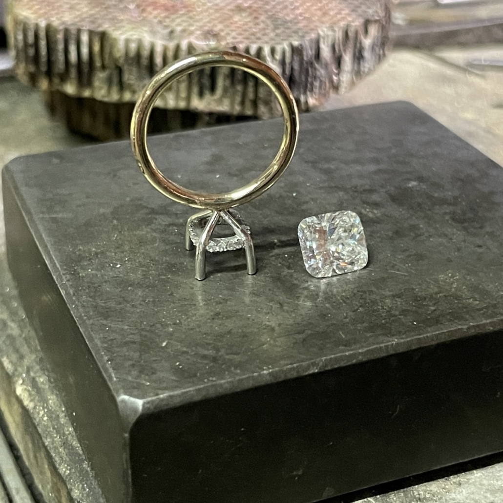 A stunning cushion-cut diamond floats in a white gold setting atop a sleek yellow gold band. With hidden pavé diamonds underneath, this ring is all about quiet luxury and radiant love.