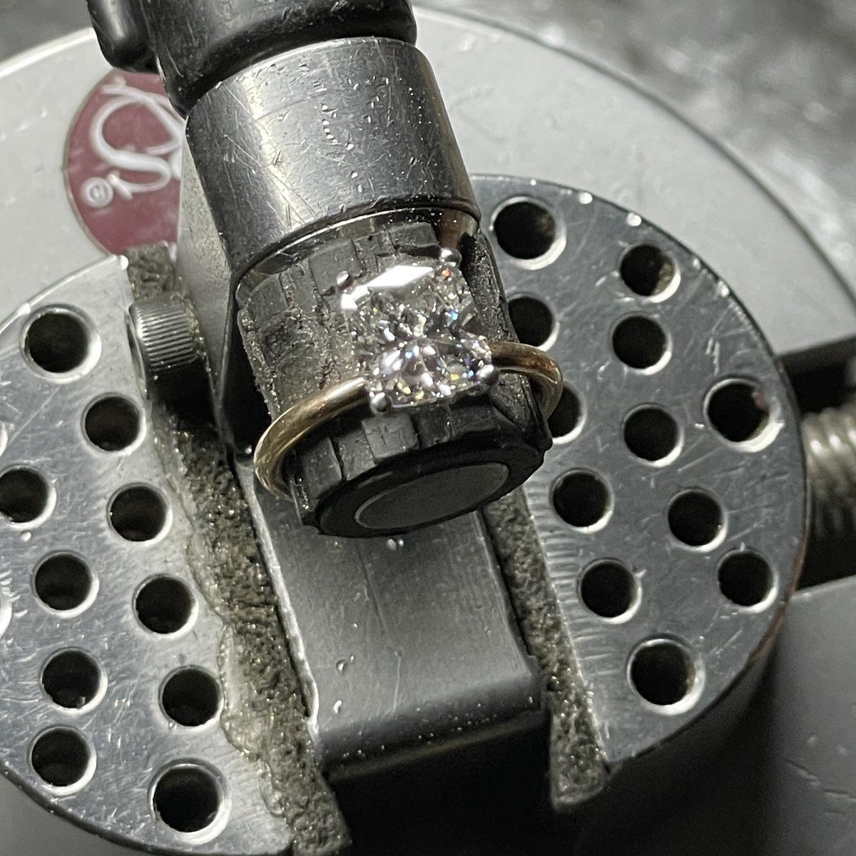A stunning cushion-cut diamond floats in a white gold setting atop a sleek yellow gold band. With hidden pavé diamonds underneath, this ring is all about quiet luxury and radiant love.