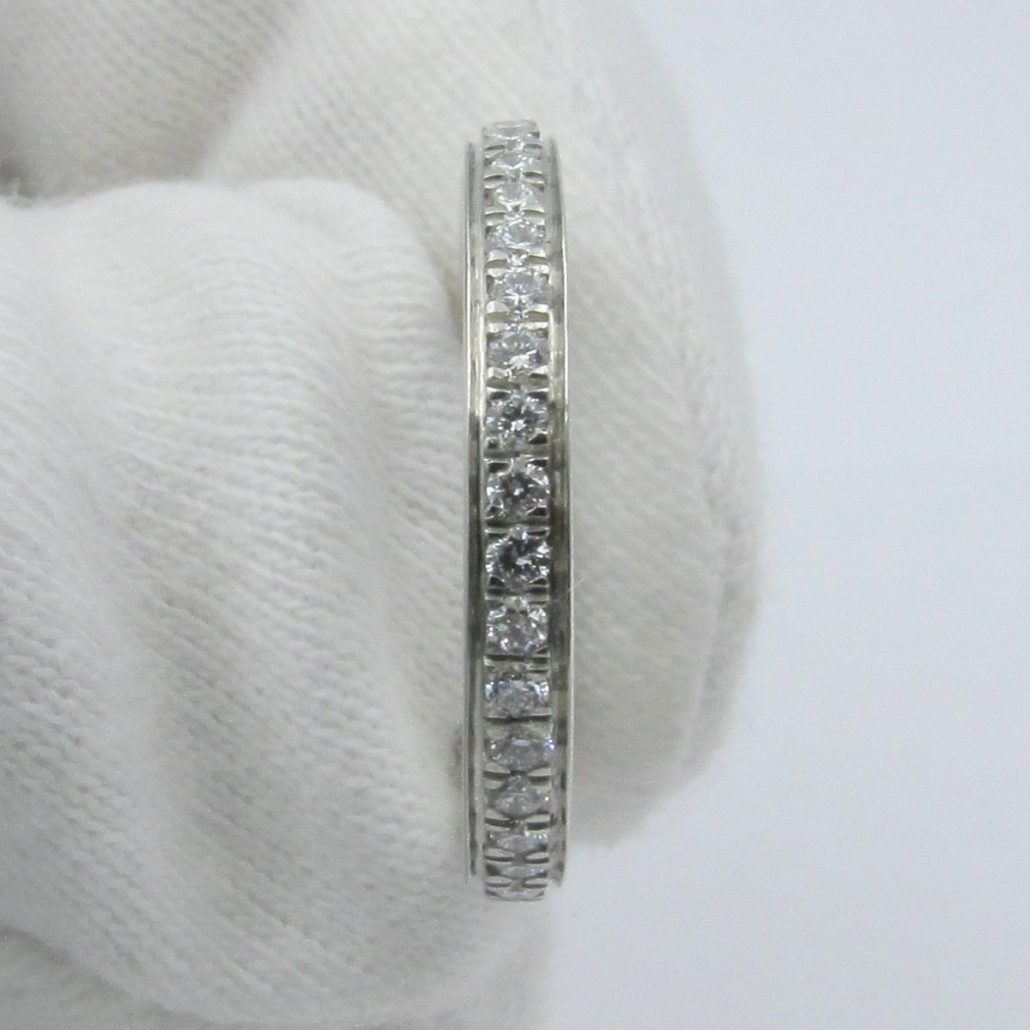 This custom-made eternity wedding band is created with platinum and four prong set with natural round brilliant diamonds. The band has small groove edges.