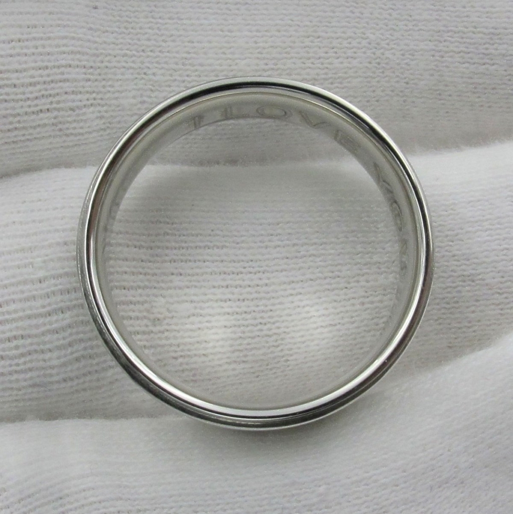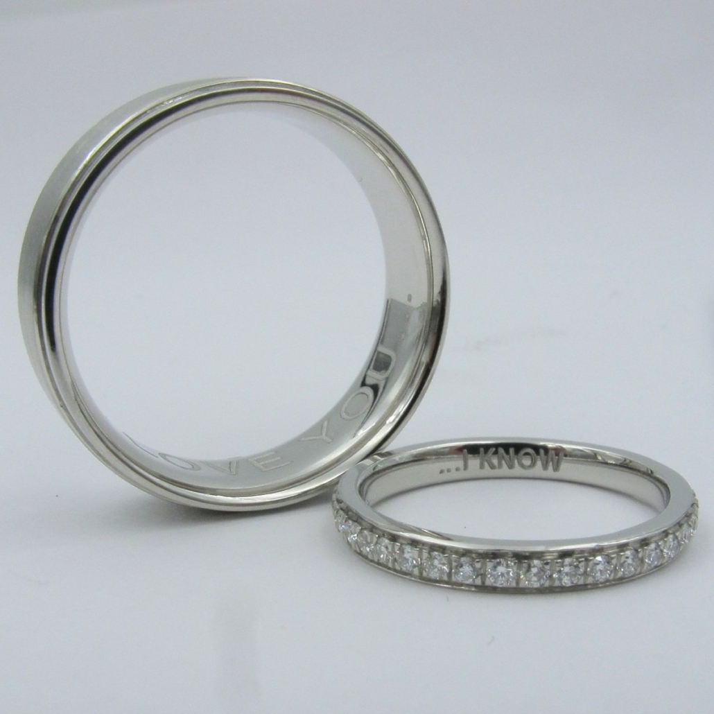 The gentleman’s wedding band is 95% pure platinum and 5% iridium. The center of the band has a satin finish. The rim is indented and has a high polish. Inside the ring is engraved to give a nod to his favorite movie.