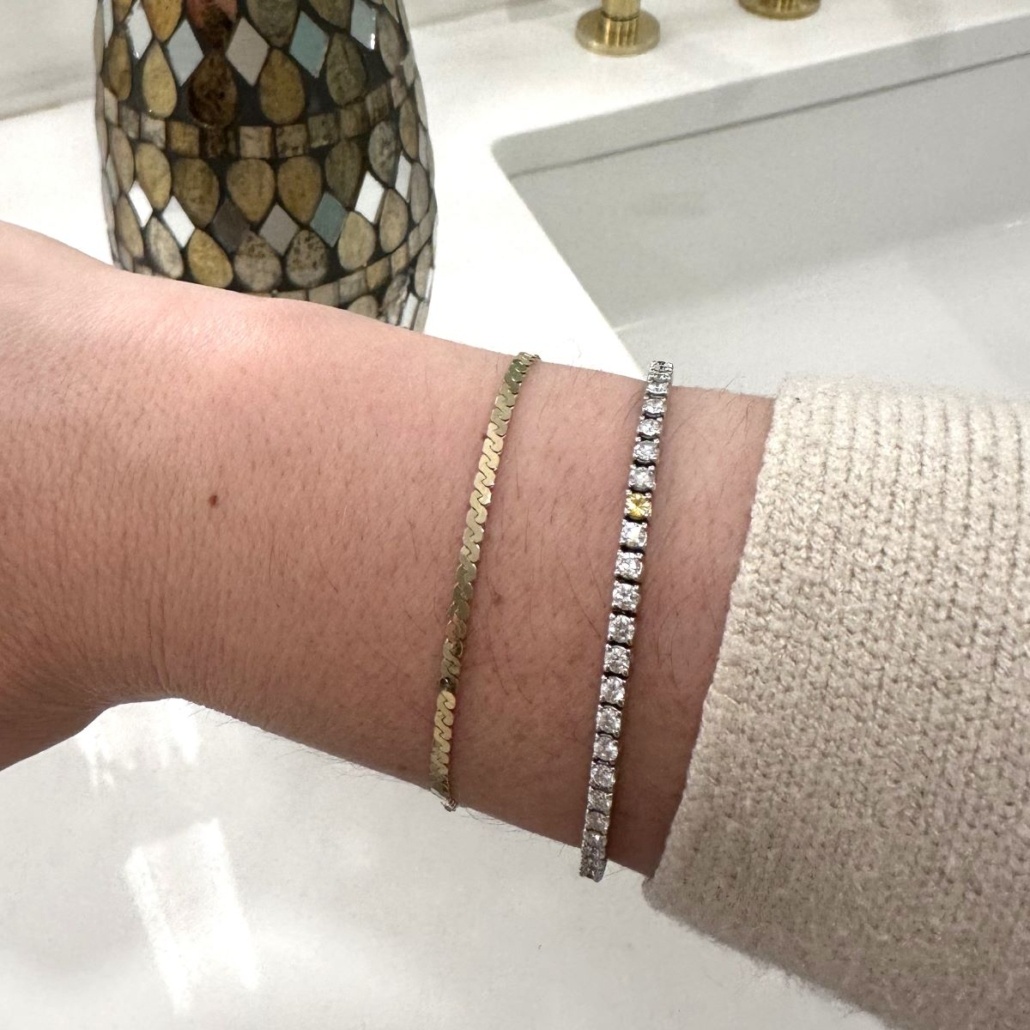 At the center of this inline diamond bracelet, nestled among the dazzling diamonds, lies a radiant yellow sapphire. This vibrant gemstone represents the first child, a beacon of joy and sunshine in the mother’s life. The yellow sapphire’s rich hue adds a pop of color and warmth to the bracelet, creating a striking contrast against the dazzling diamonds.