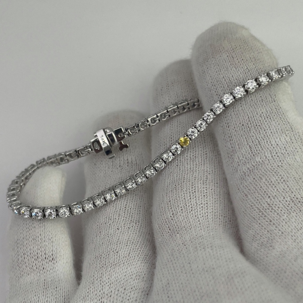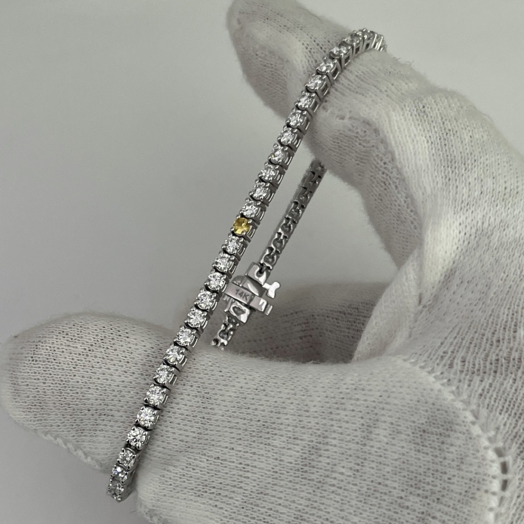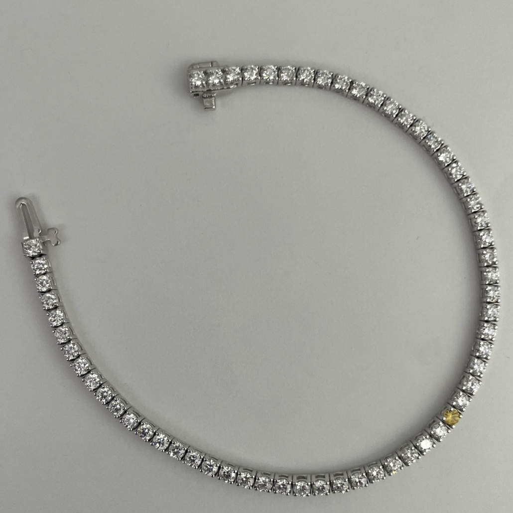 This tennis bracelet is made with 14k yellow gold. The bracelet is prong set with natural round brilliant diamond. At the very center of the bracelet holds a natural yellow sapphire so symbolize birth month of the child.