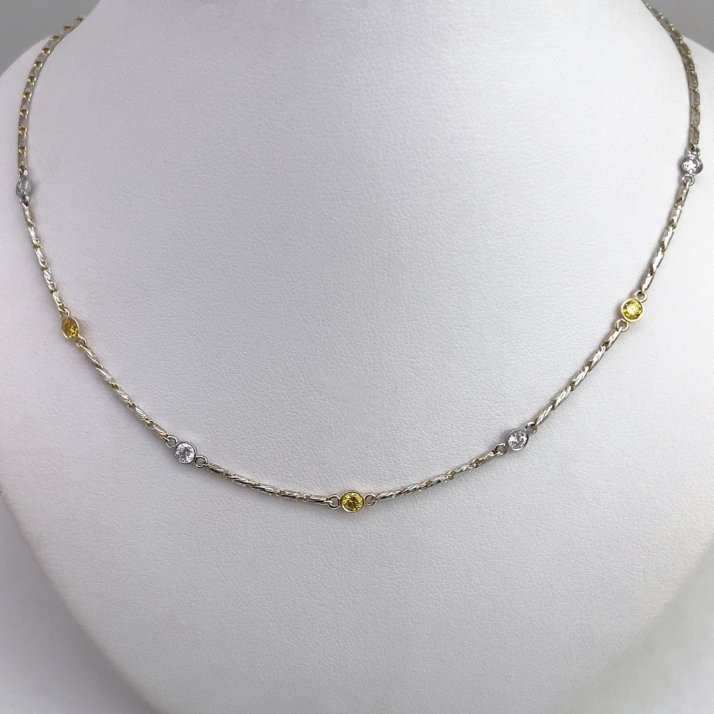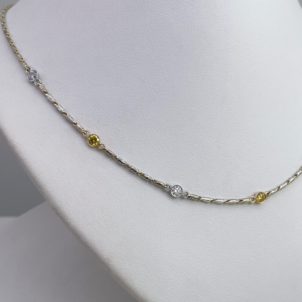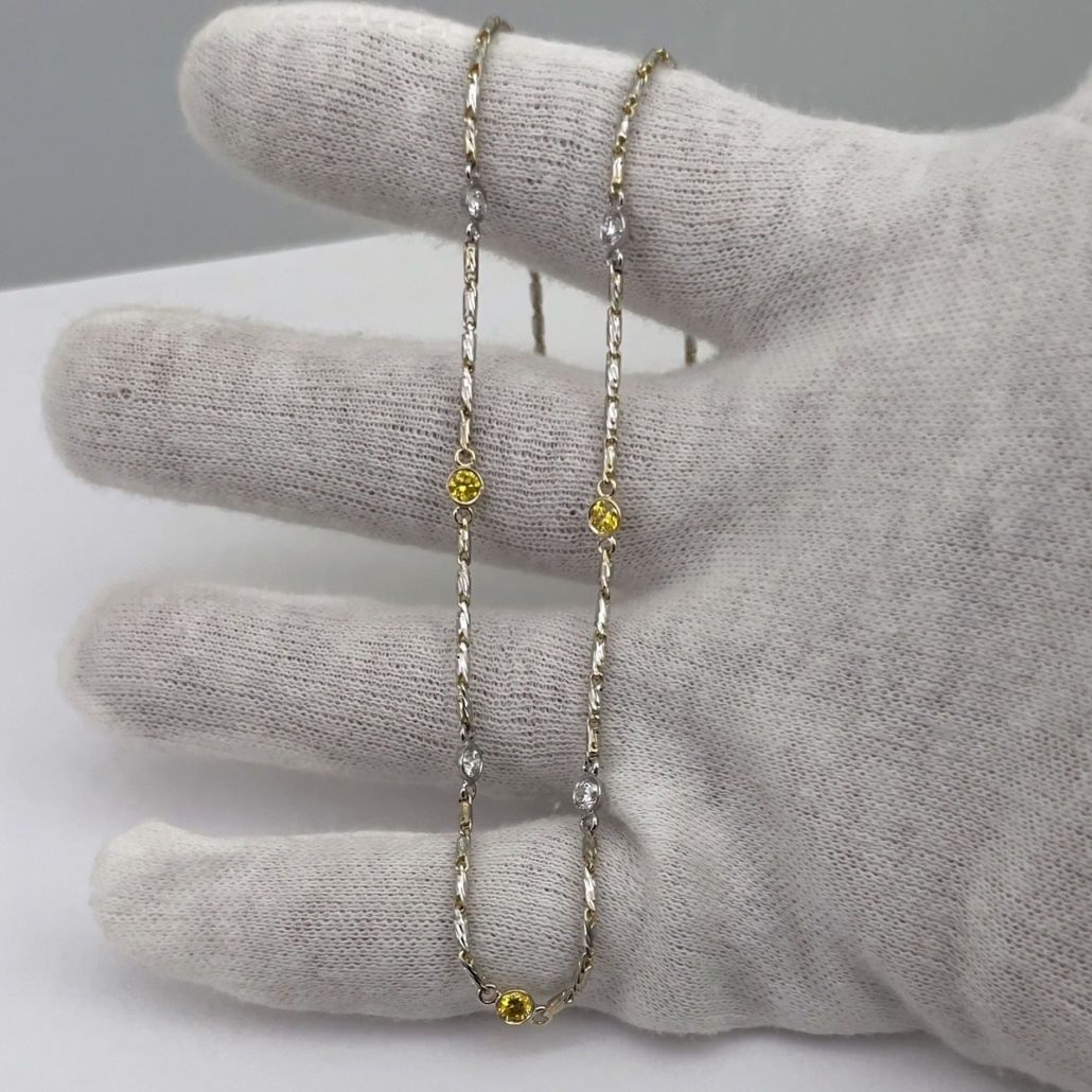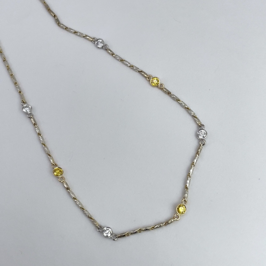 This two tone diamond bezel necklace is made with 14k yellow and white gold and bezel set with lab grown diamonds.  Each link on this chain is white gold and yellow gold intertwined together. Lab grown diamonds are also white white and yellow bezel set on the chain, to further enhance the yellow and white duality of this necklace.