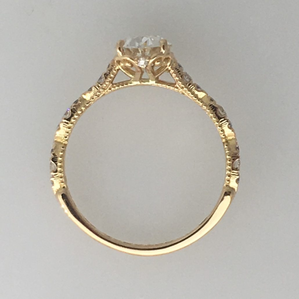 Ornate vintage ring features a GIA Certified Oval diamond accented in a scroll designed shank featuring round diamonds set into trios around the band.