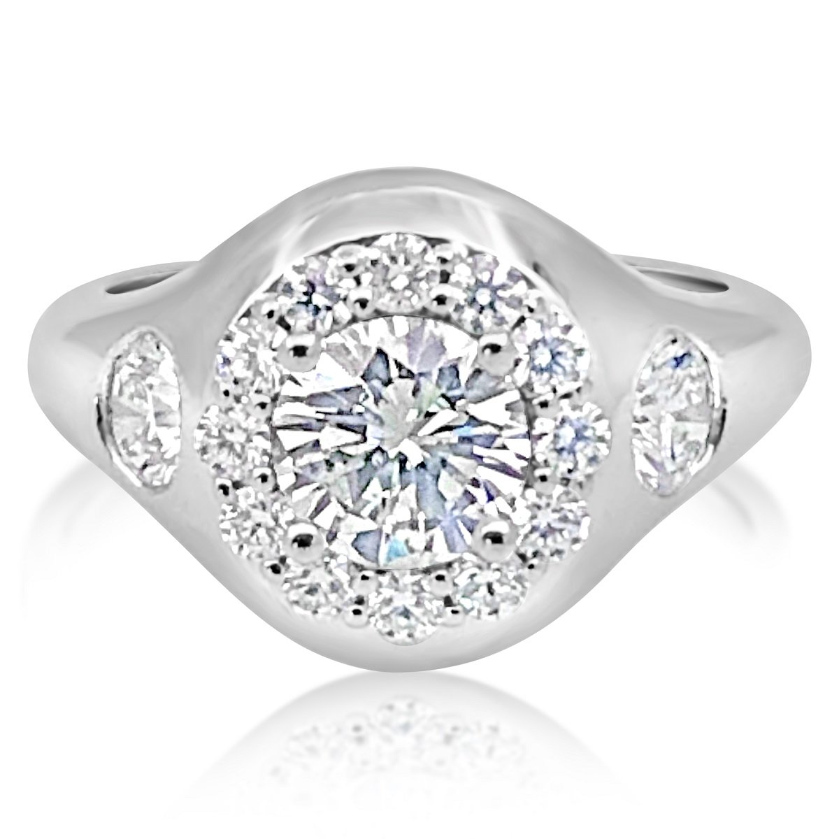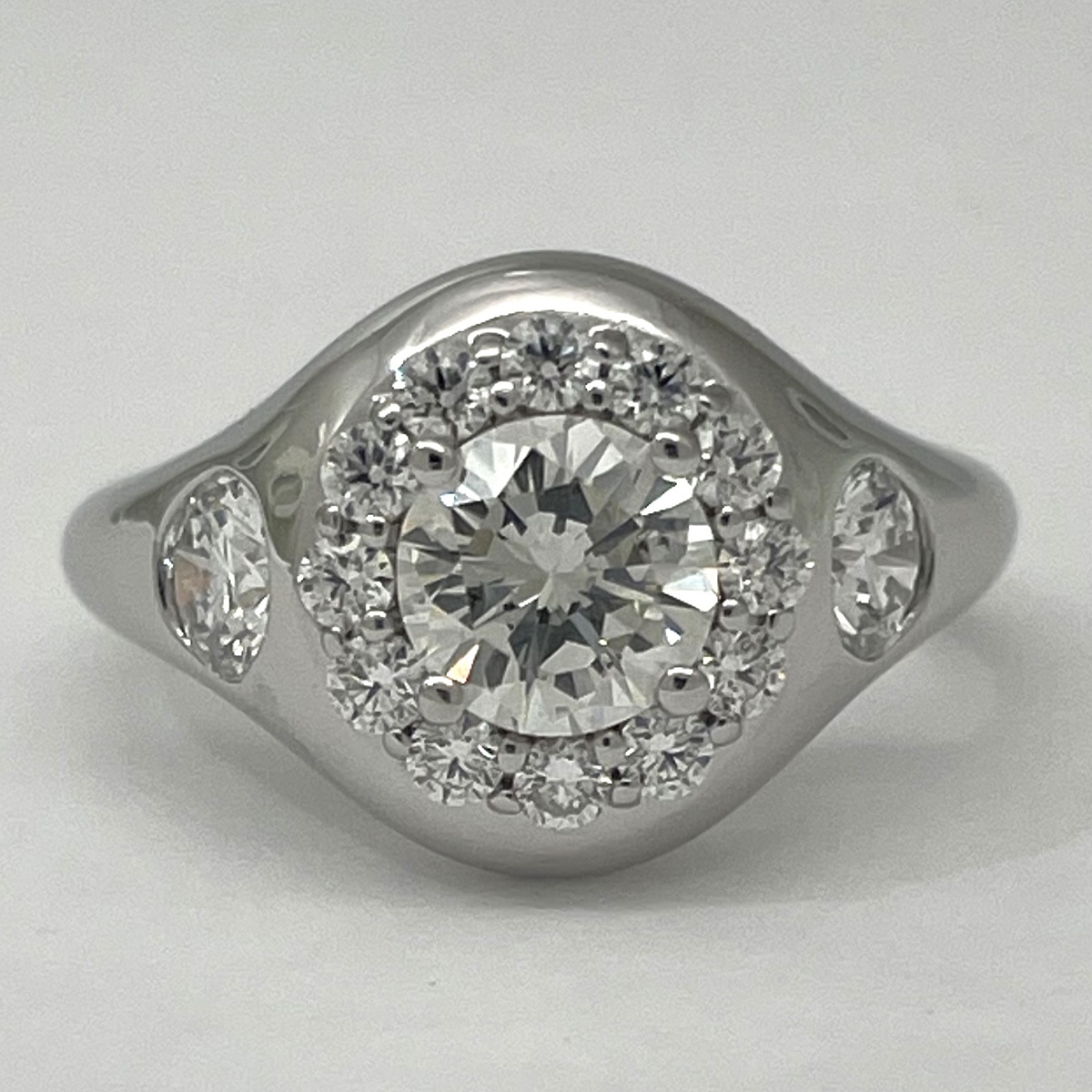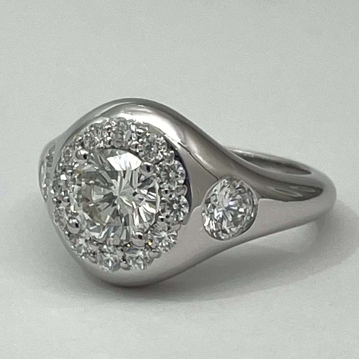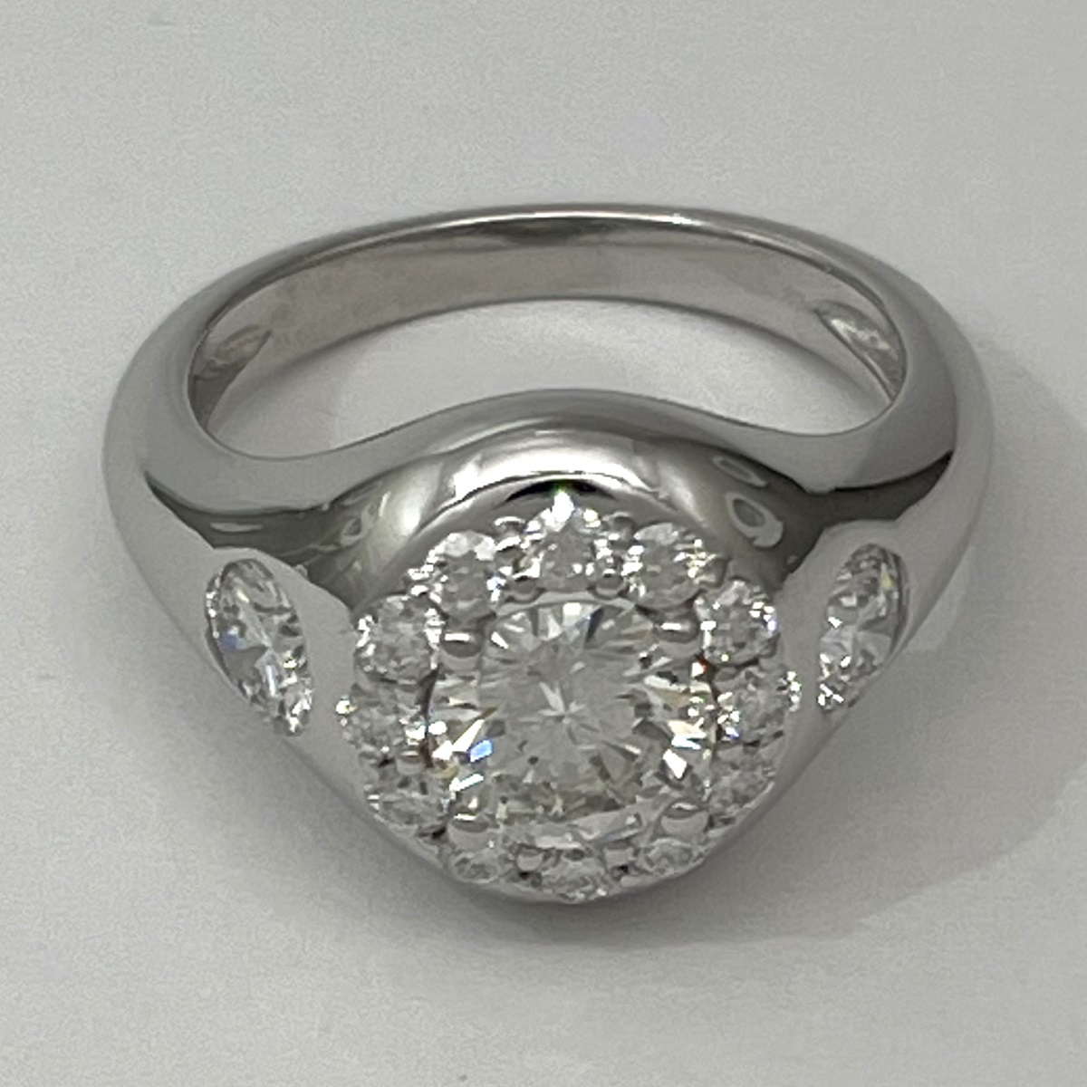 This ring is made with 14k white gold and natural round brilliant diamonds that are prong set and bezel set.