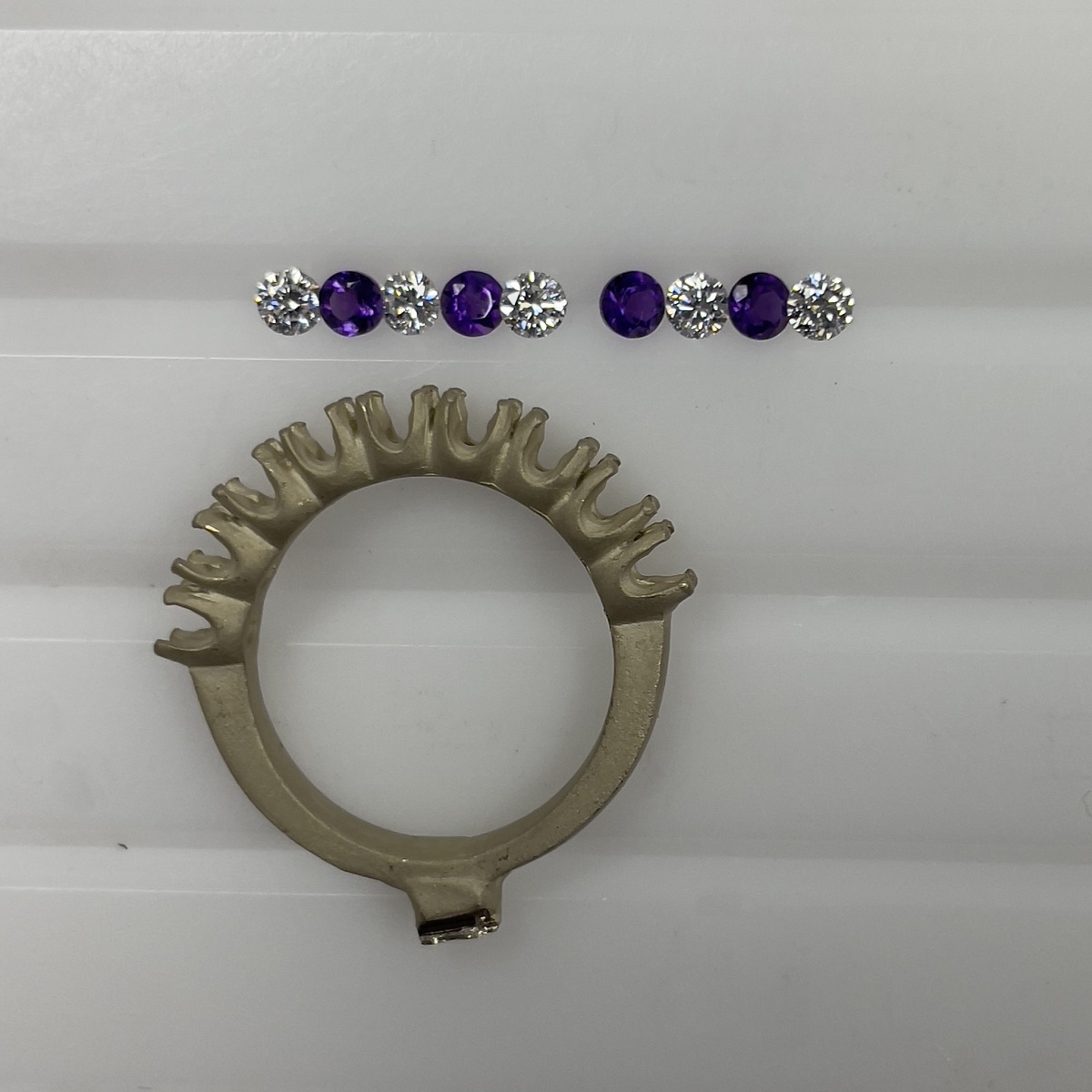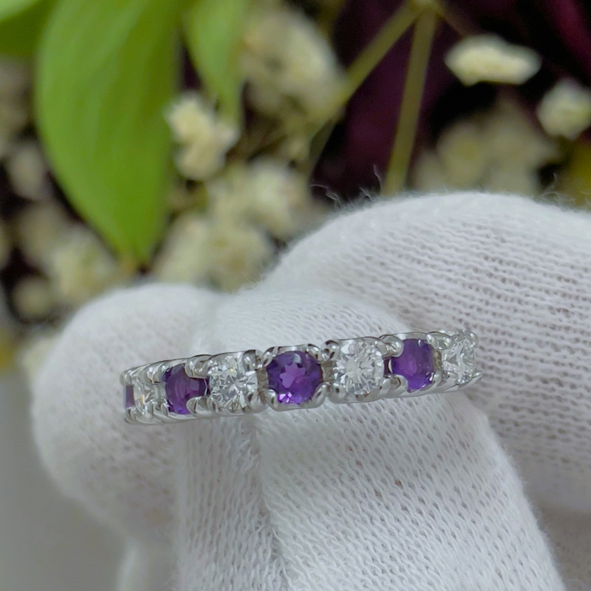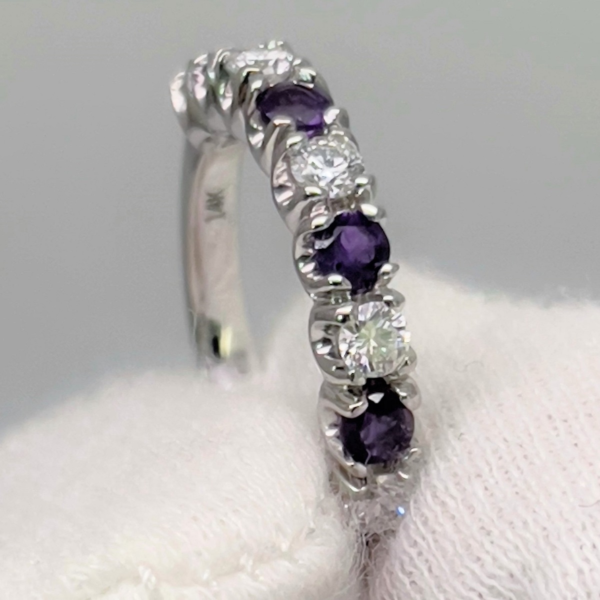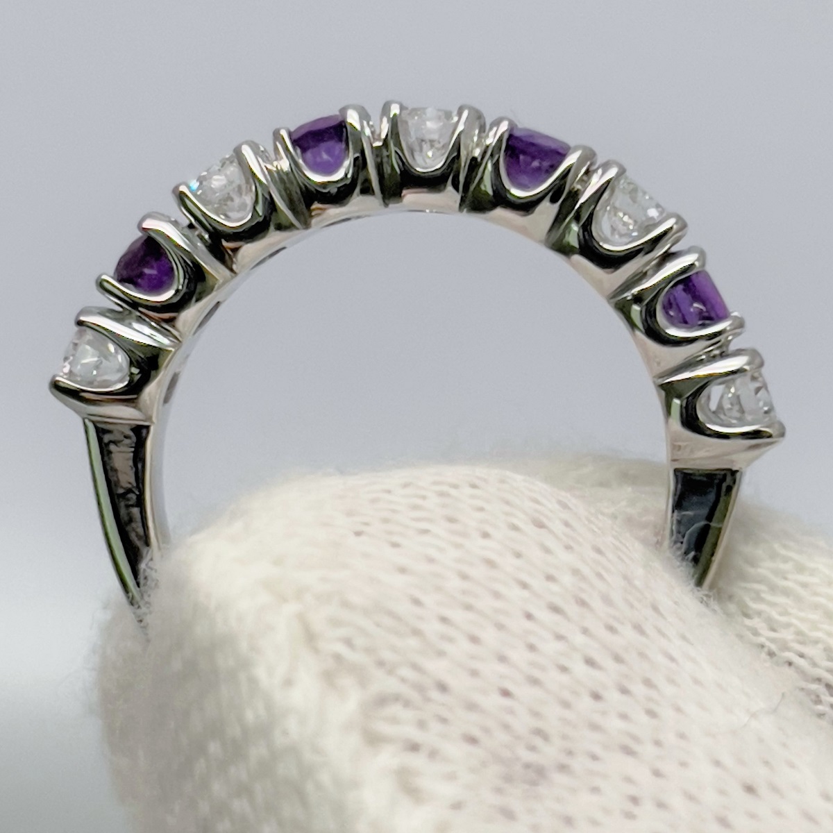 This Beautiful Ring Is Made With 14k White Gold And Set With Diamond And Amethysts.