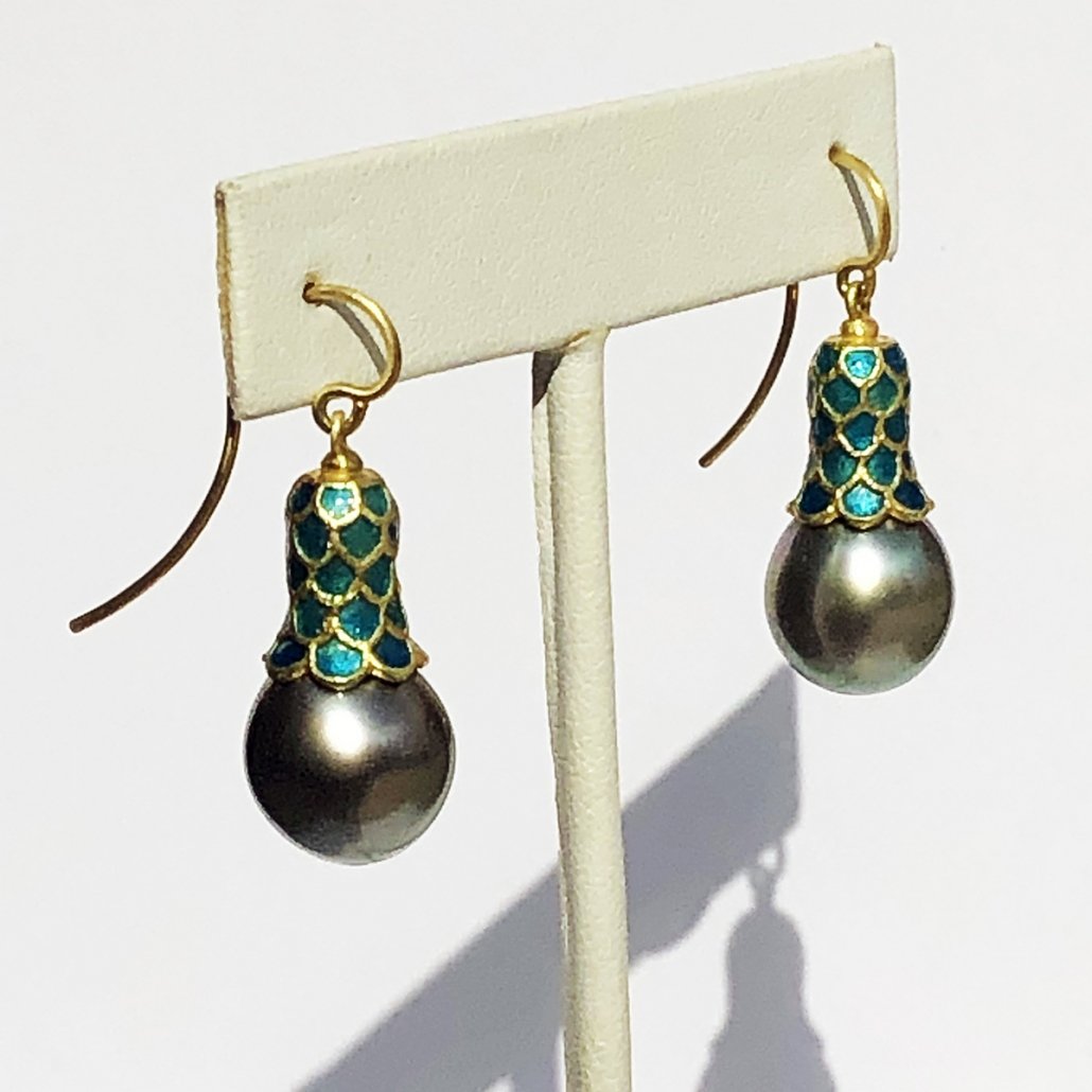 Feel like a princess in these Tahitian Pearl and Enamel Scale domed 18 K Yellow Gold dangling earrings .
