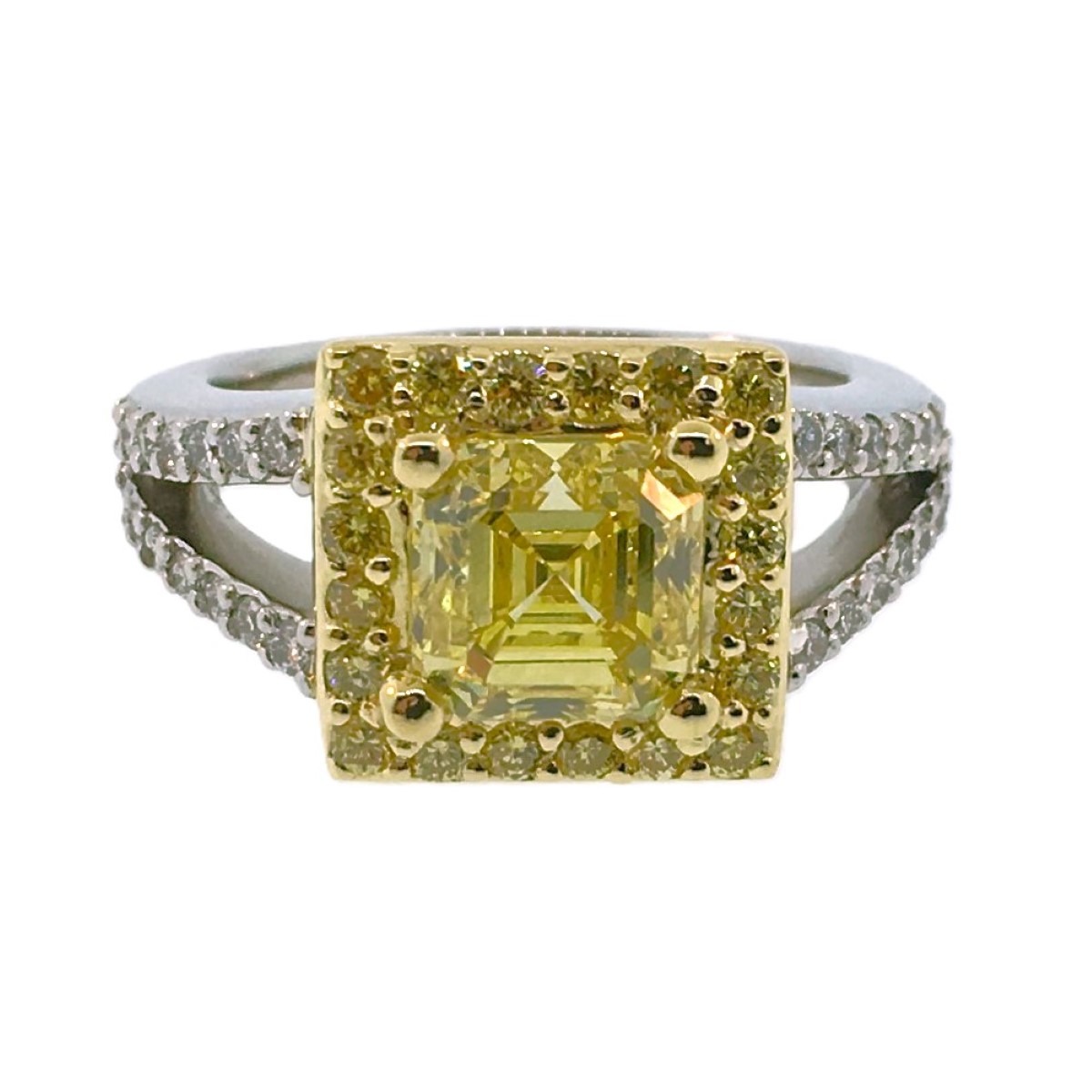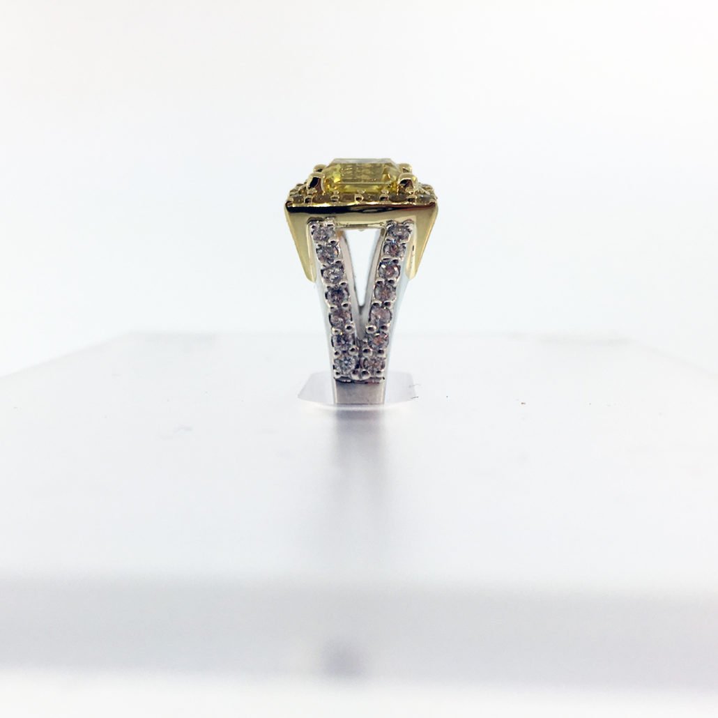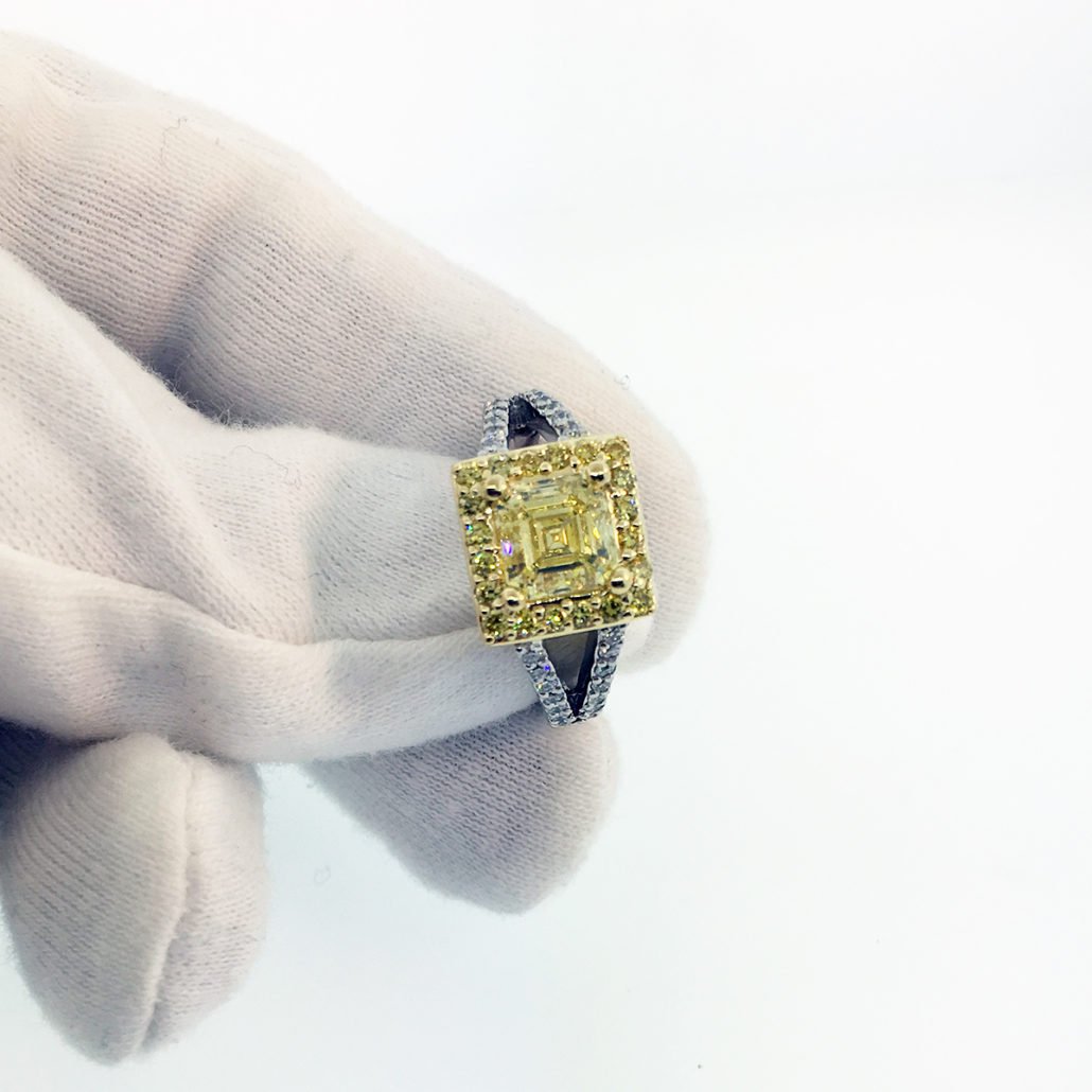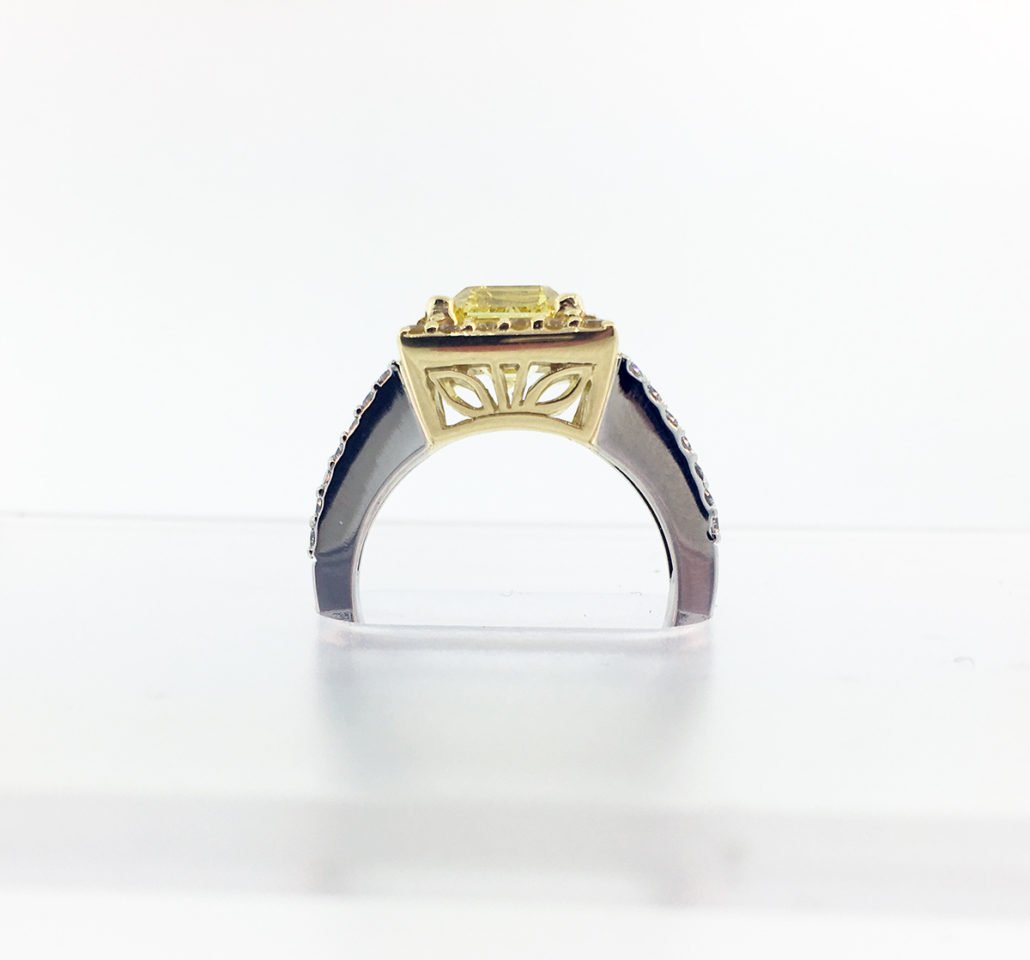 This engagement ring is made of platinum and 18k yellow gold. It features one natural square emerald-cut fancy intense yellow diamond. The diamond weighs 2.14 carats and has a clarity of VS1. The polish is very good, the symmetry is good and the distribution is even.