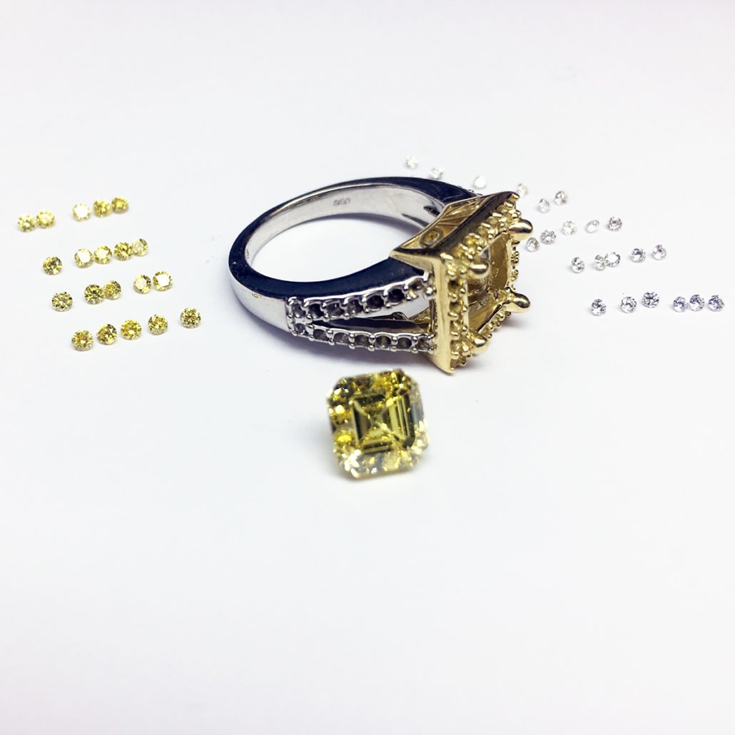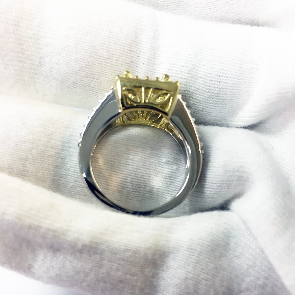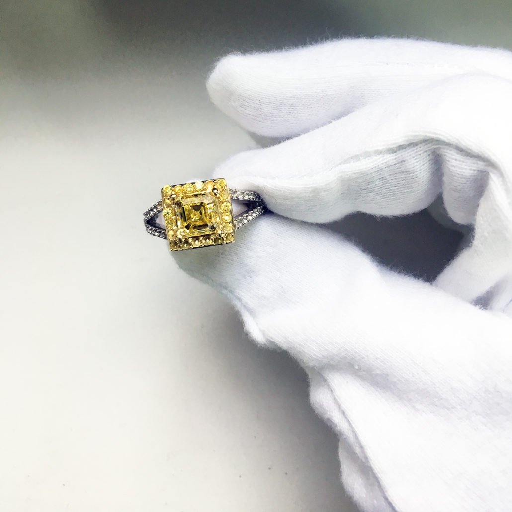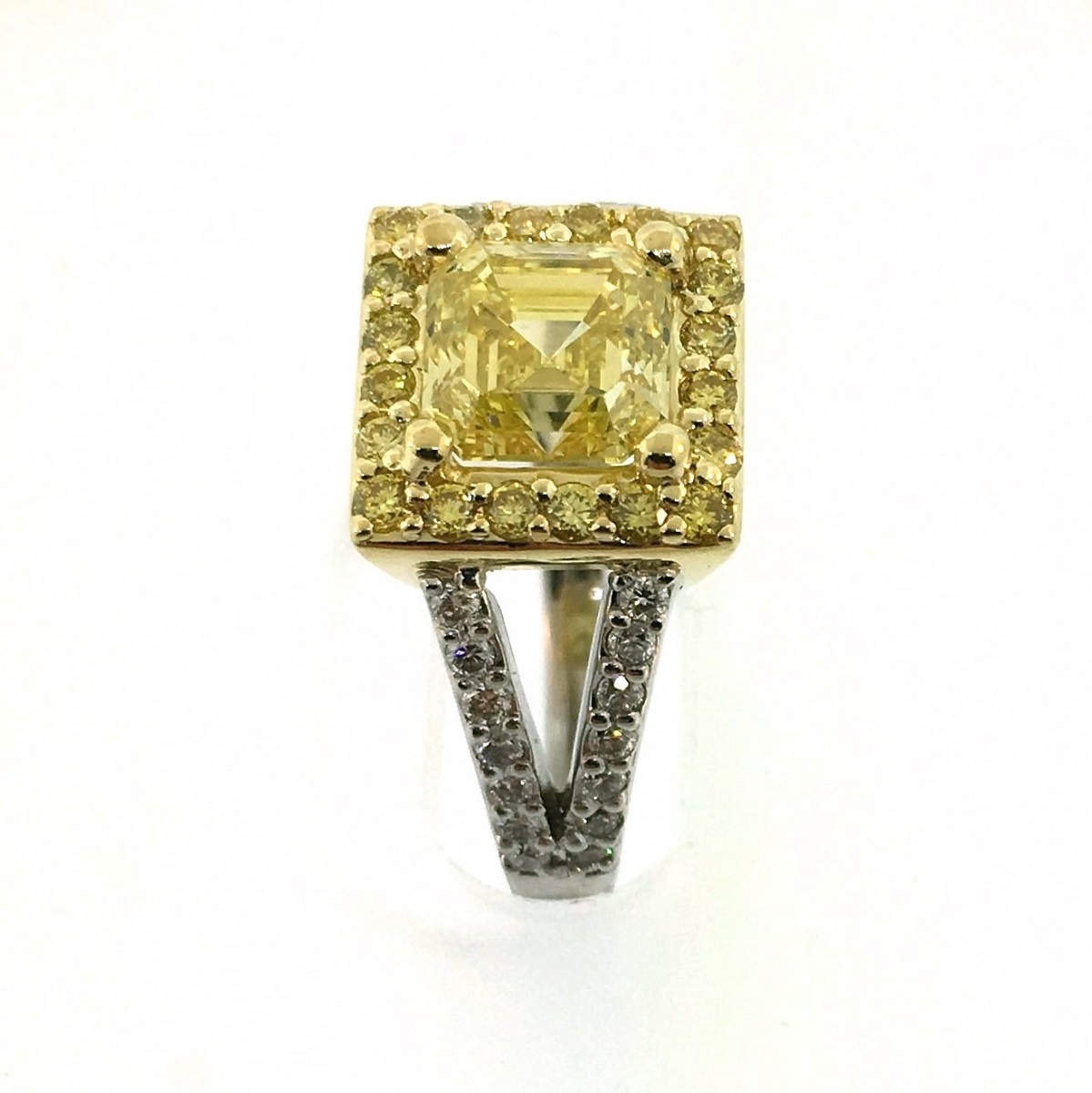 This engagement ring is made of platinum and 18k yellow gold. It features one natural square emerald-cut fancy intense yellow diamond. The diamond weighs 2.14 carats and has a clarity of VS1. The polish is very good, the symmetry is good and the distribution is even.