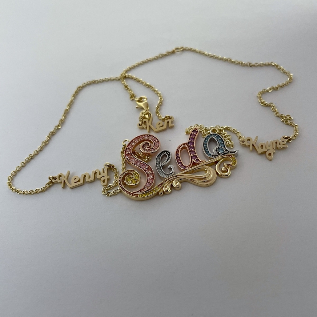 Along the chain, the name are delicately spelled out in polished script, capturing the essence of family in the most personal way.