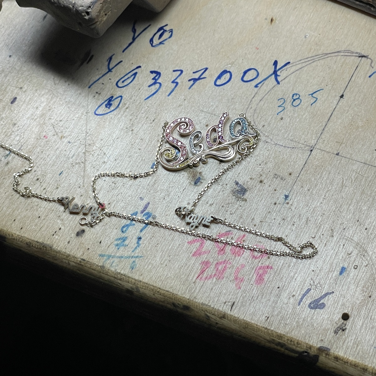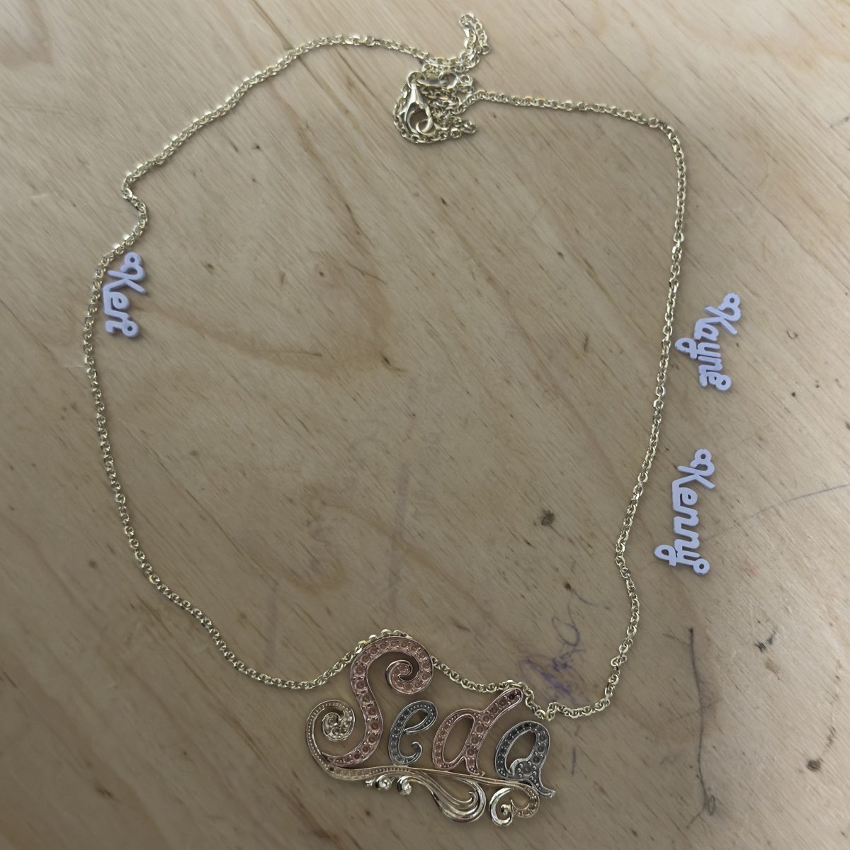 Along the chain, the name are delicately spelled out in polished script, capturing the essence of family in the most personal way.