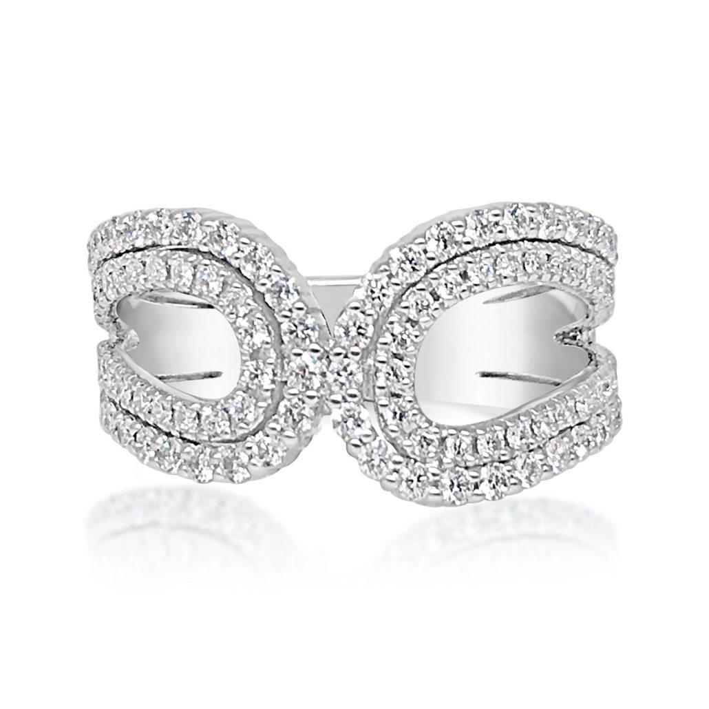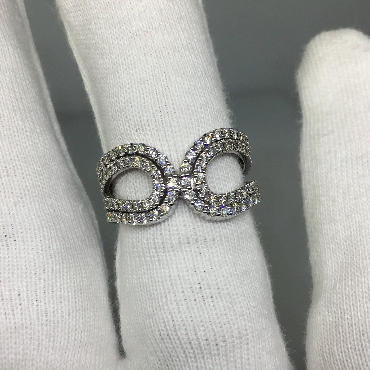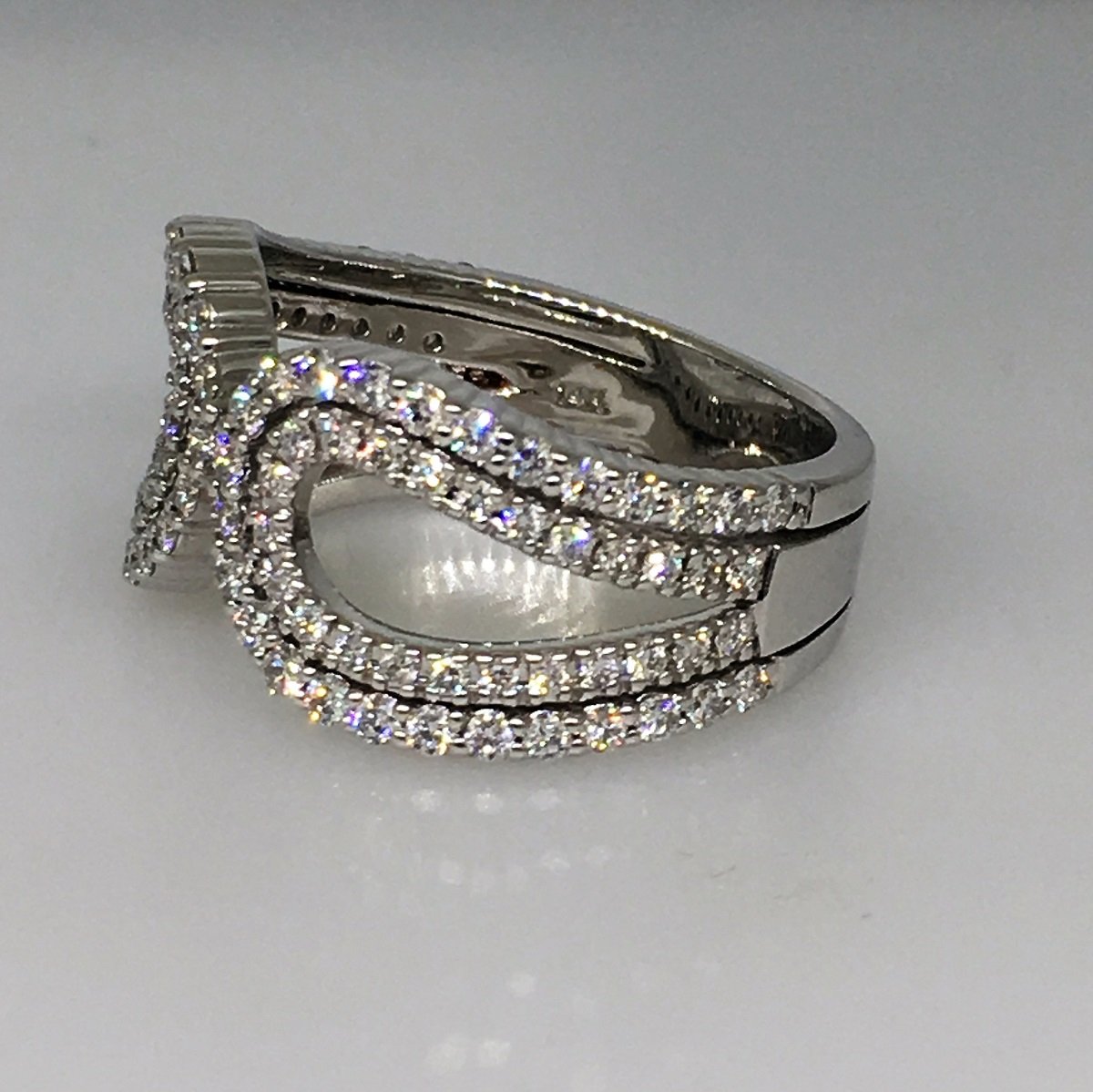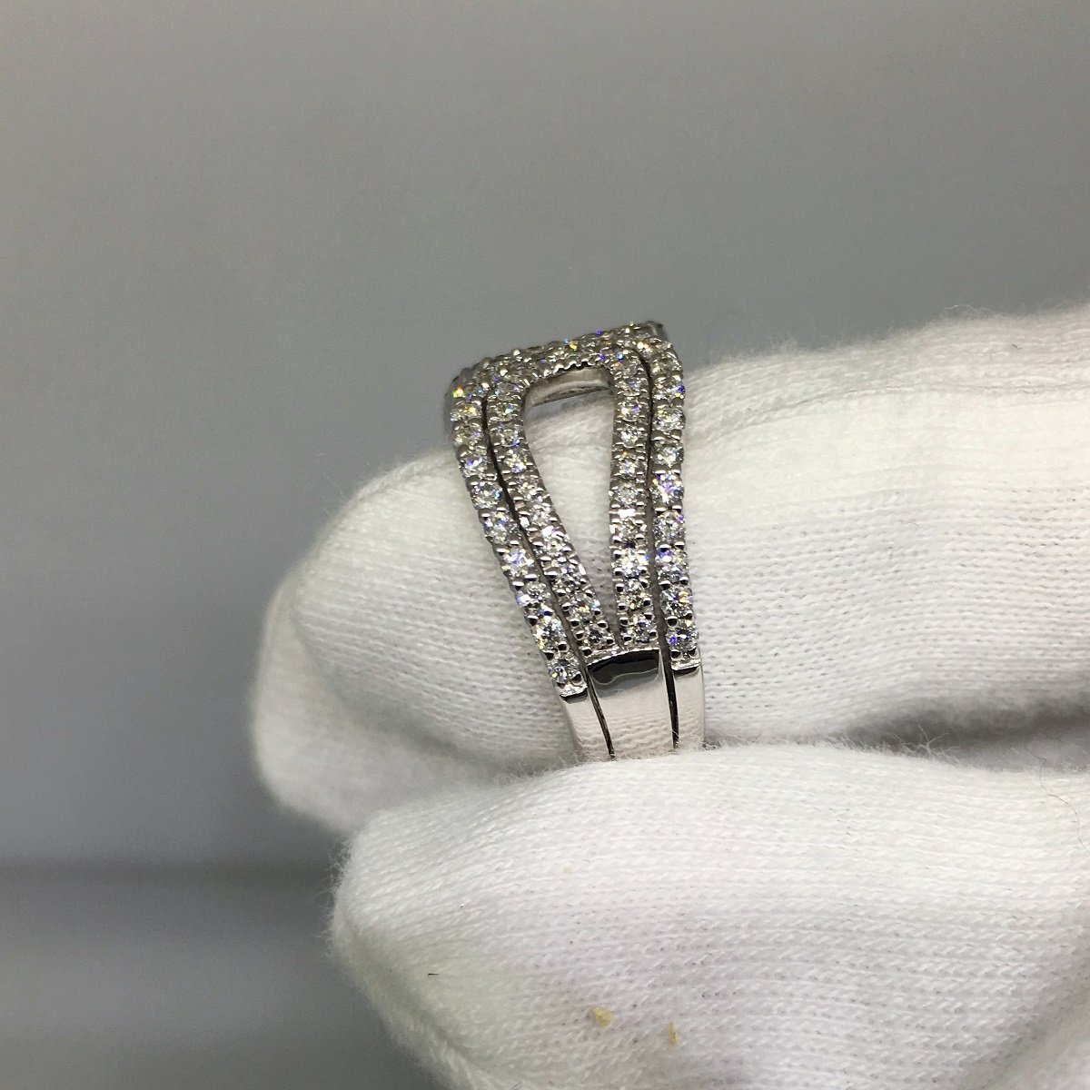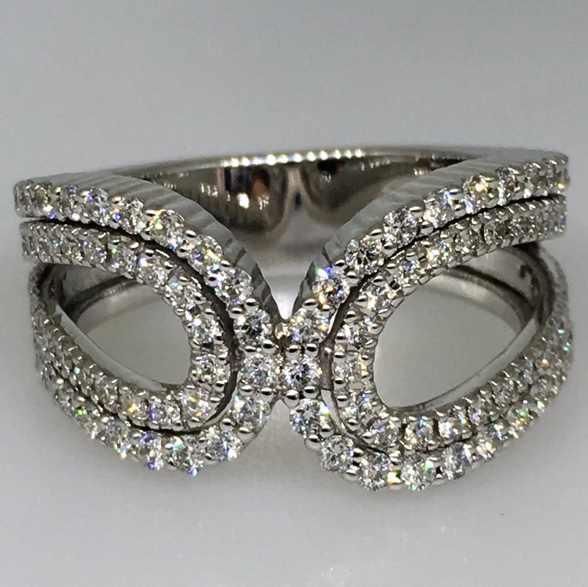 This ring is made of 14k white gold and weighs 5.72 grams. The ring has two U shaped rows of prong set diamonds. There are 110 mined natural diamonds having a total weight of 0.85 carats. Using a GIA grading scale the diamonds are GH color and VS-SI clarity. One U shape is slightly bigger than the other and they are connected on the top of the ring.