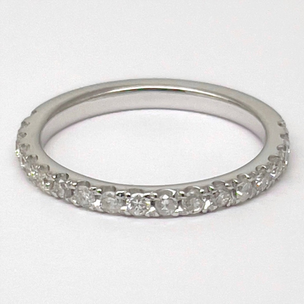 This ring is made with 14k white gold, set with diamonds on the shank.