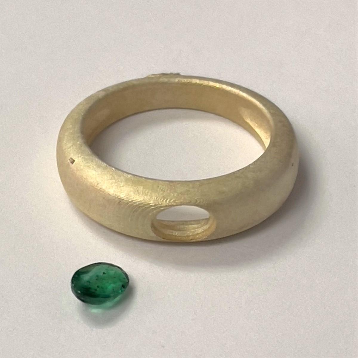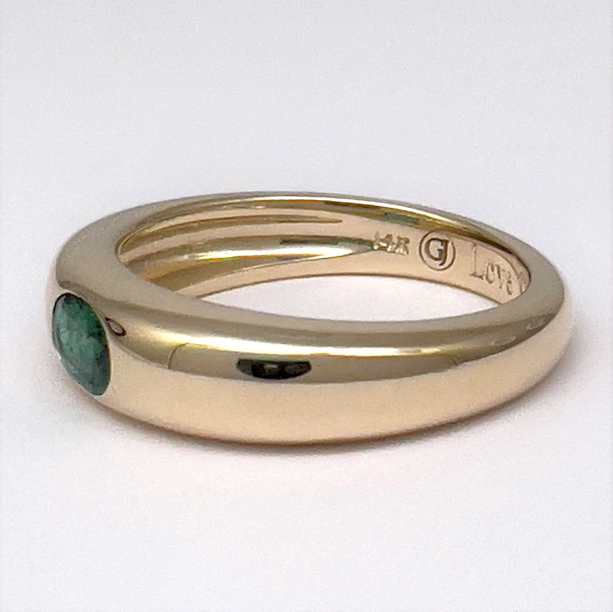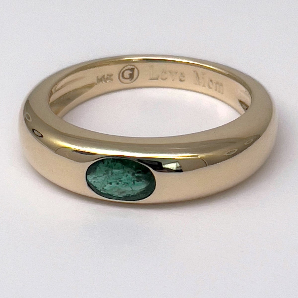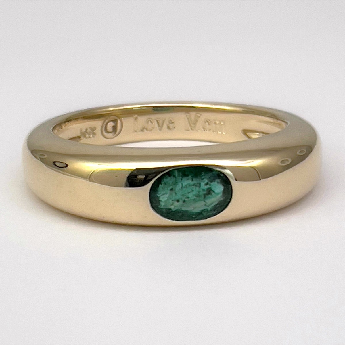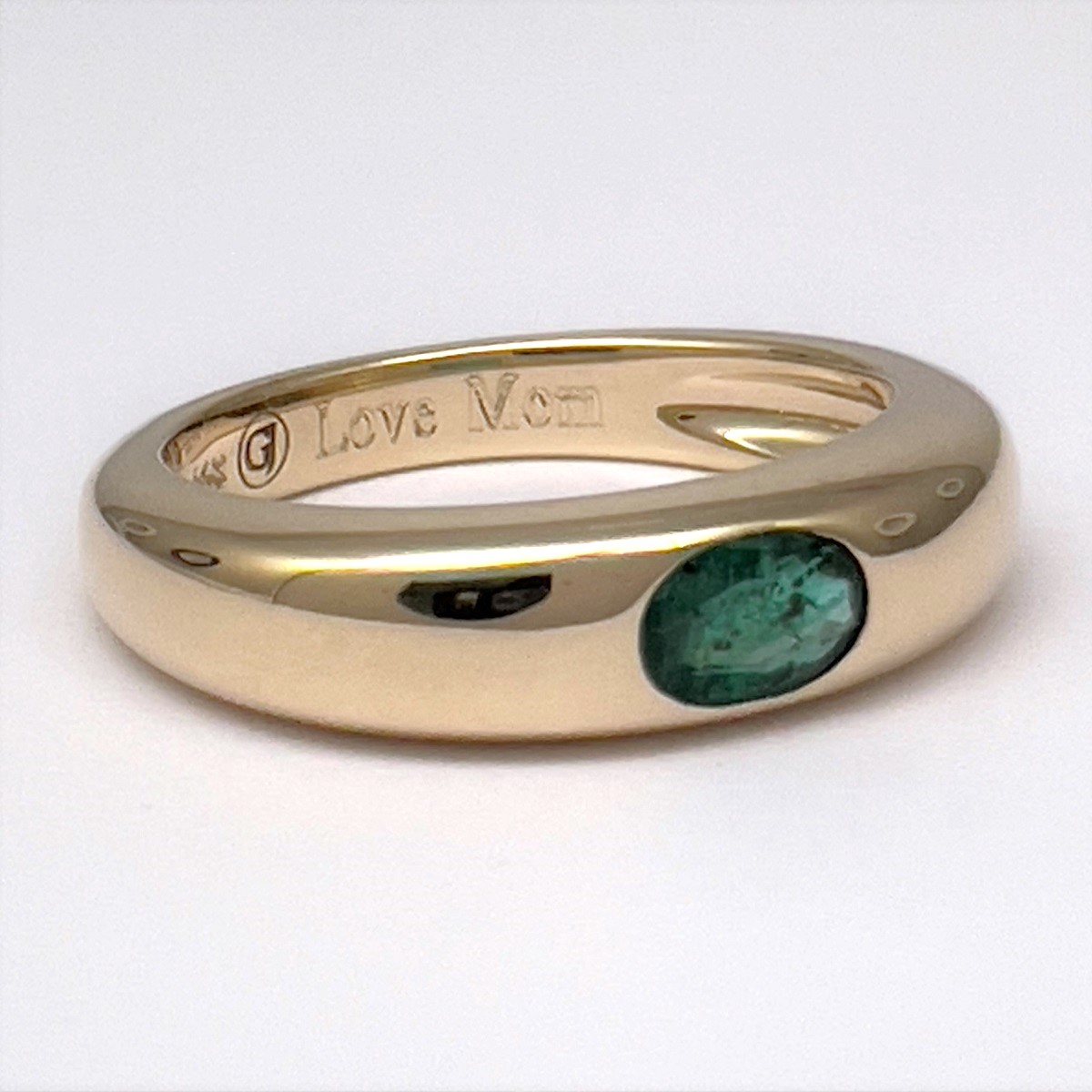 This solitaire emerald ring is made with 14k yellow gold, and features an emerald from a ring that a mother passed on to her daughter.  It is engraved with “Love, Mom”