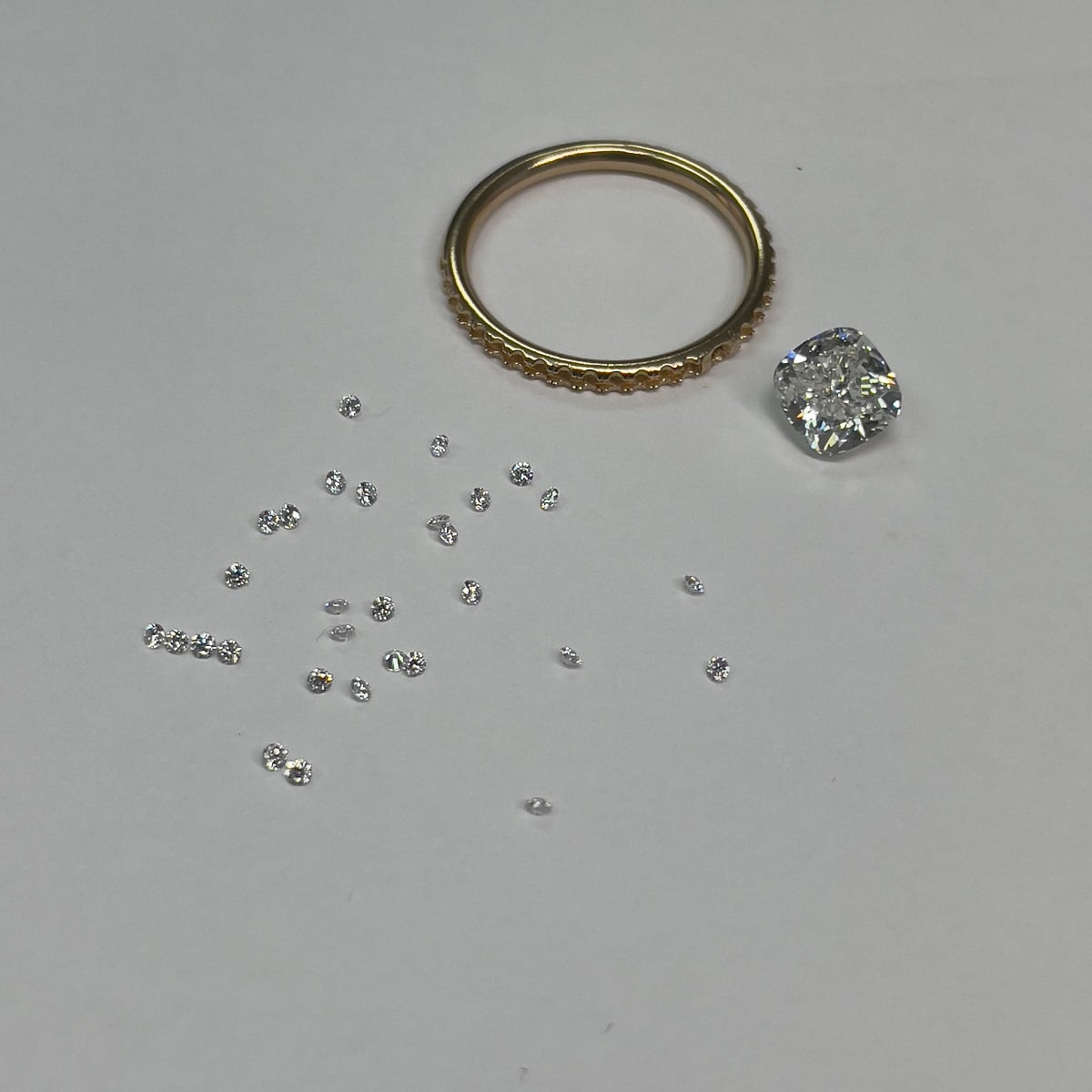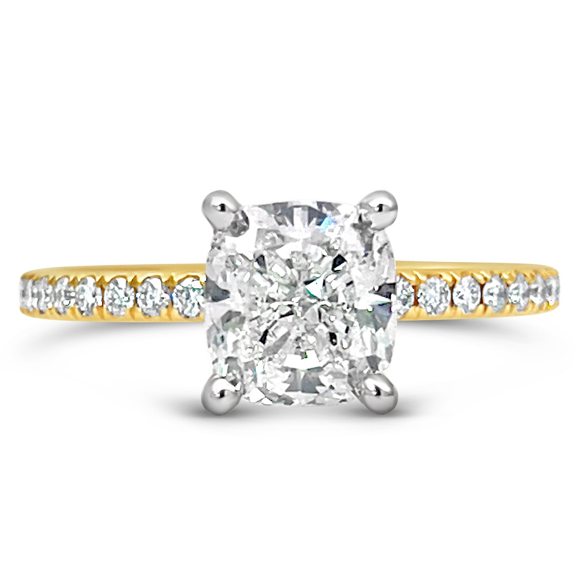 Gorgeous cushion cut halo, with diamonds on the shank.