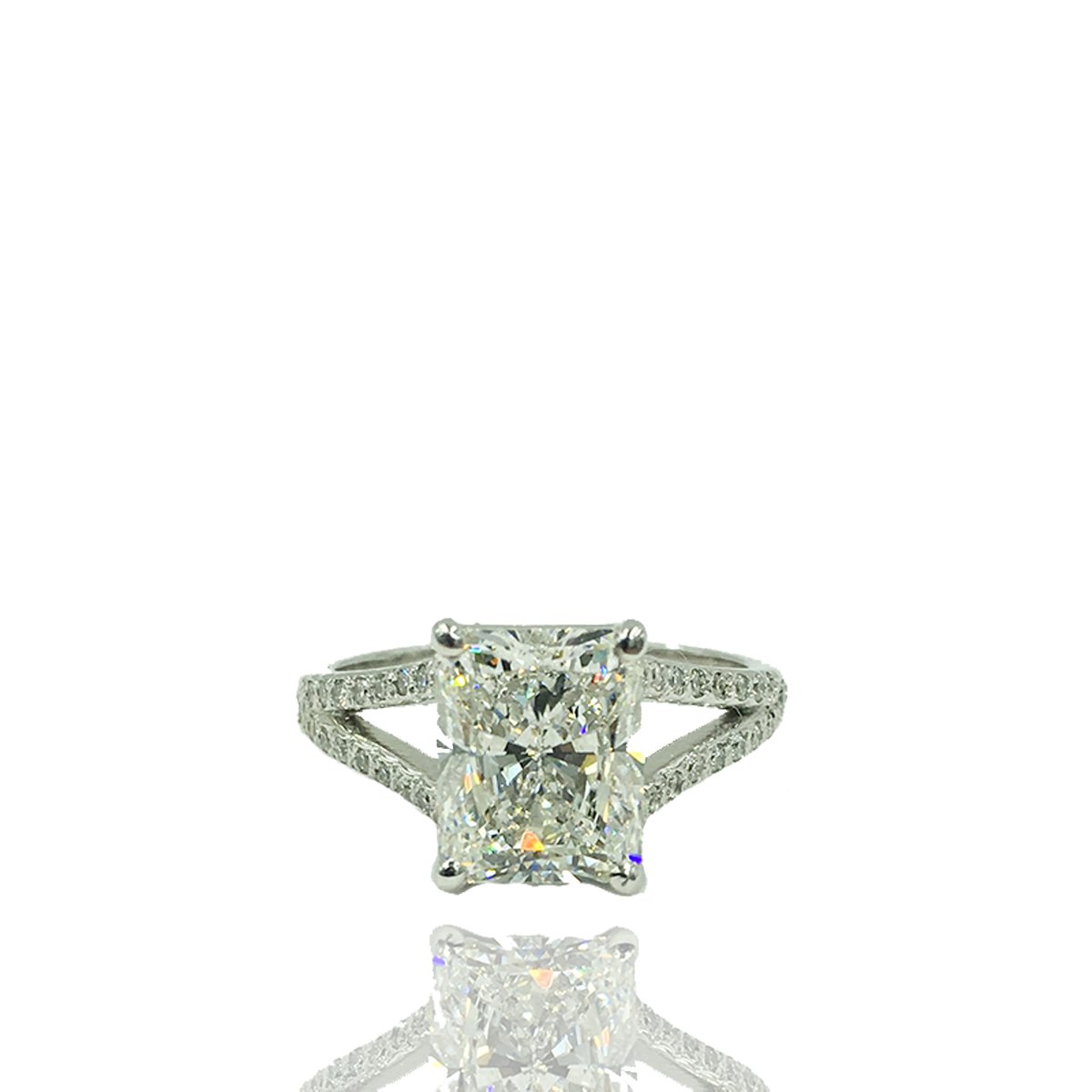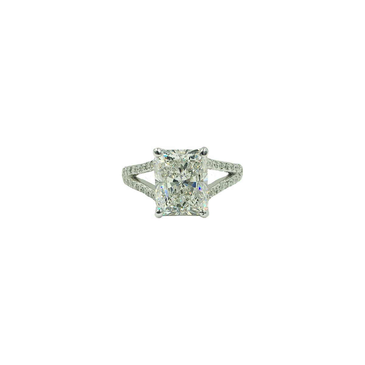 This emerald cut diamond is showcased in a split shank platinum setting. The center stone is a GIA Certified 2.72 Carat Emerald Cut Diamond with a Color Grade F, Clarity Grade VS2. The band features 38 diamonds that are also Color Grade F, Clarity Grade VS2. 32 are 1.0 mm, 6 are 1.3mm, and they combine for a .24 total carat weight.