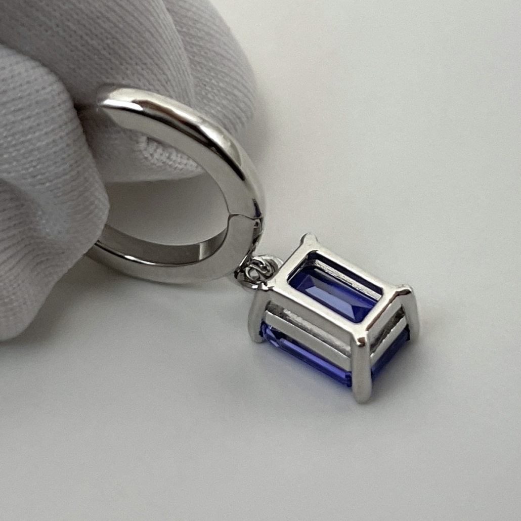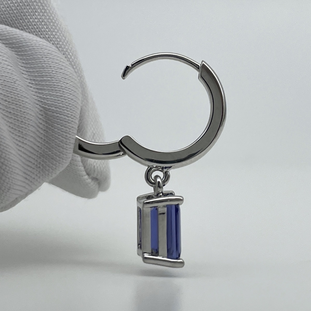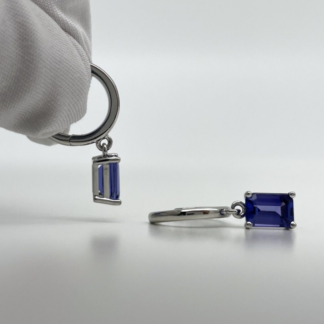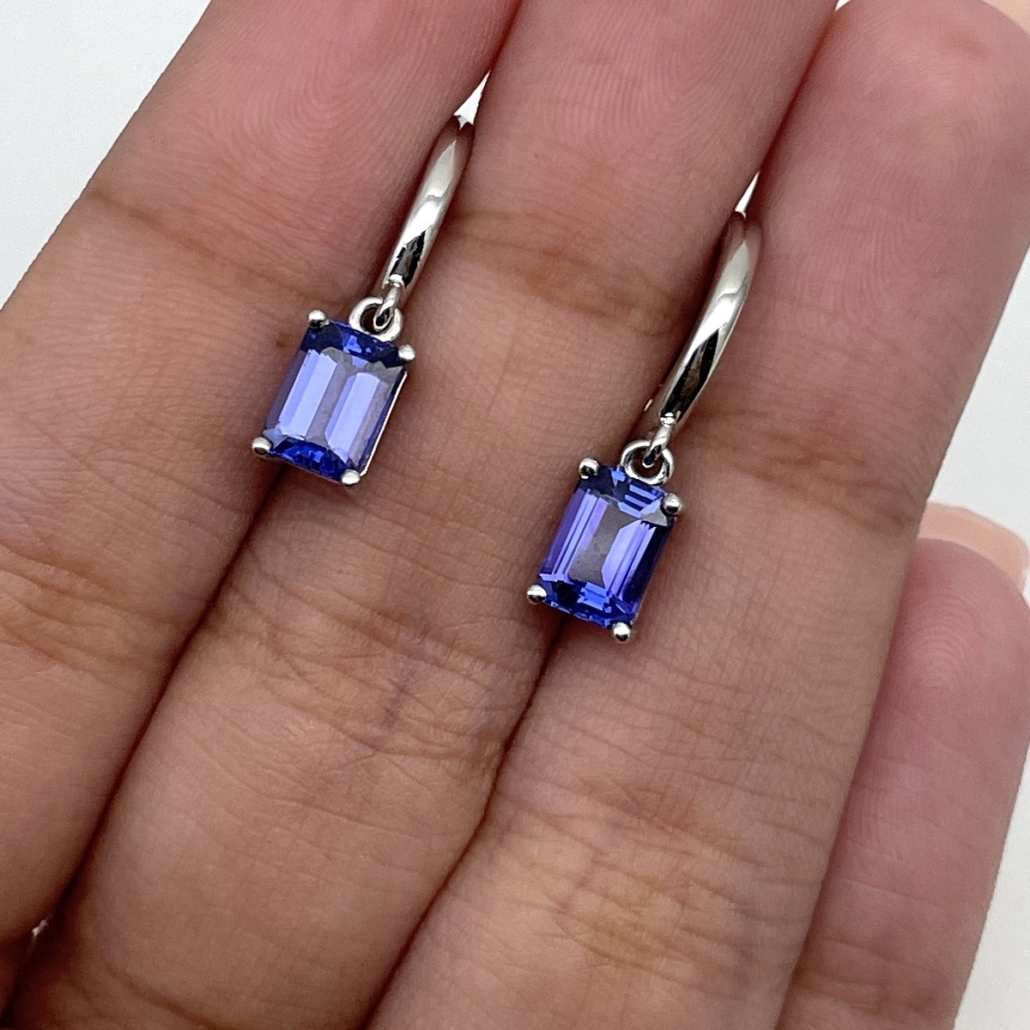 Tags Blue, Dangle, earrings, emerald cut, Four Prong, gemstone, Hoops, Huggies, Platinum, tanzanite