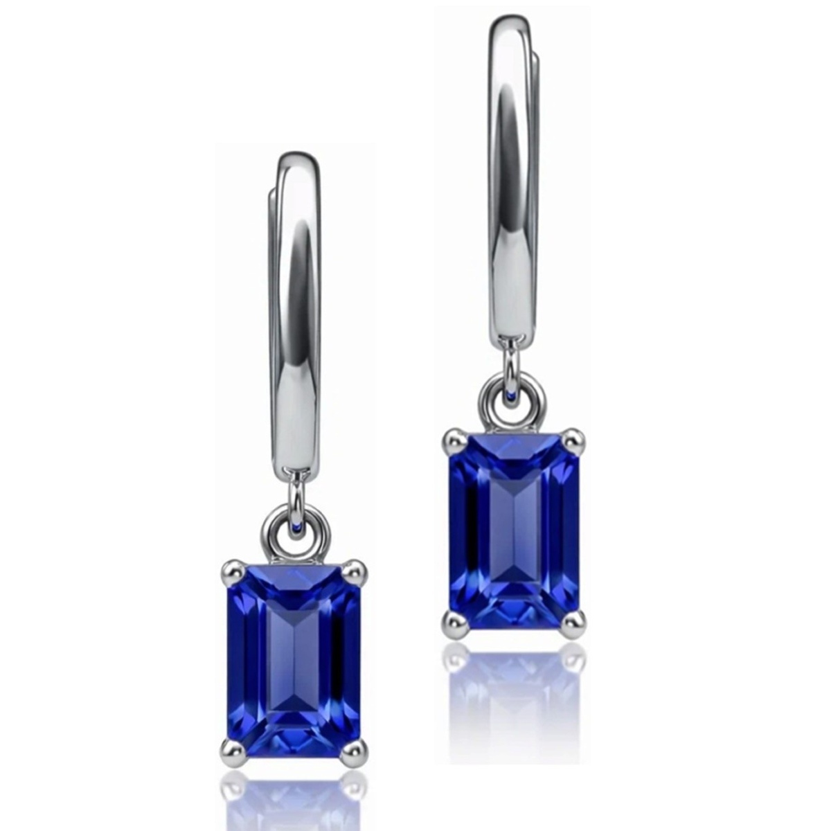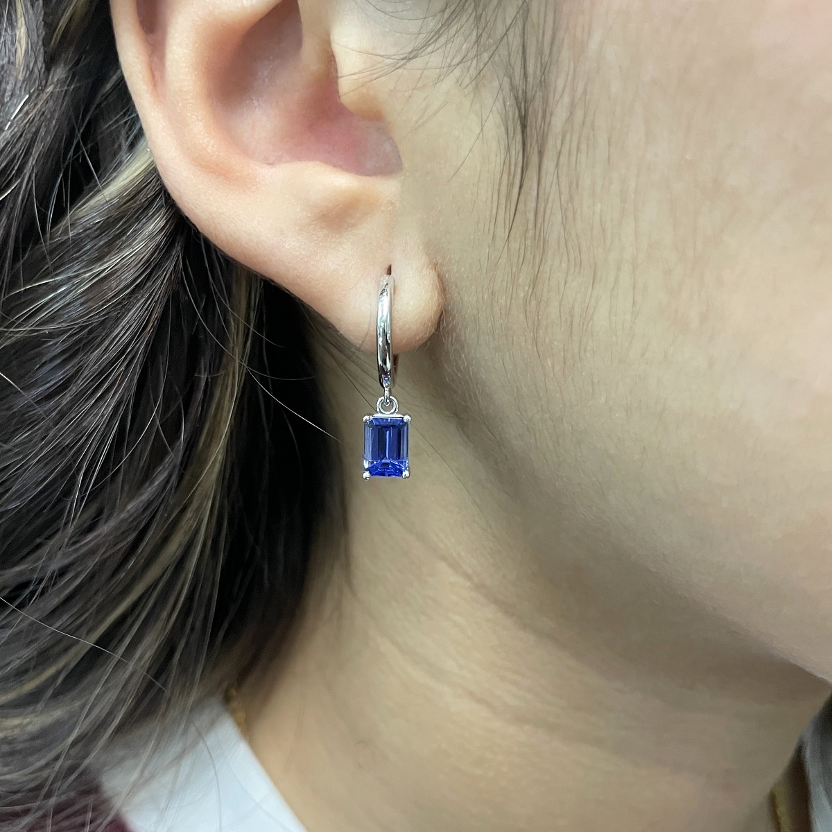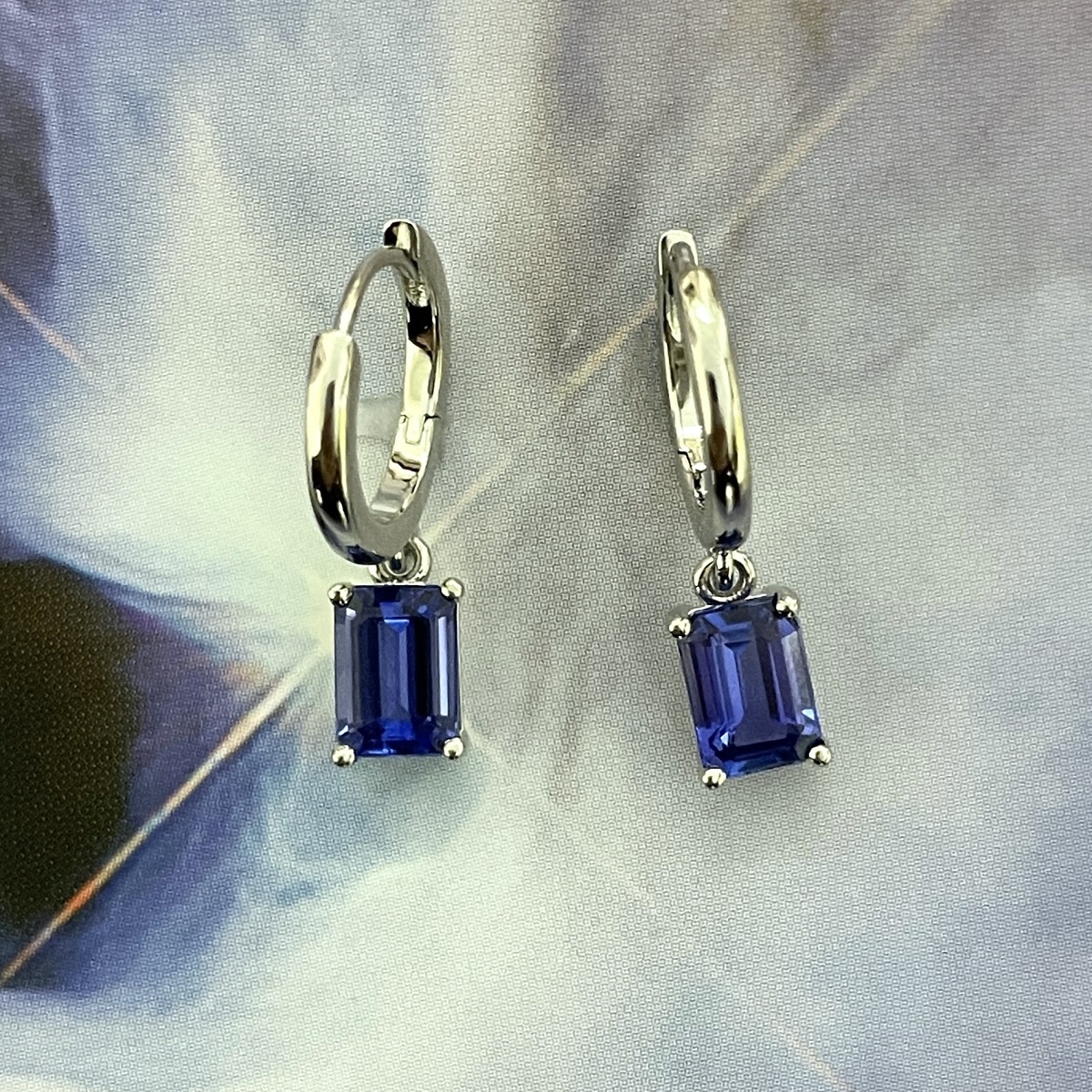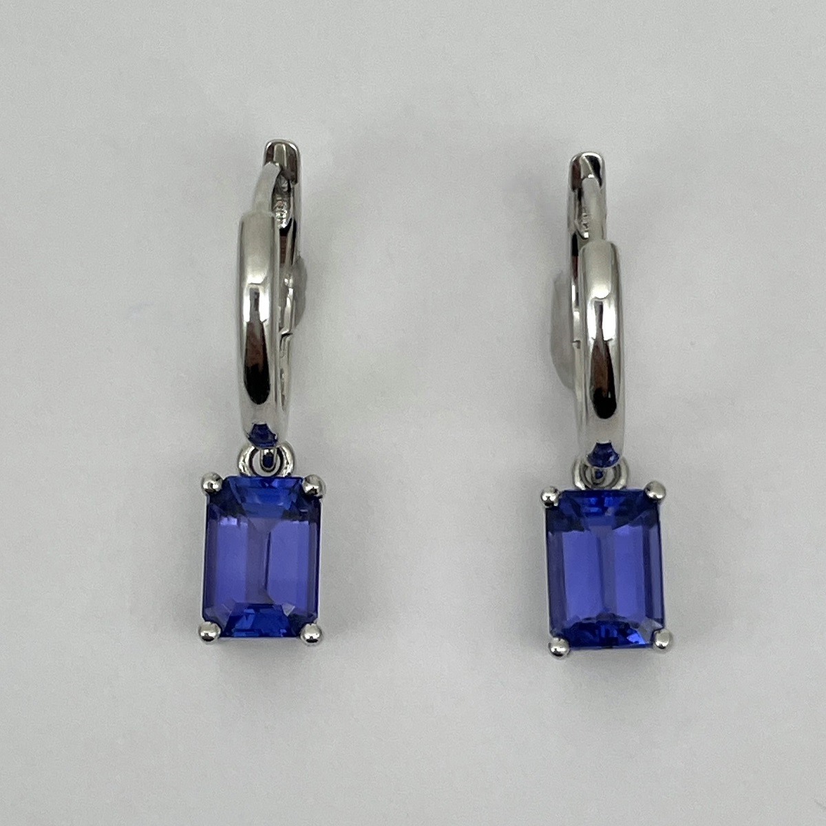 Tags Blue, Dangle, earrings, emerald cut, Four Prong, gemstone, Hoops, Huggies, Platinum, tanzanite