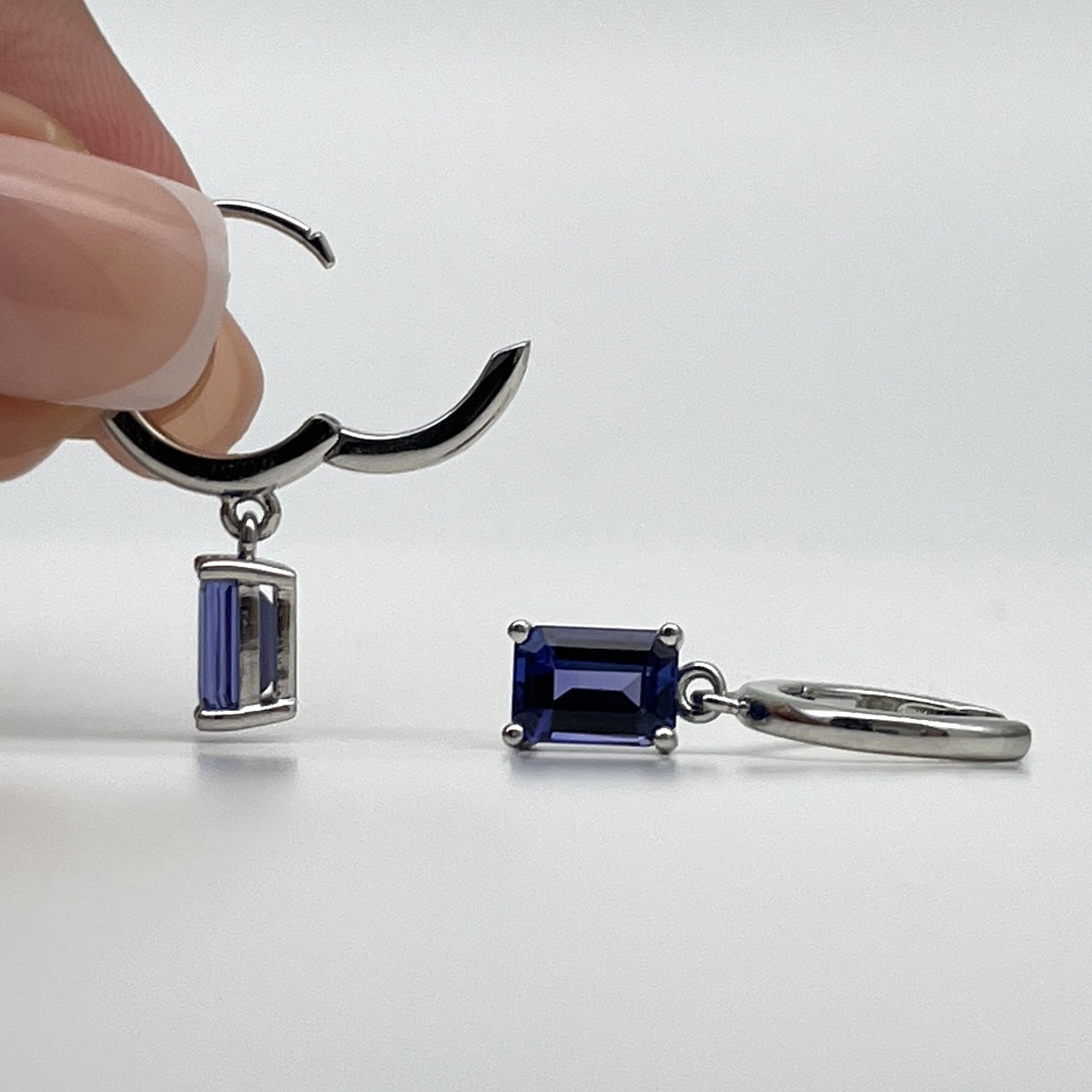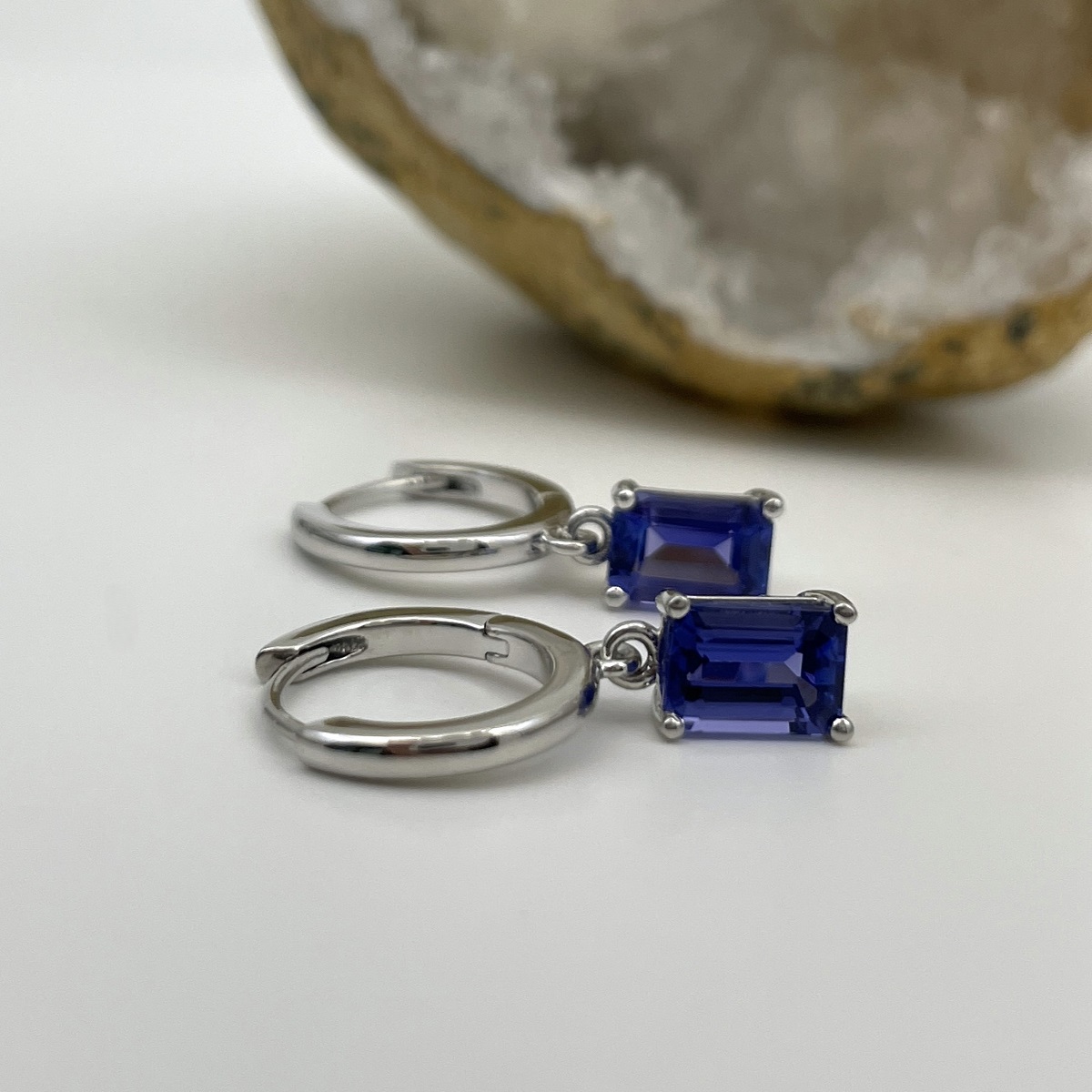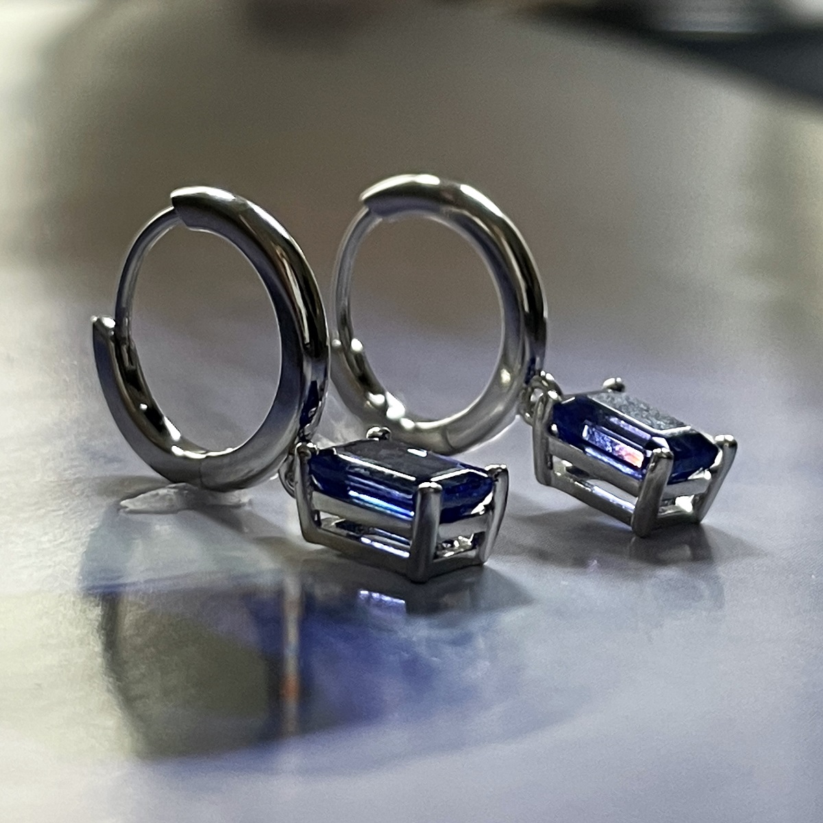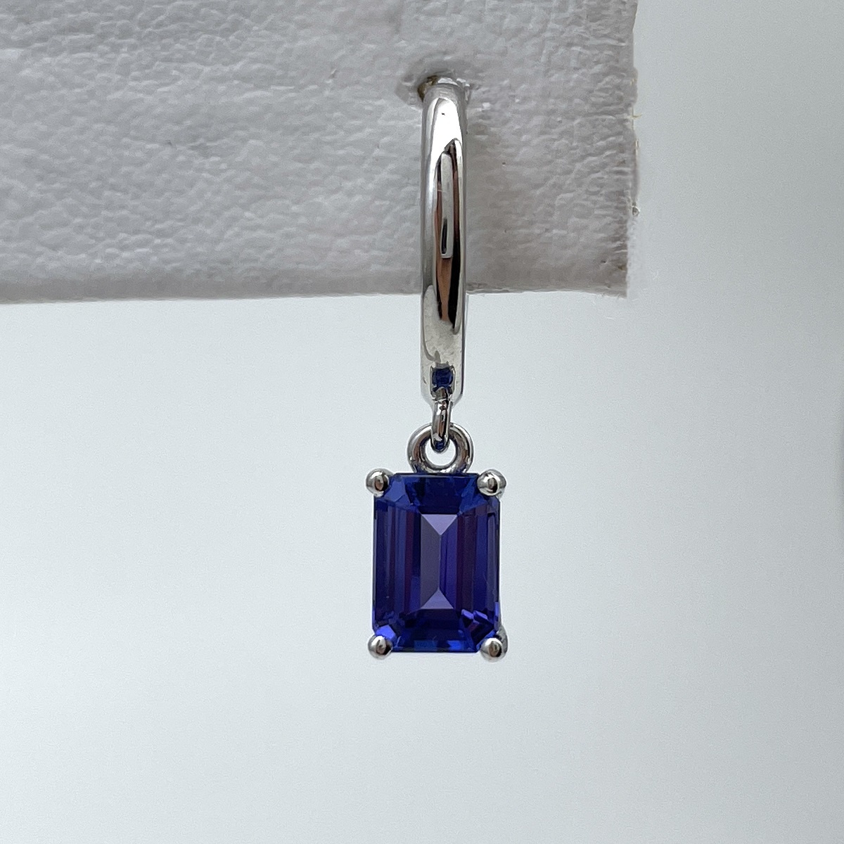 Tags Blue, Dangle, earrings, emerald cut, Four Prong, gemstone, Hoops, Huggies, Platinum, tanzanite