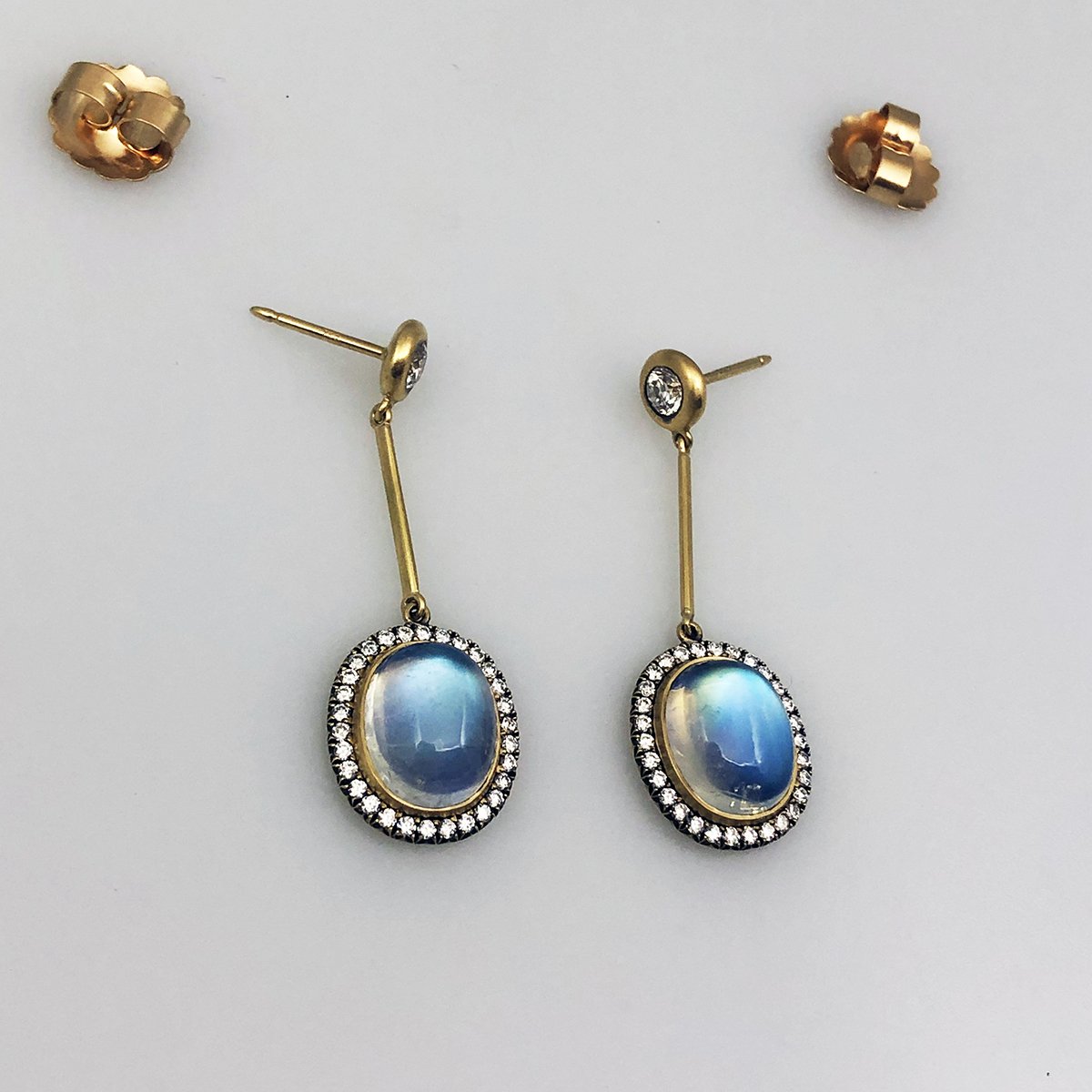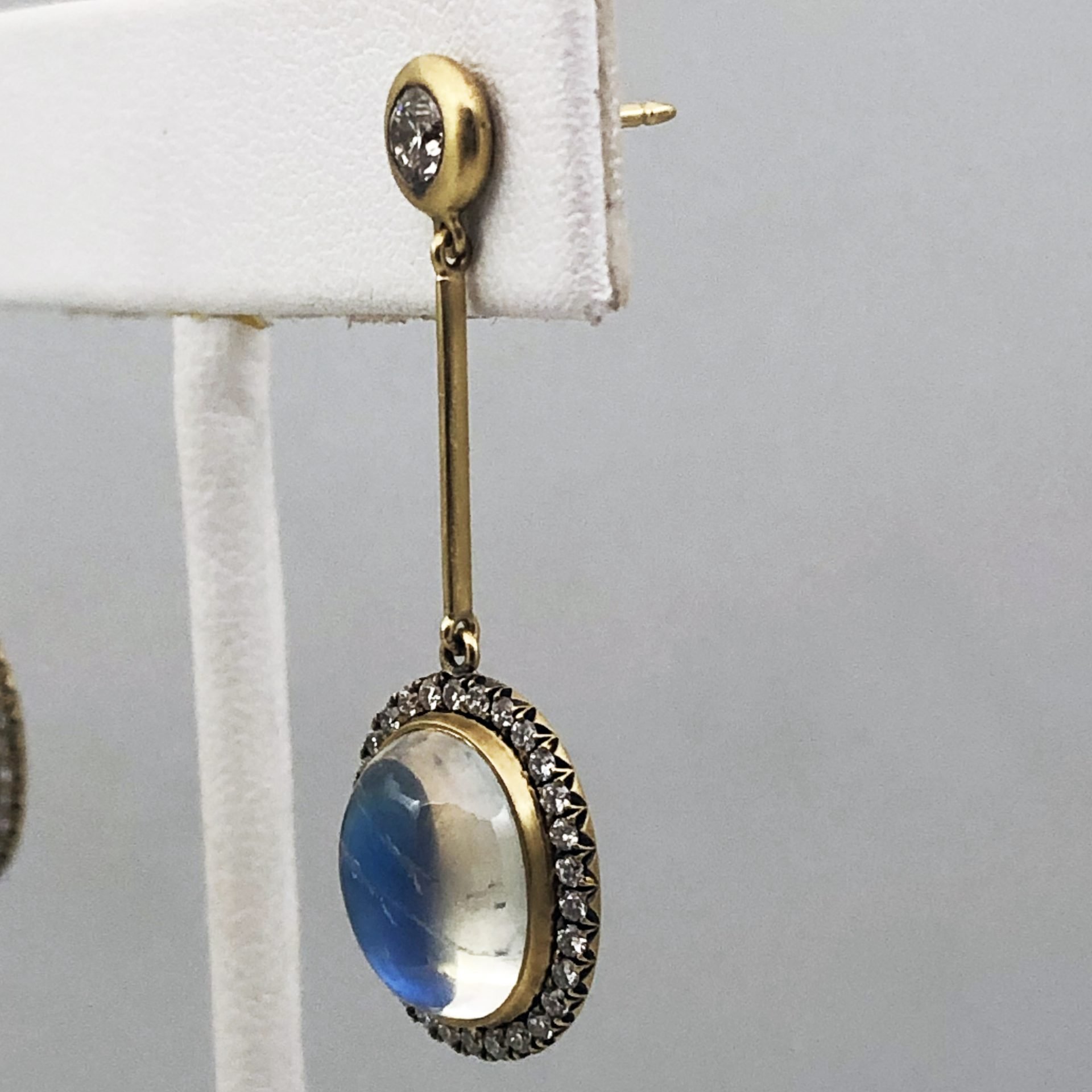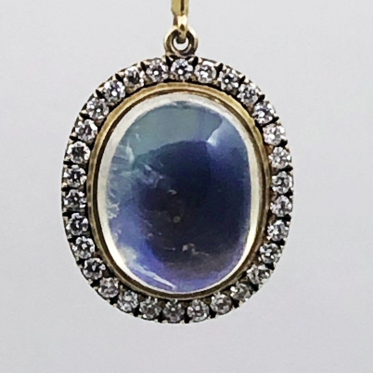 Cabochon Moonstones set in 18K Yellow Gold with a diamond halo. These moonstone drops dangle & shimmer from every angle.