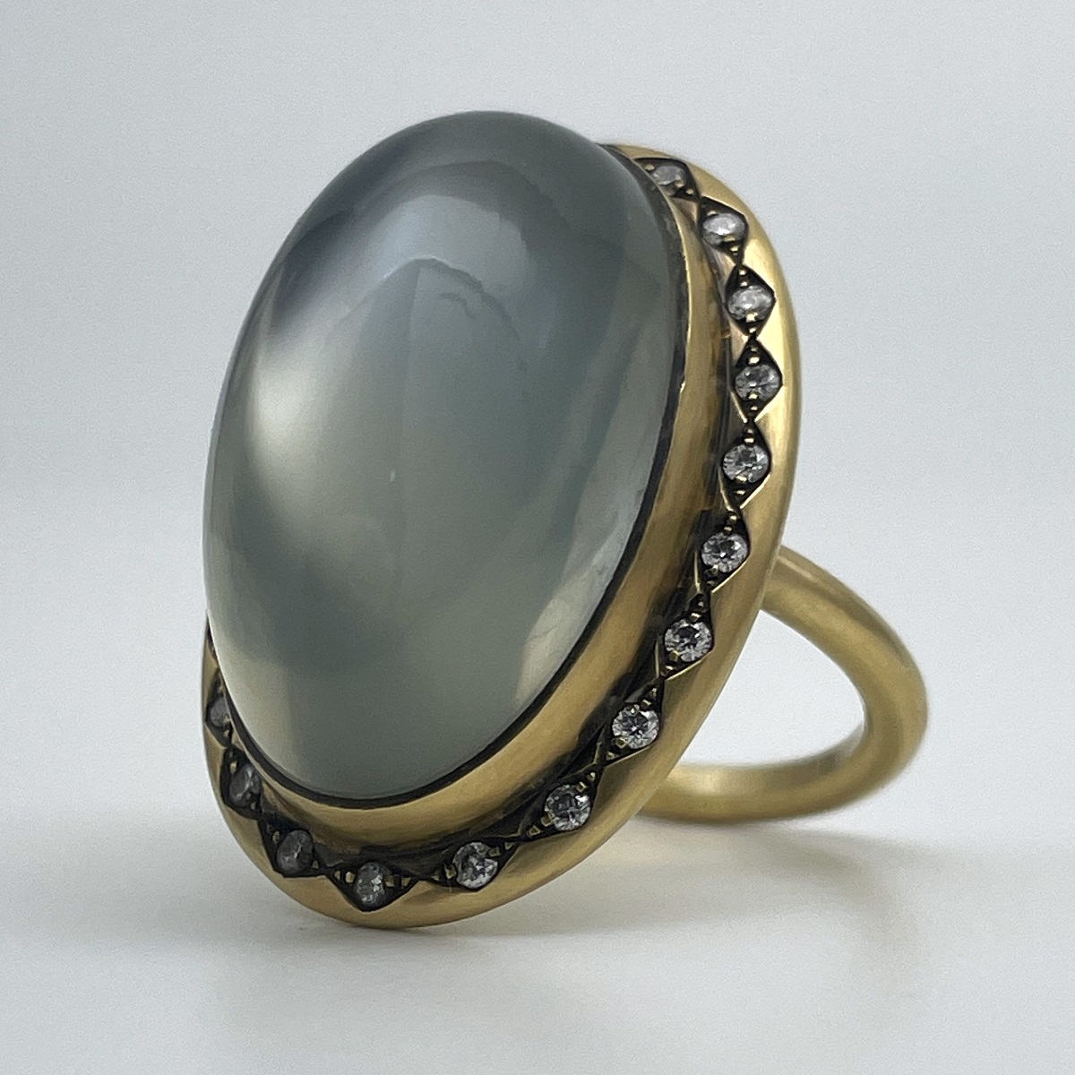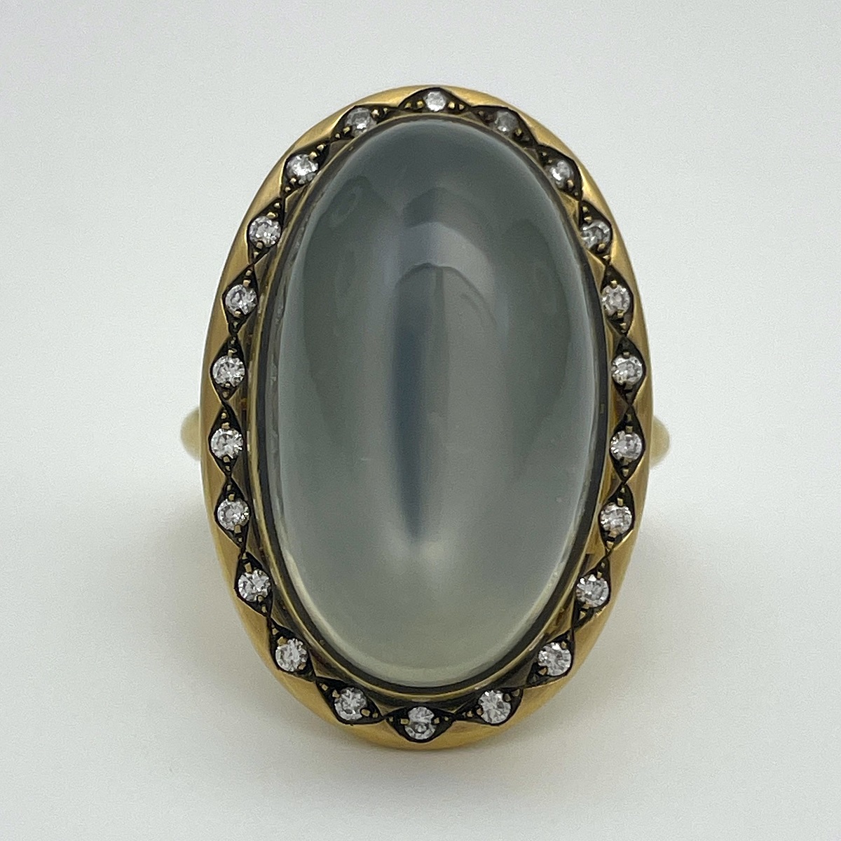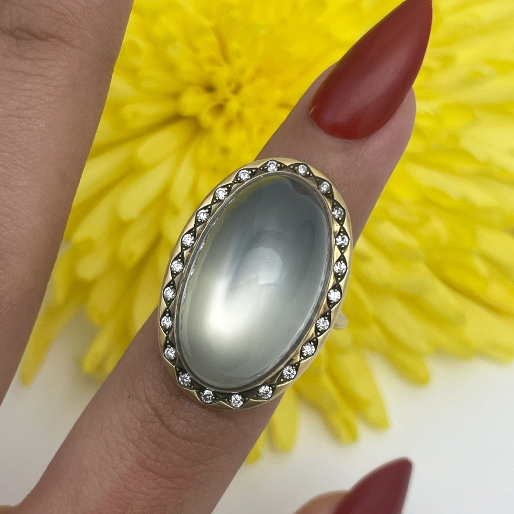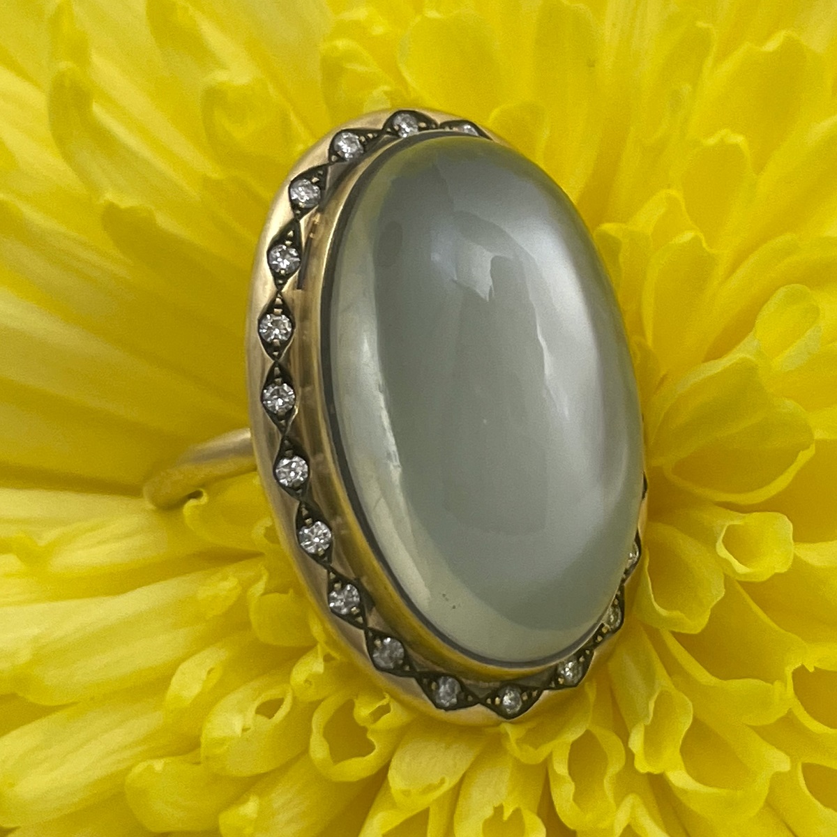 At the heart of this ring is a smooth oval moonstone, its misty sheen shifting with every movement. Surrounded by a border of bright white diamonds and set in rich yellow gold.