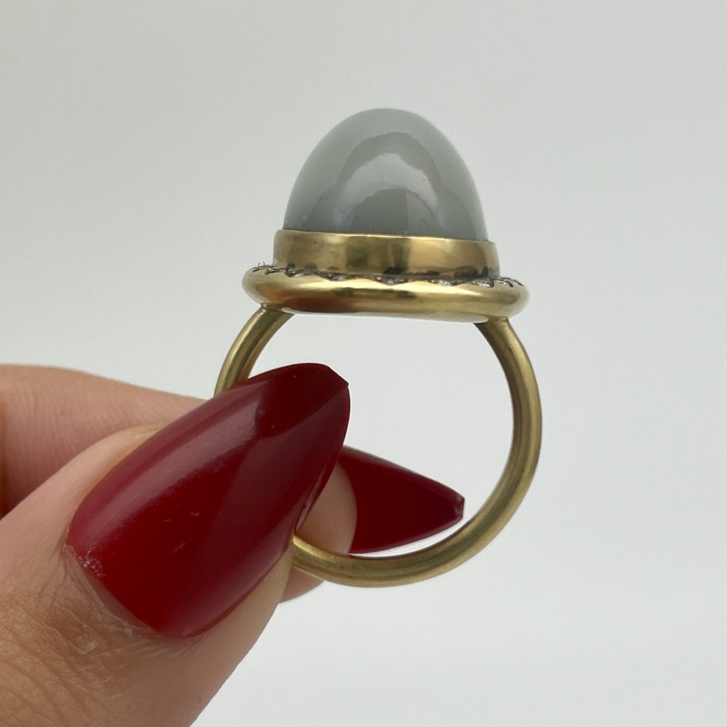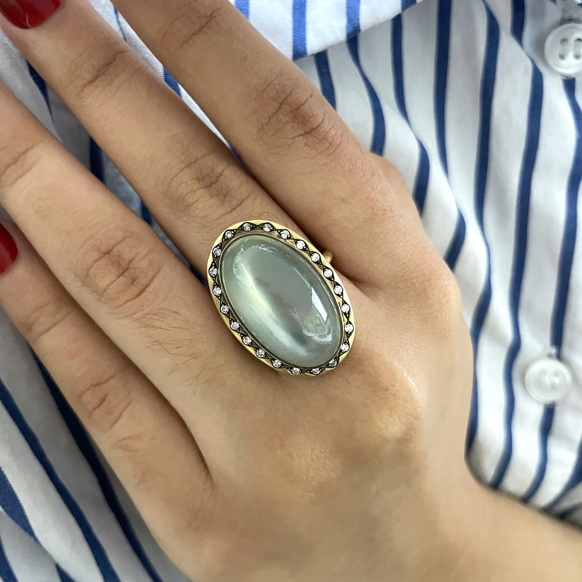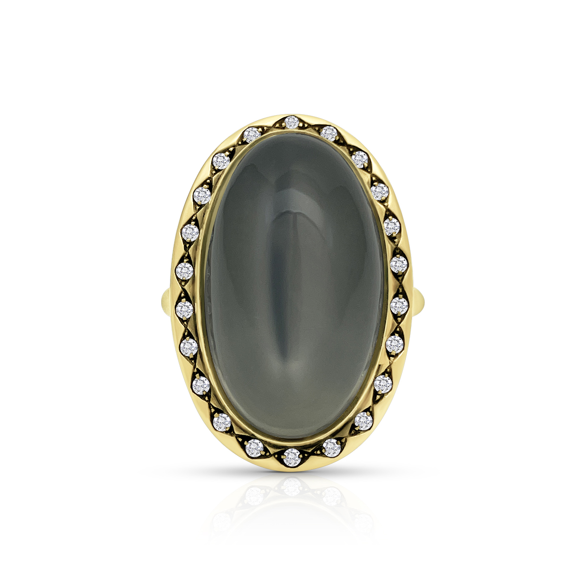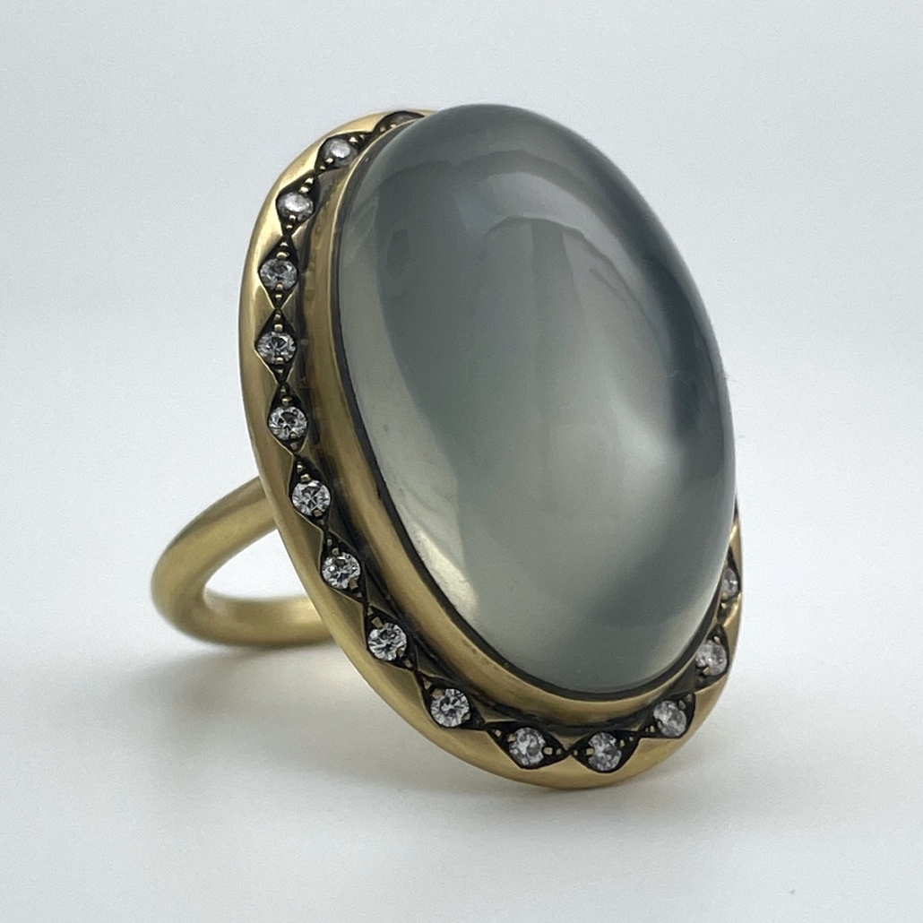At the heart of this ring is a smooth oval moonstone, its misty sheen shifting with every movement. Surrounded by a border of bright white diamonds and set in rich yellow gold.