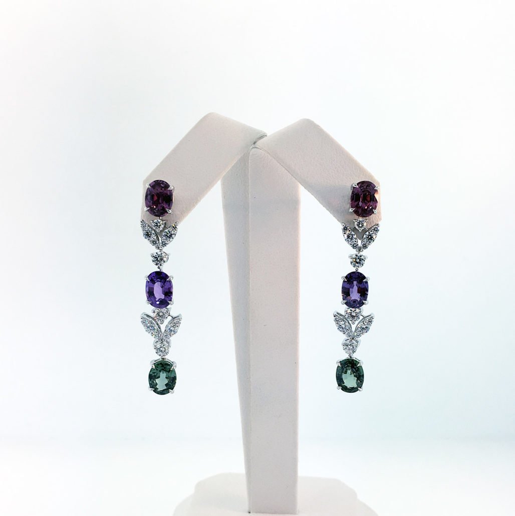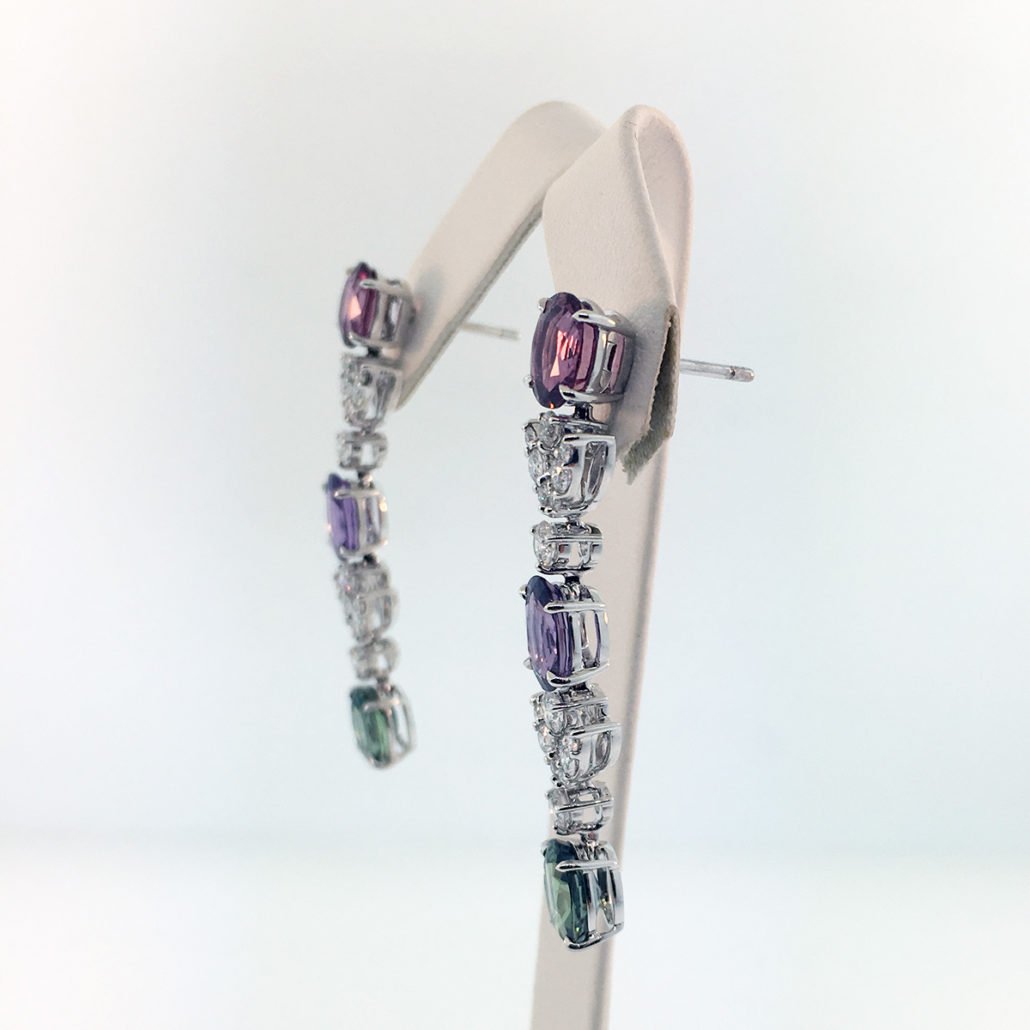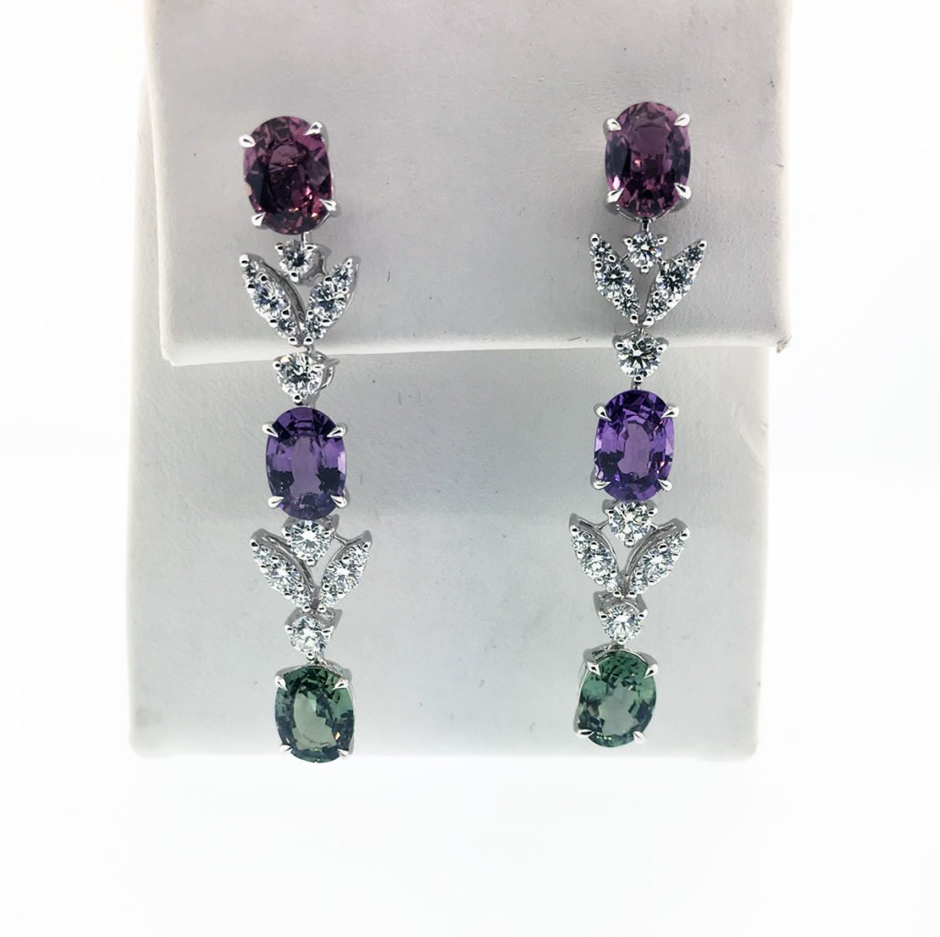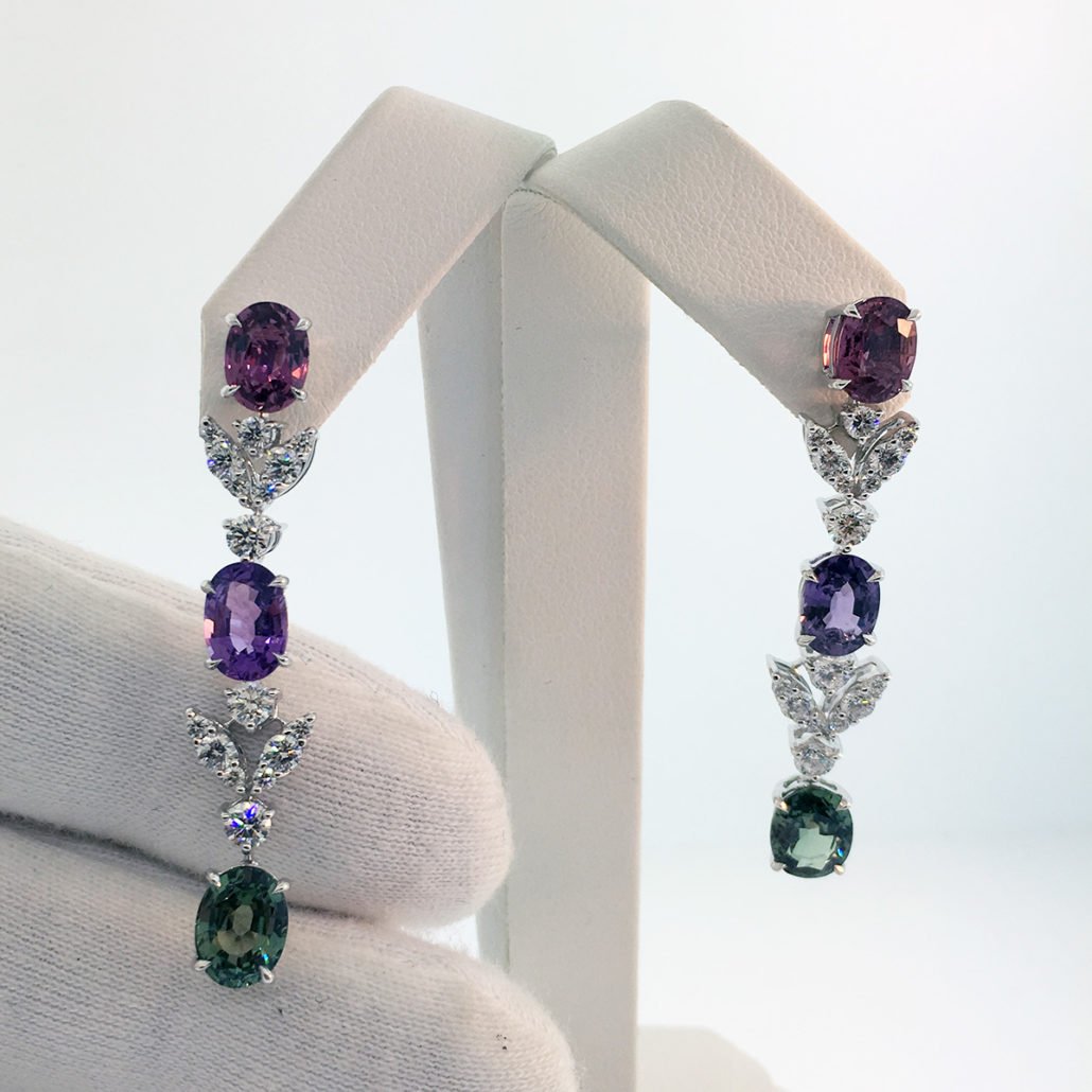 Some days call for a splash of color, and these dangling earrings with pink, purple and green oval sapphires are the perfect way to brighten up your day. Diamond leaves between the stones create an unforgettable sparkle!