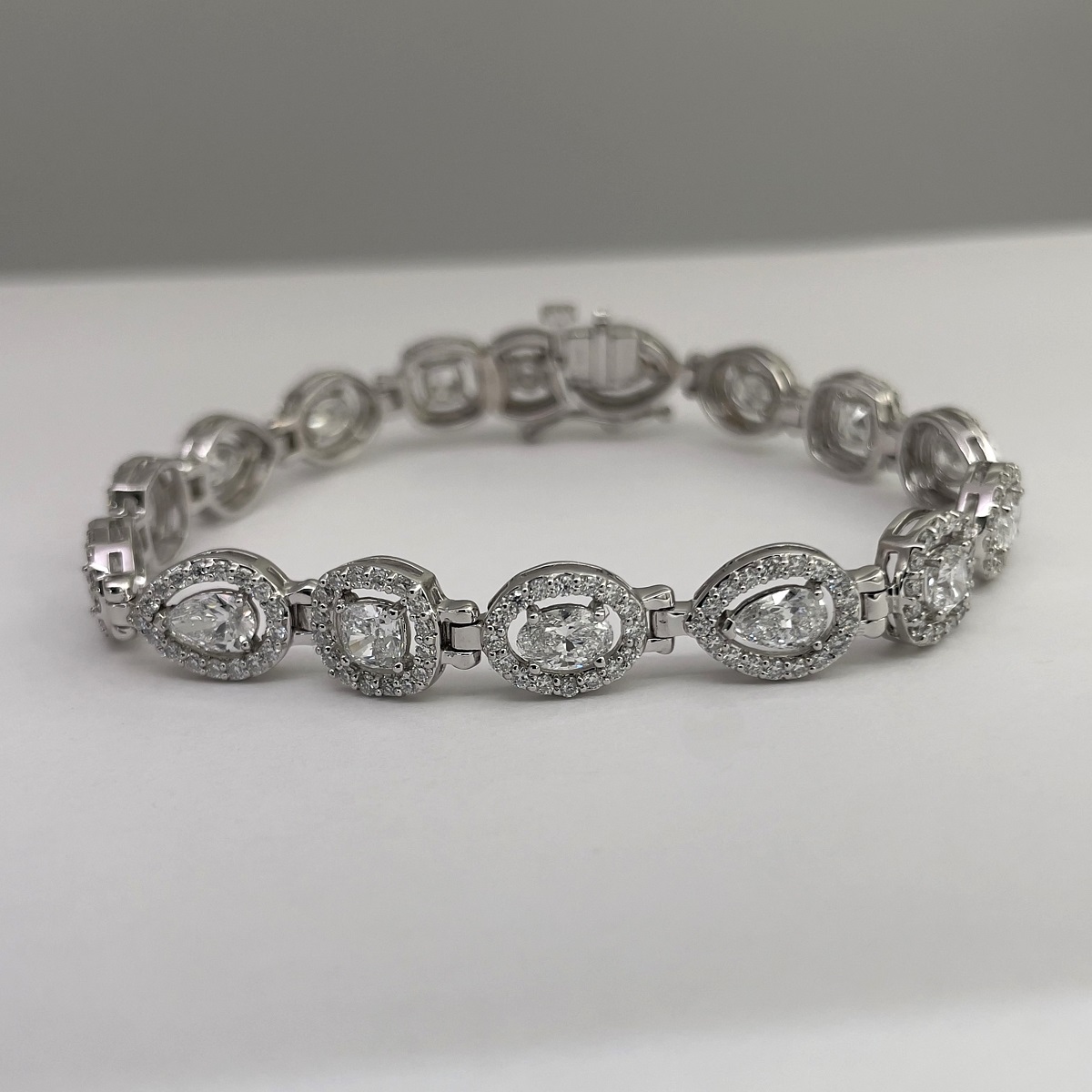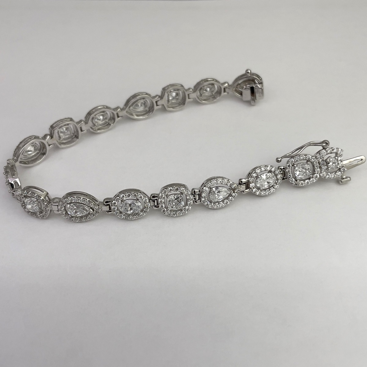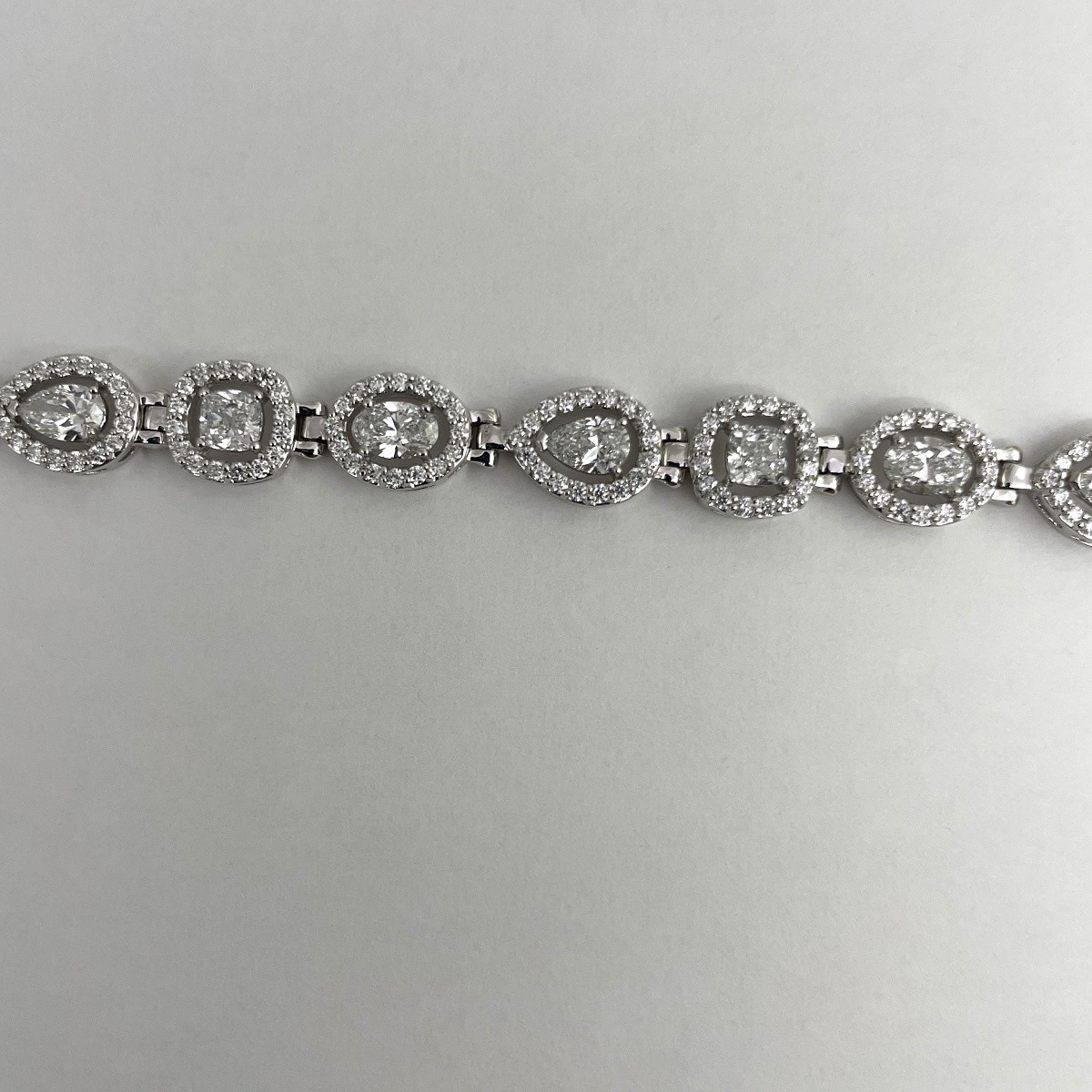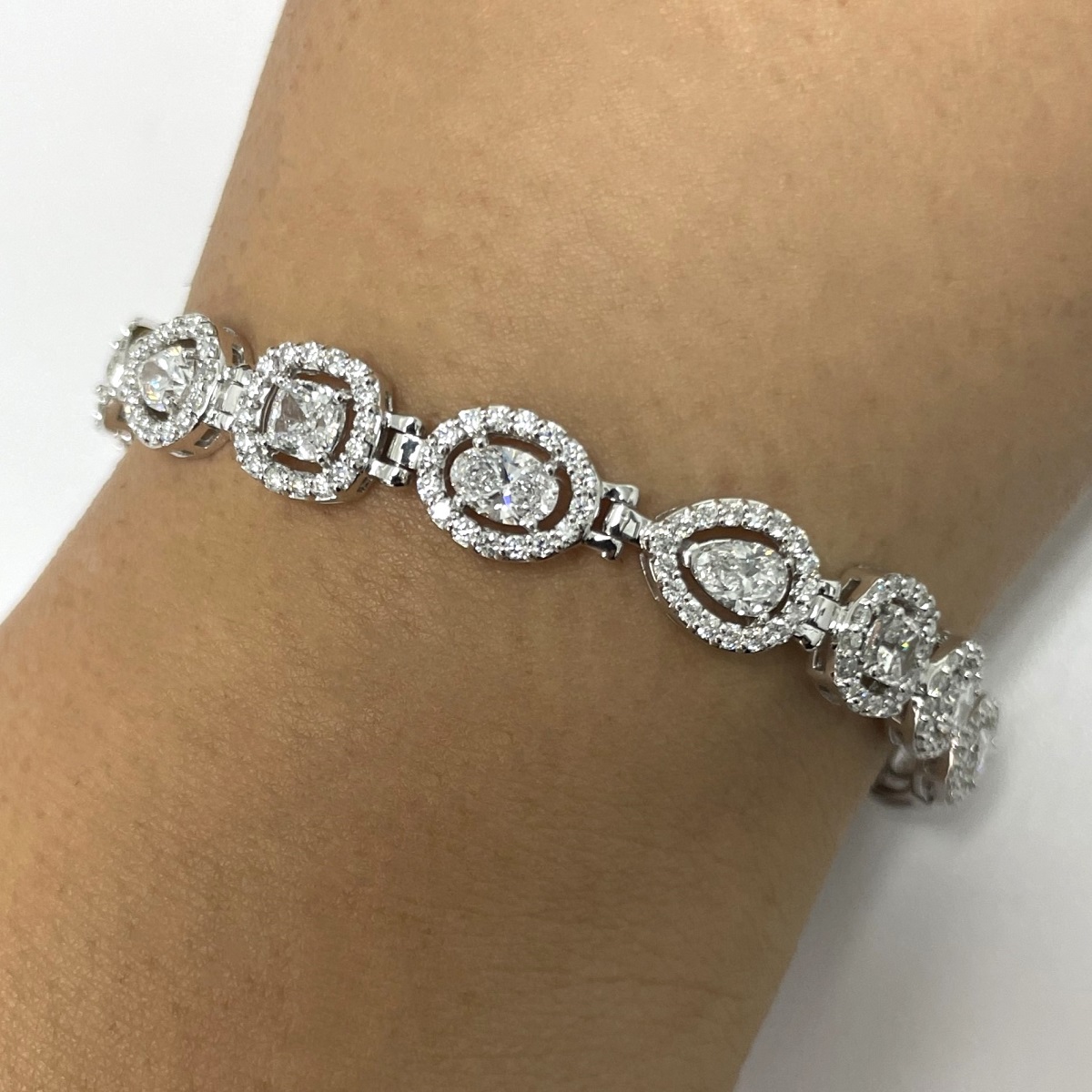 Behold! The multiple diamond shapes of pear shaped, oval cut and cushion cut, glittering around your wrist.  The interplay of shapes and textures come together harmoniously to create this masterpiece of fine jewelry.