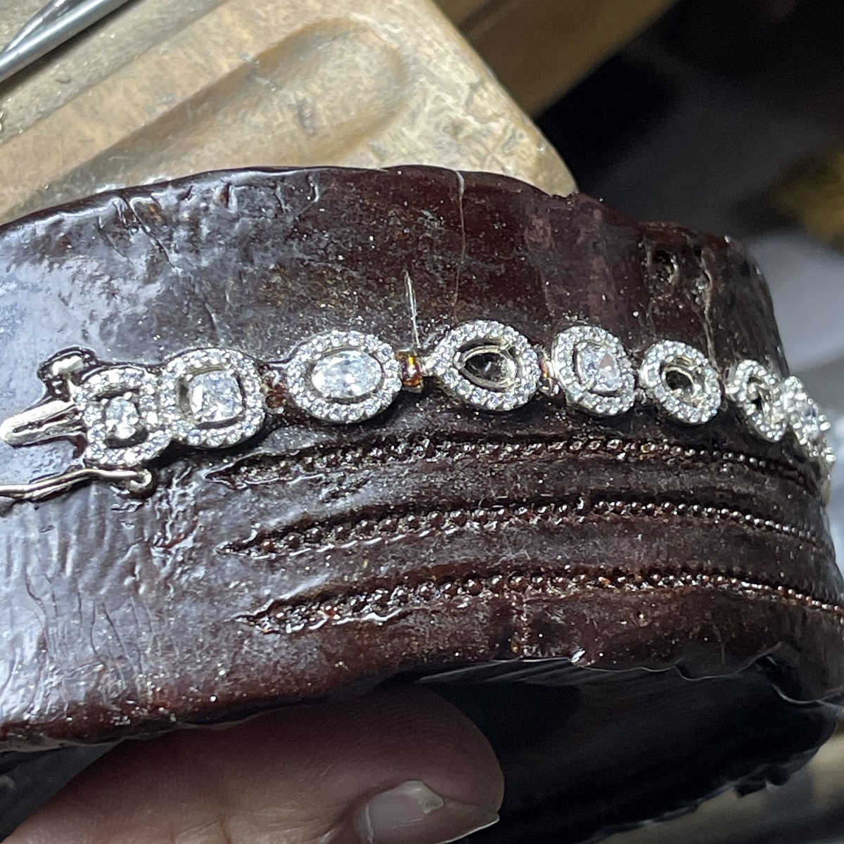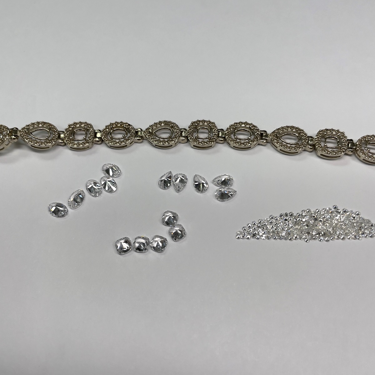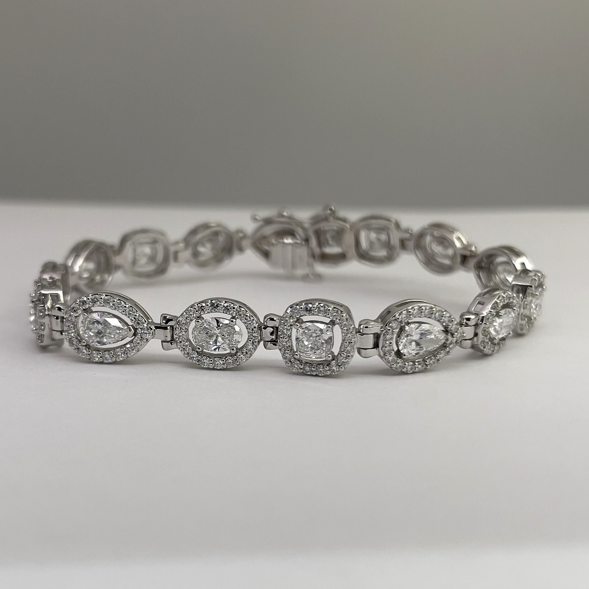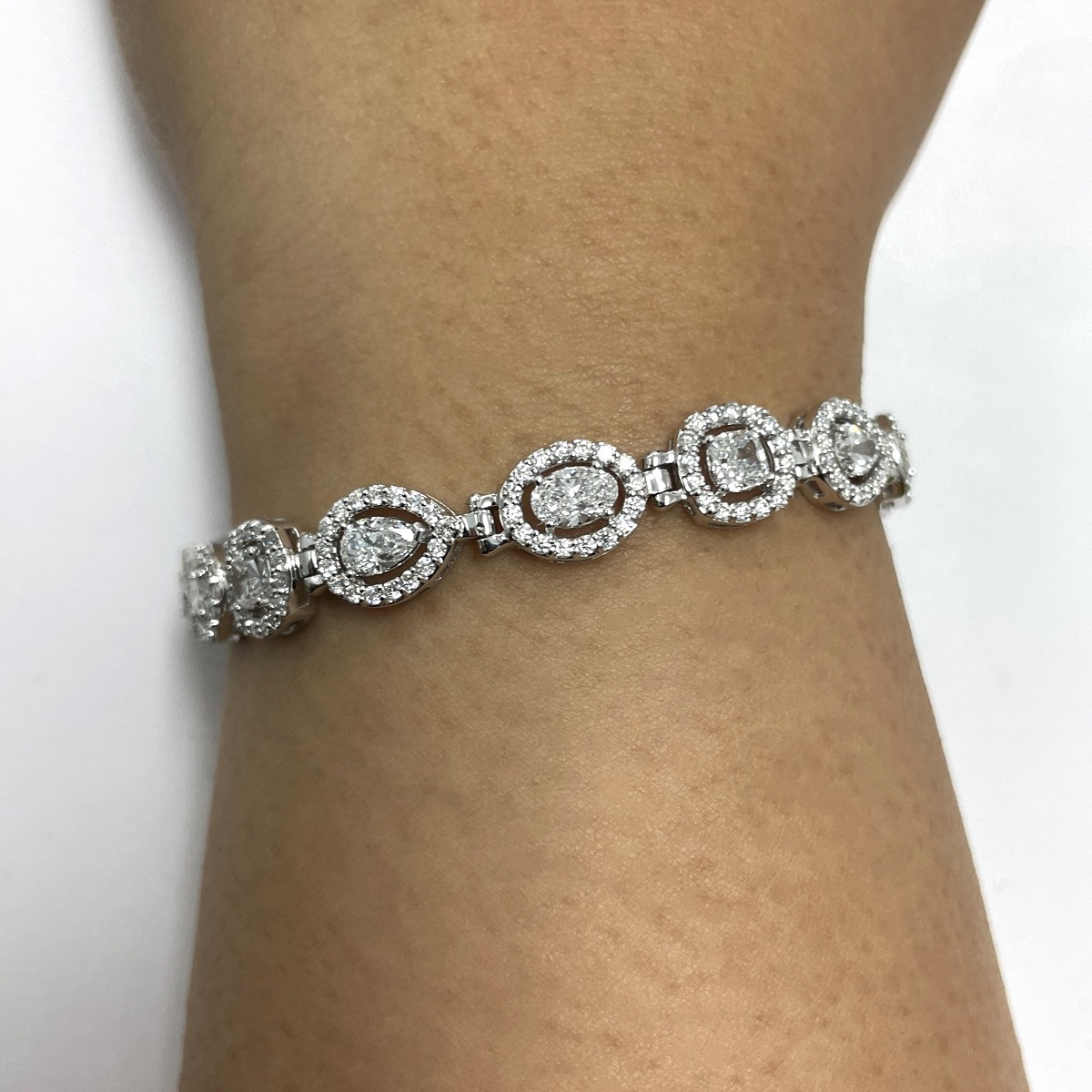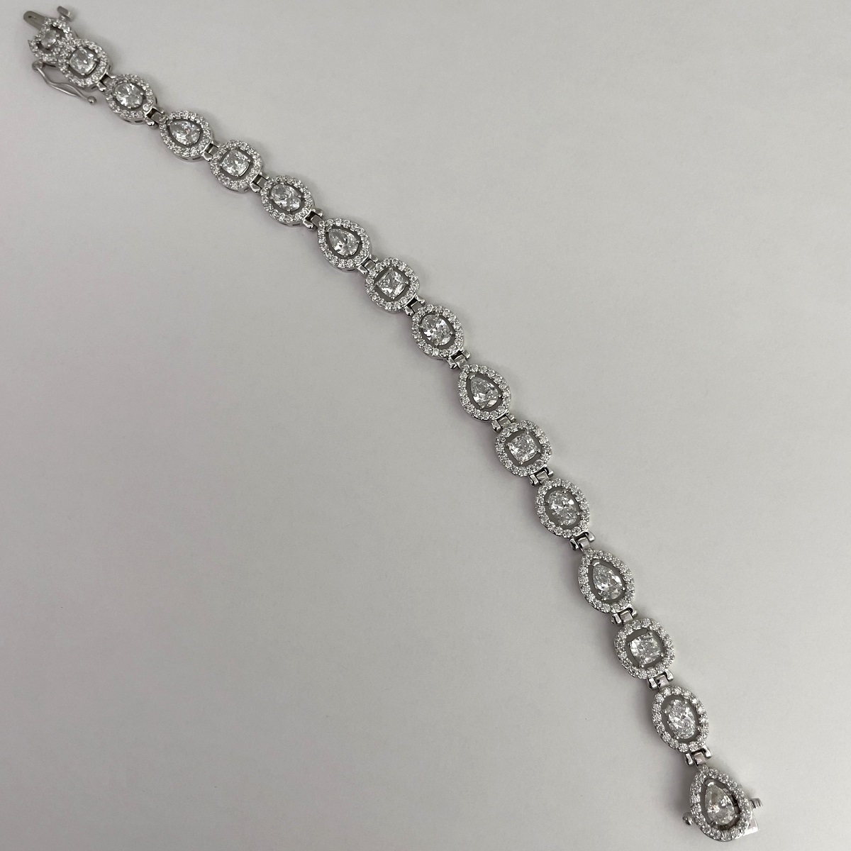Behold! The multiple diamond shapes of pear shaped, oval cut and cushion cut, glittering around your wrist.  The interplay of shapes and textures come together harmoniously to create this masterpiece of fine jewelry.