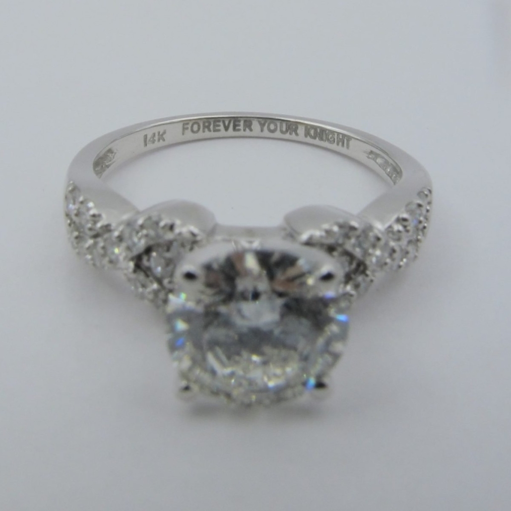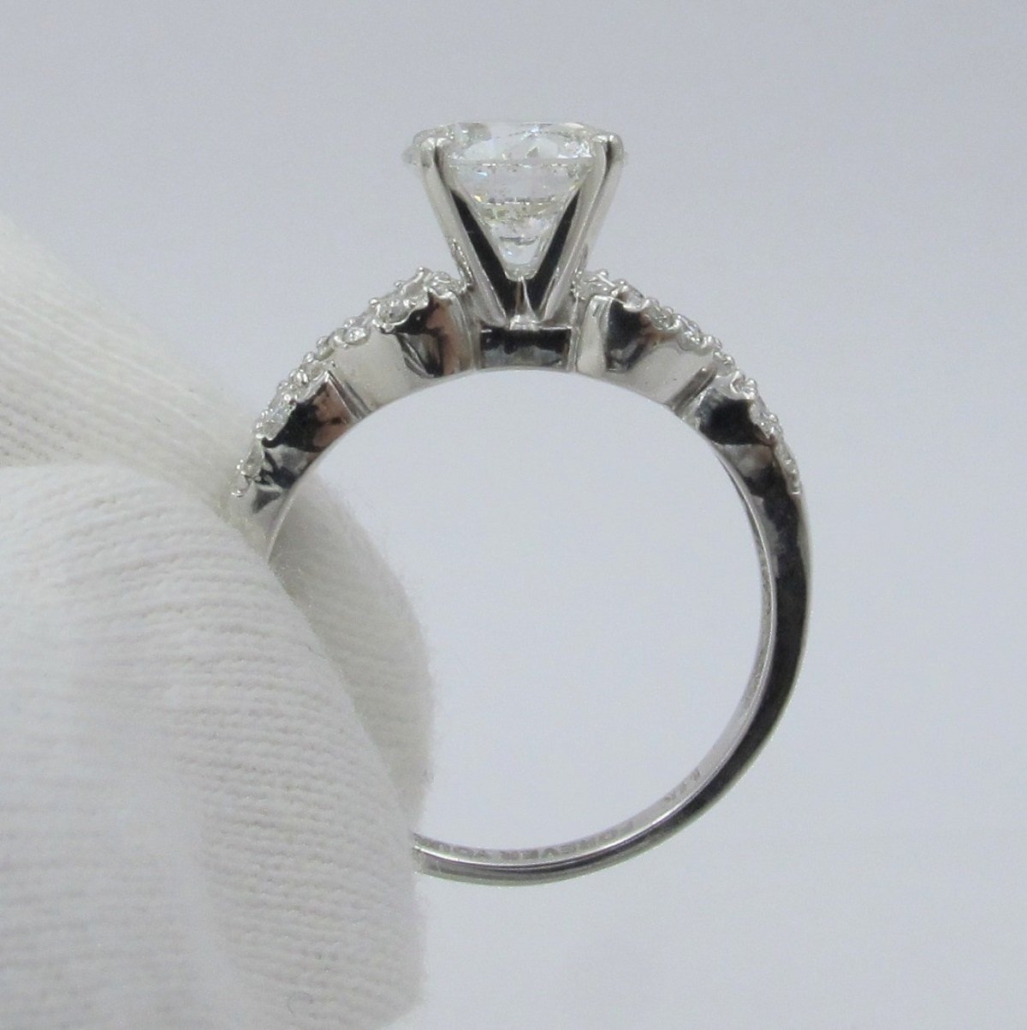 This engagement ring is 14k plumb white gold natural round brilliant diamond. The the split shank of this ring is set with small natural round brilliant diamonds, half way across.