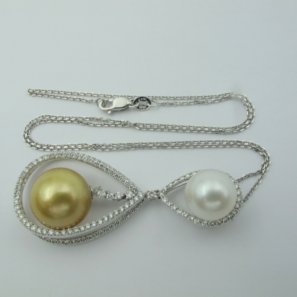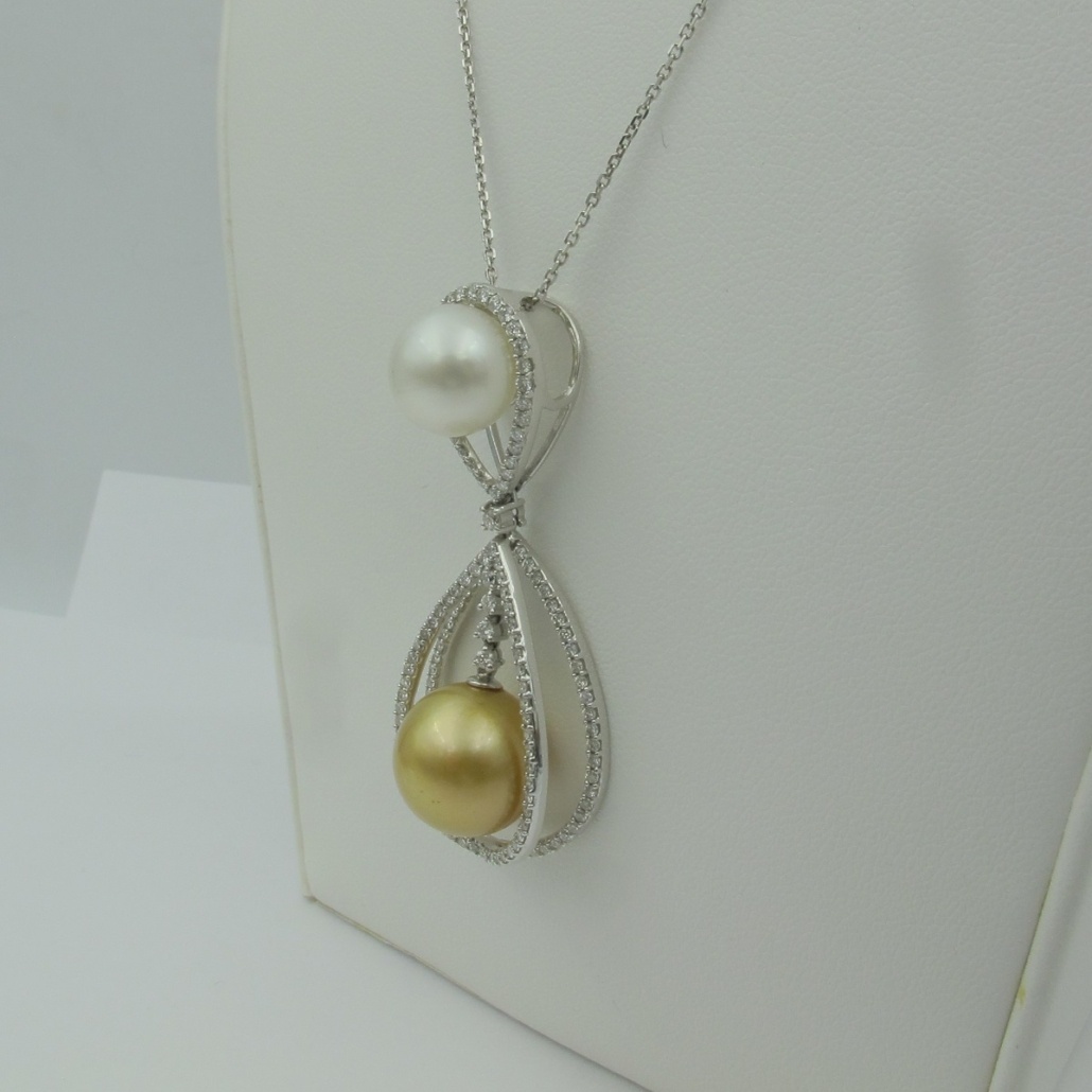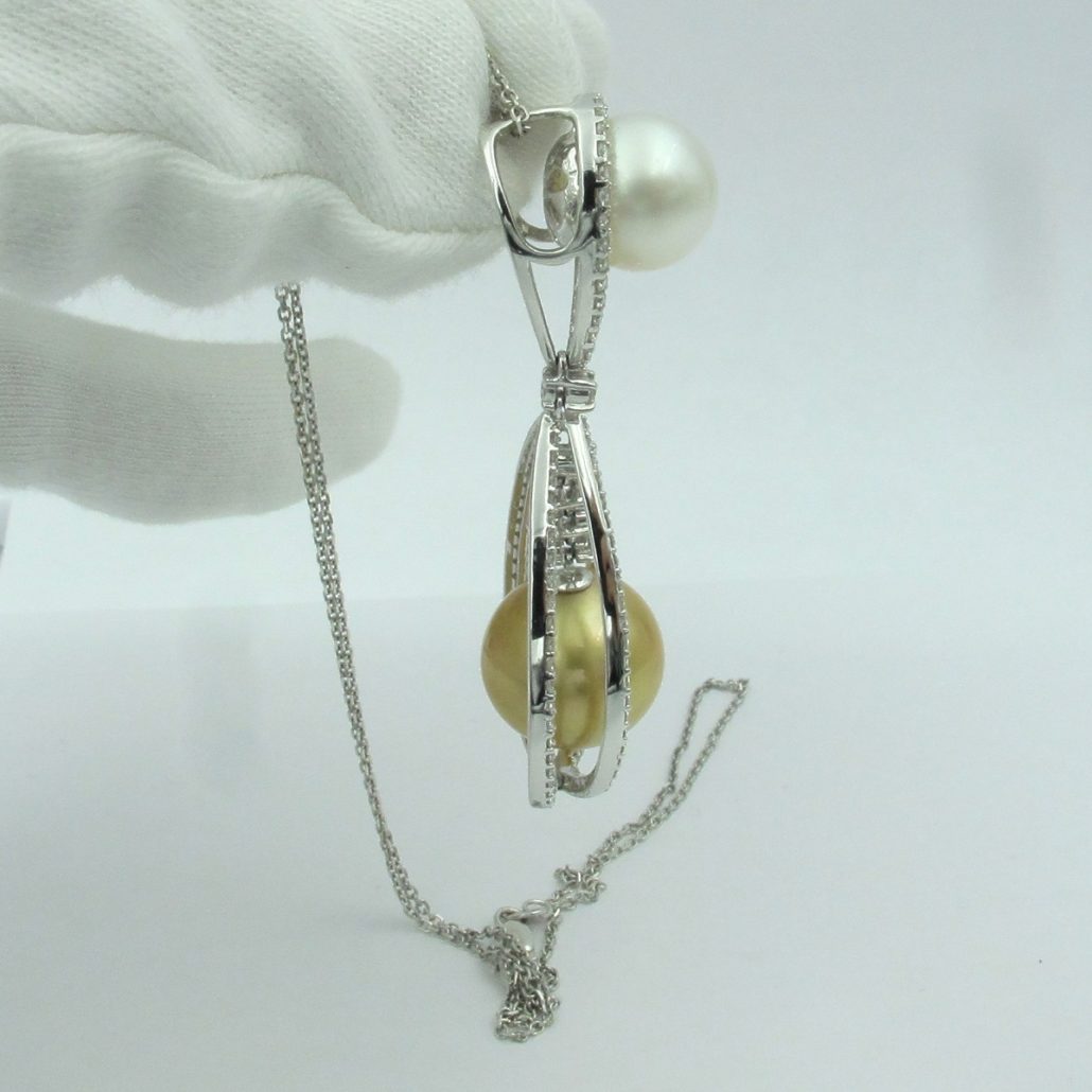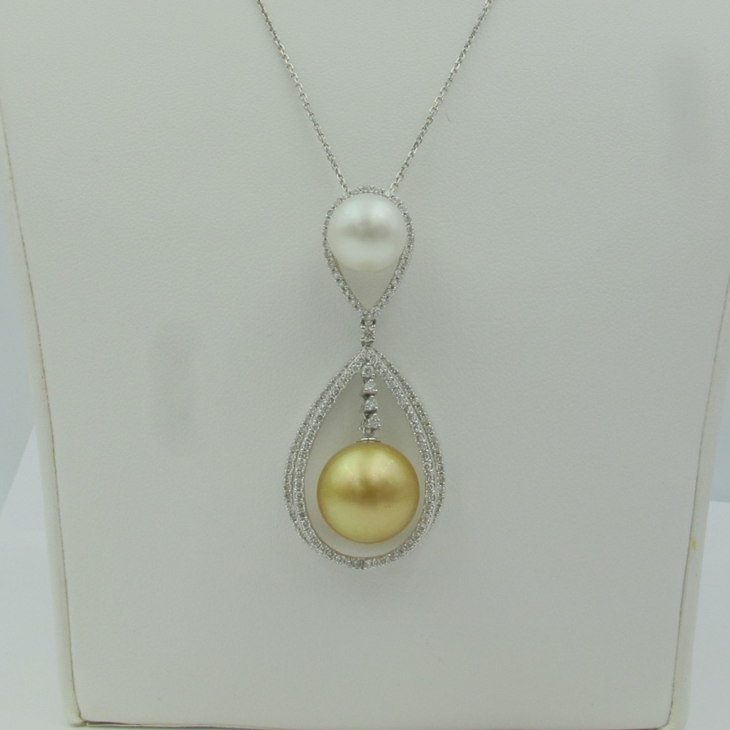 This pearl pendant features an 11mm white south sea pearl and a 14mm yellow south sea pearl. They are both inside of teardrop shaped frames that are four prong set with diamonds. The gold south sea pearl is dangling from a diamond link chain.