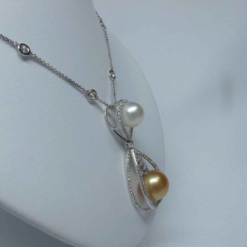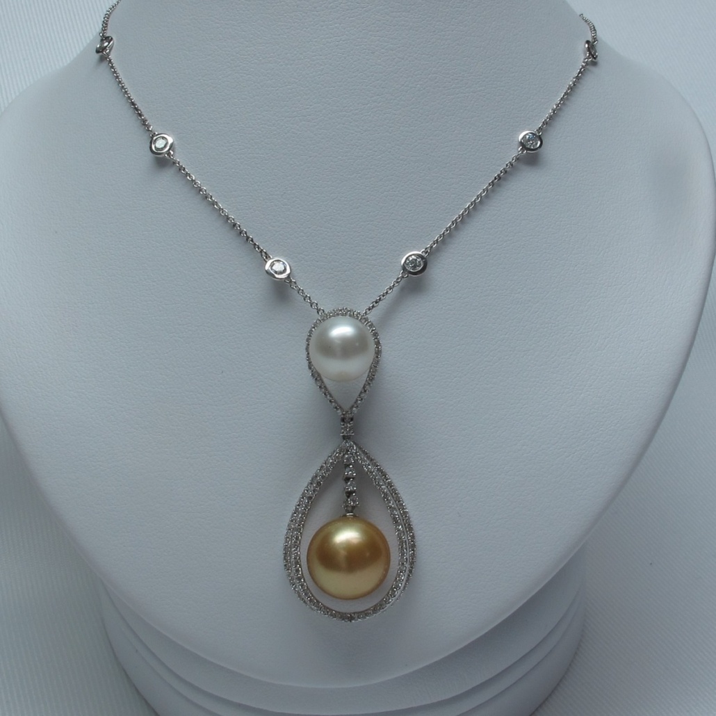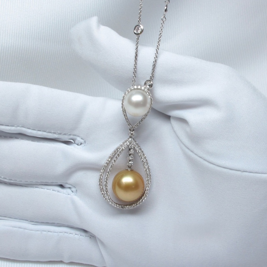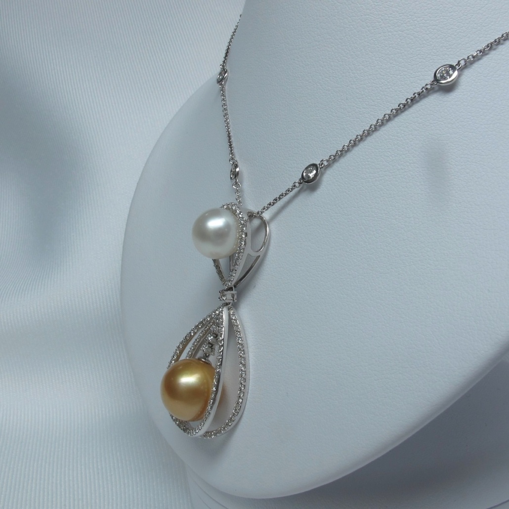 This pearl pendant features an 11mm white south sea pearl and a 14mm yellow south sea pearl. They are both inside of teardrop shaped frames that are four prong set with diamonds. The gold south sea pearl is dangling from a diamond link chain.