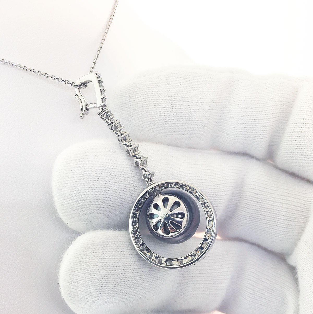 This 18K White Gold Pendant cradles a 12.90 mm natural Black Tahitian pearl surrounded by thirty nine natural round brilliant diamonds. The diamonds encircling the pearl are graduated in size, with the largest at the bottom of the pendant. The diamonds range in size from 1.7mm to 2.0mm. The long bail of this pendant dangles freely, and diamonds are prong set on the bail as well.