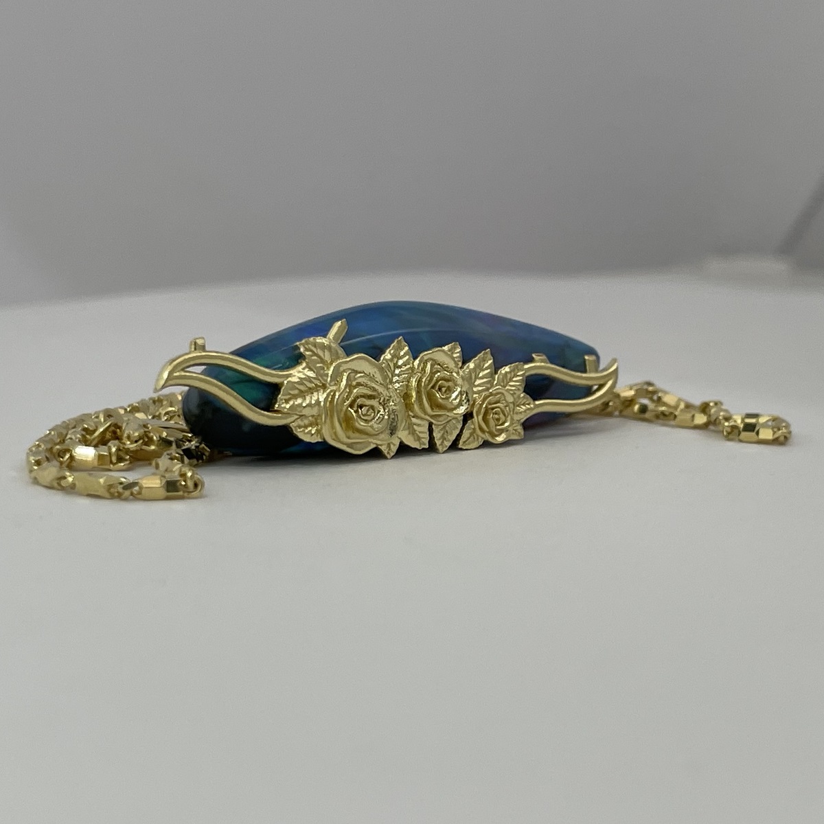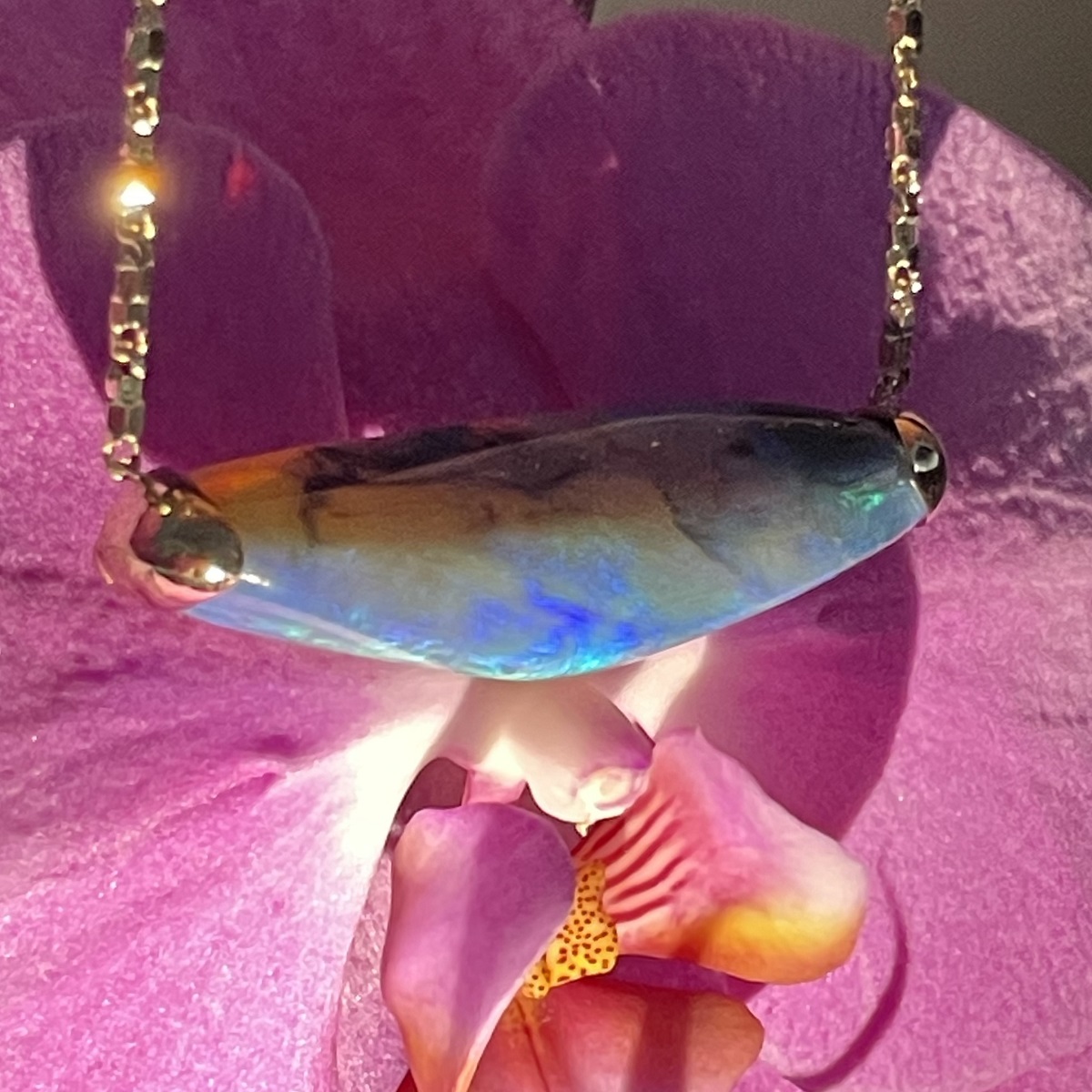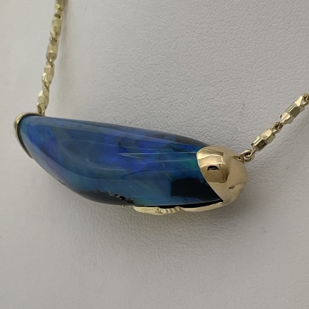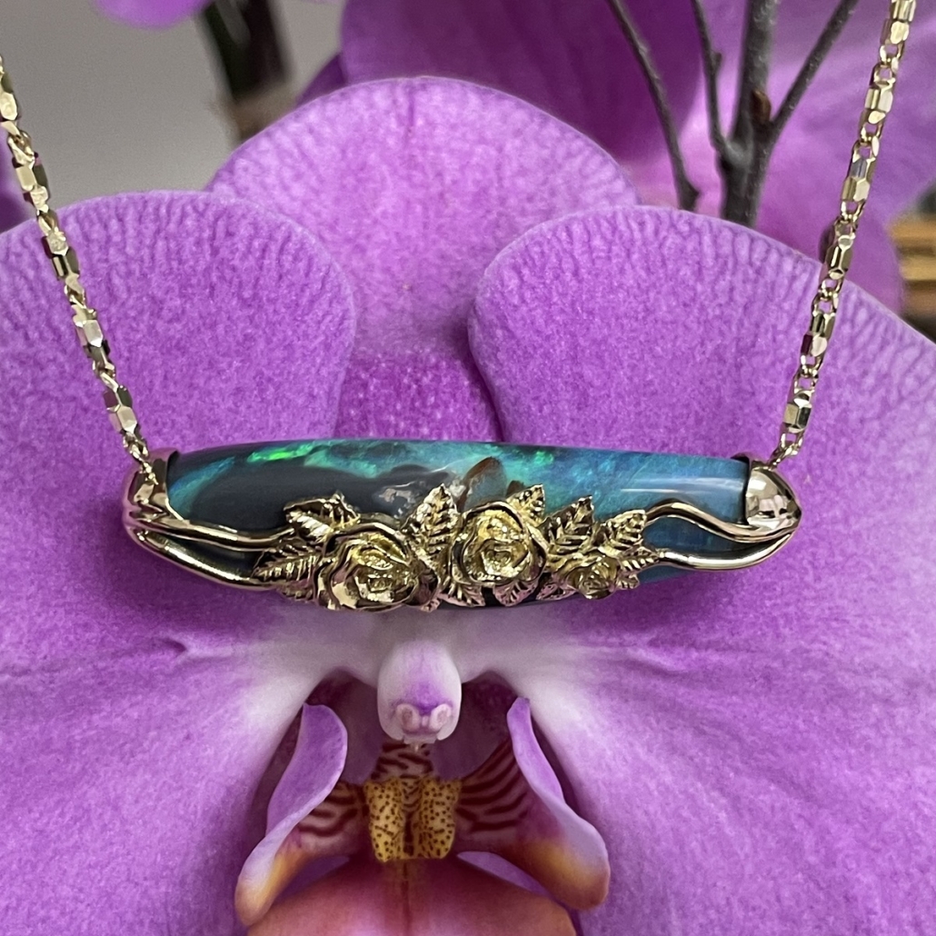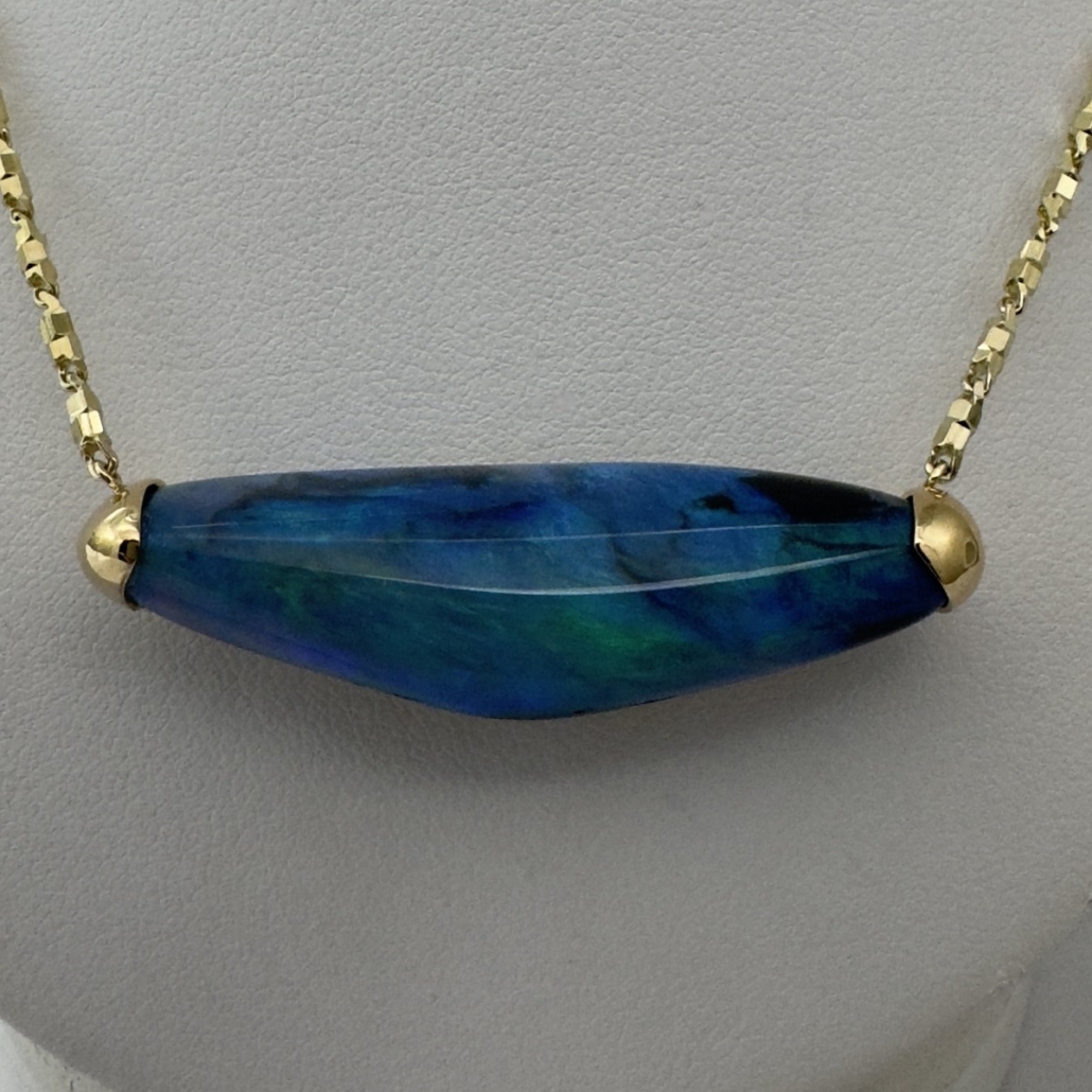 Tags 18k Yellow, Abstract, Australian, Bezel Set, Black Opal, Desire, Elegant, Fancy Color, Floral, Handcrafted, link chain, Multi-Color, Necklace, One-Of-A-Kind, Opal, solitaire